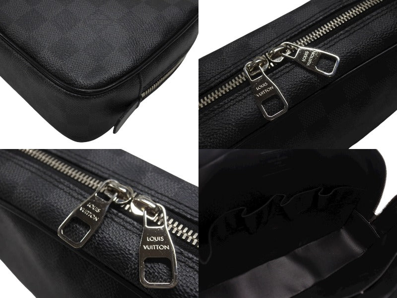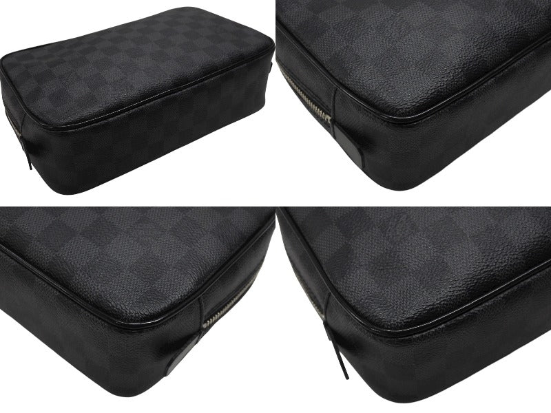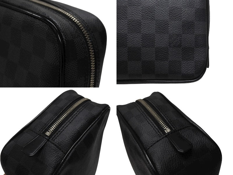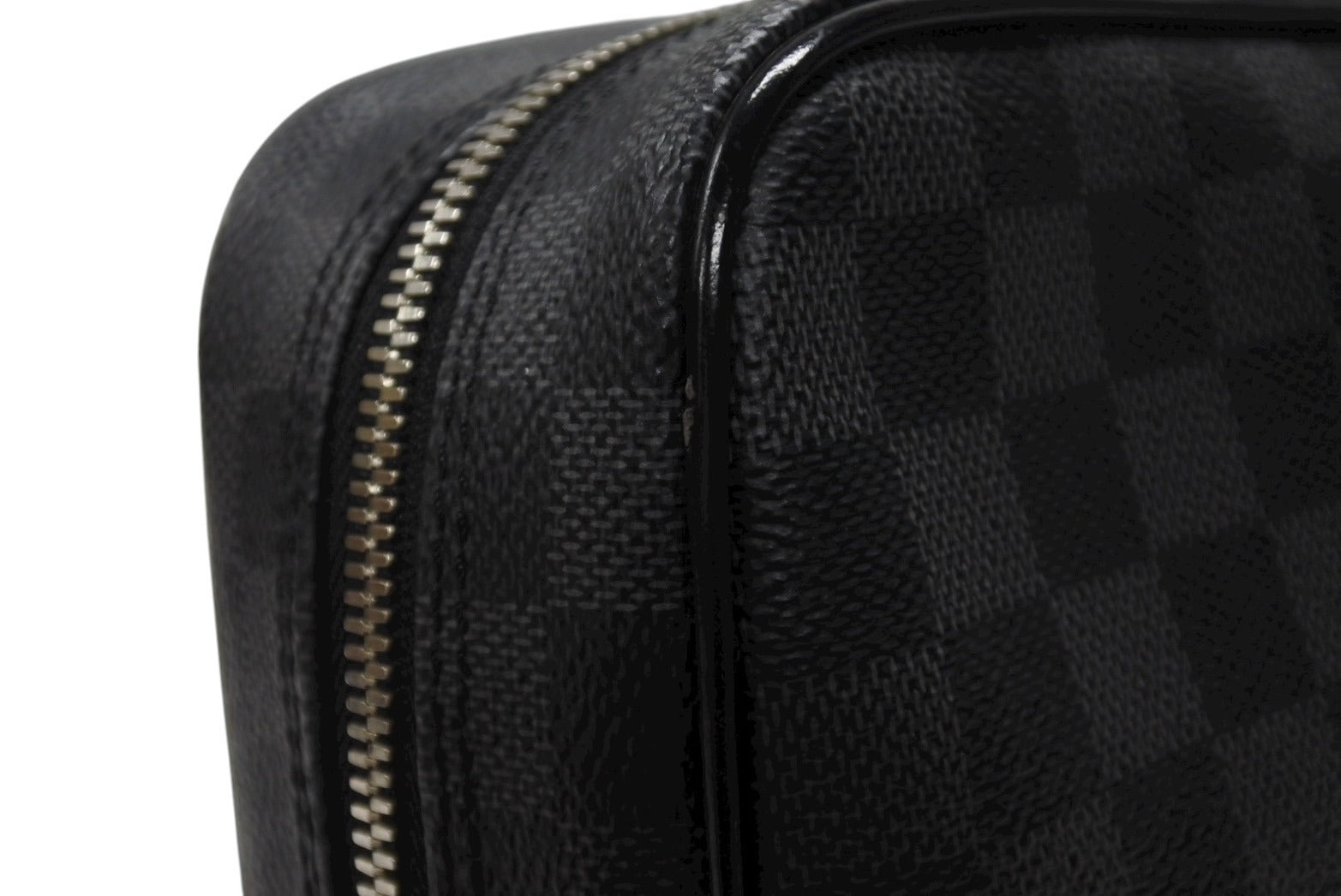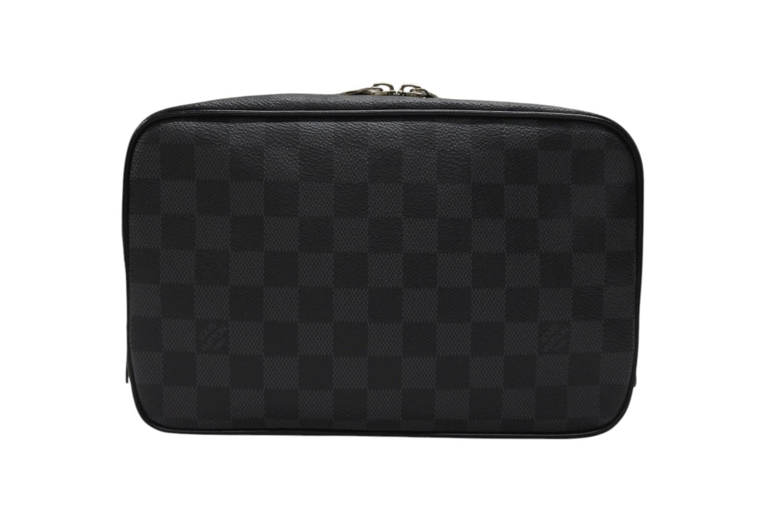 現代のトラベラーにおすすめの、小旅行などにもぴったりの機能的なポーチ「トゥルース・トワレ GM」。耐久性のあるダミエ・グラフィット キャンバスで仕上げました。