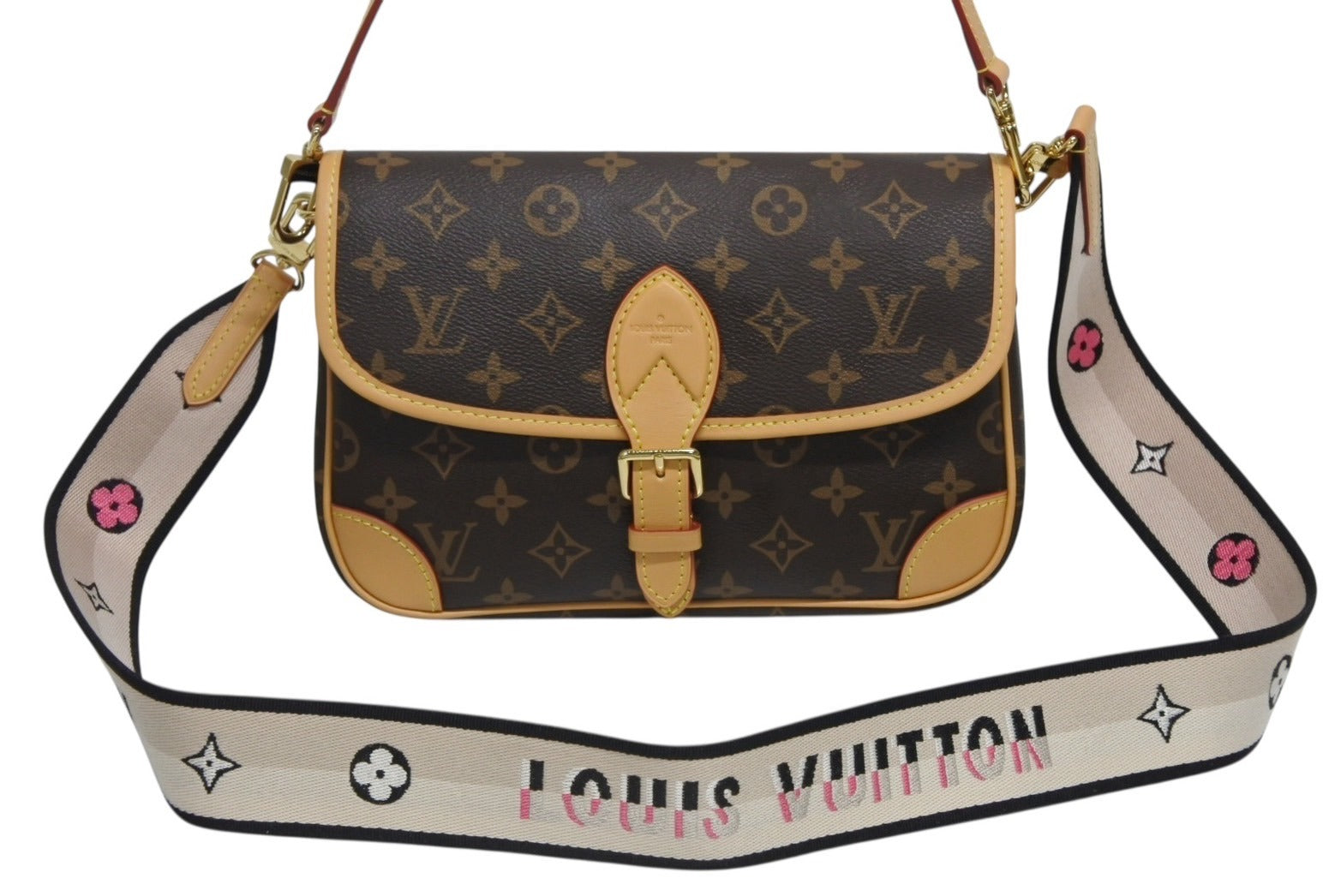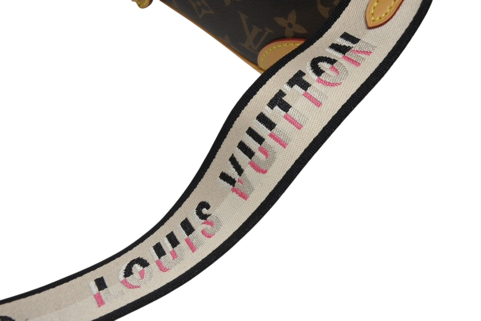 エクスクルーシブな幅広のジャカード織りのストラップの片面には大胆な「Louis Vuitton」シグネチャーが、もう片面にはさりげないモノグラム・フラワー モチーフがあしらわれています。