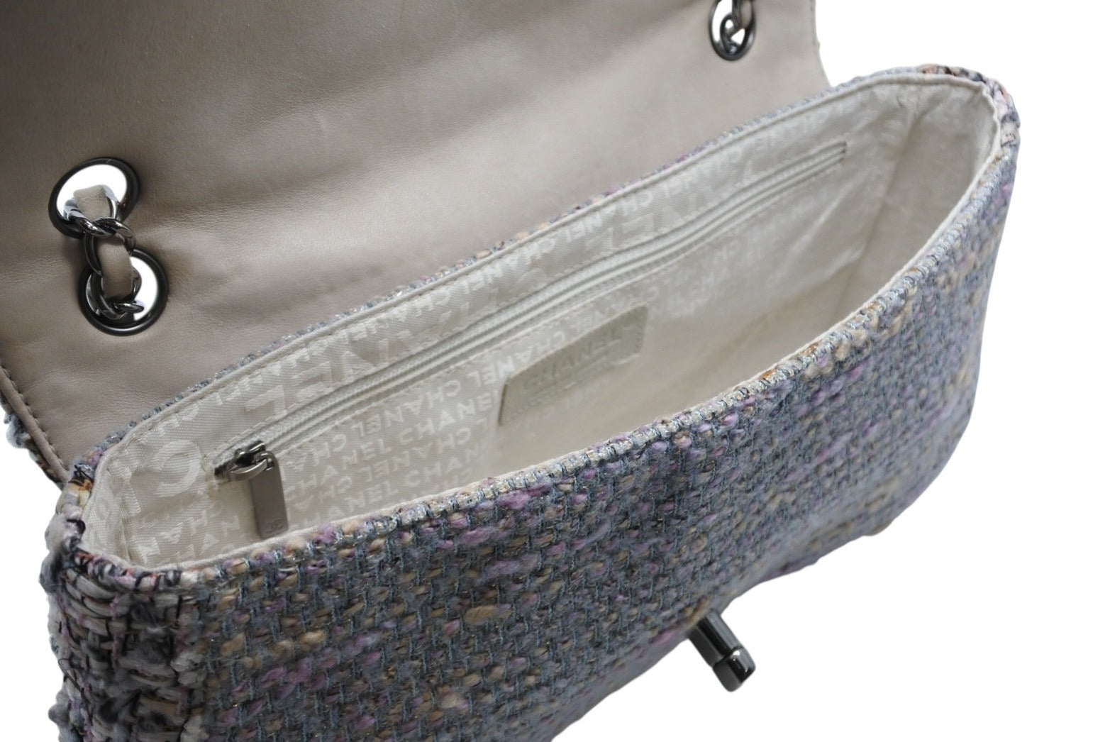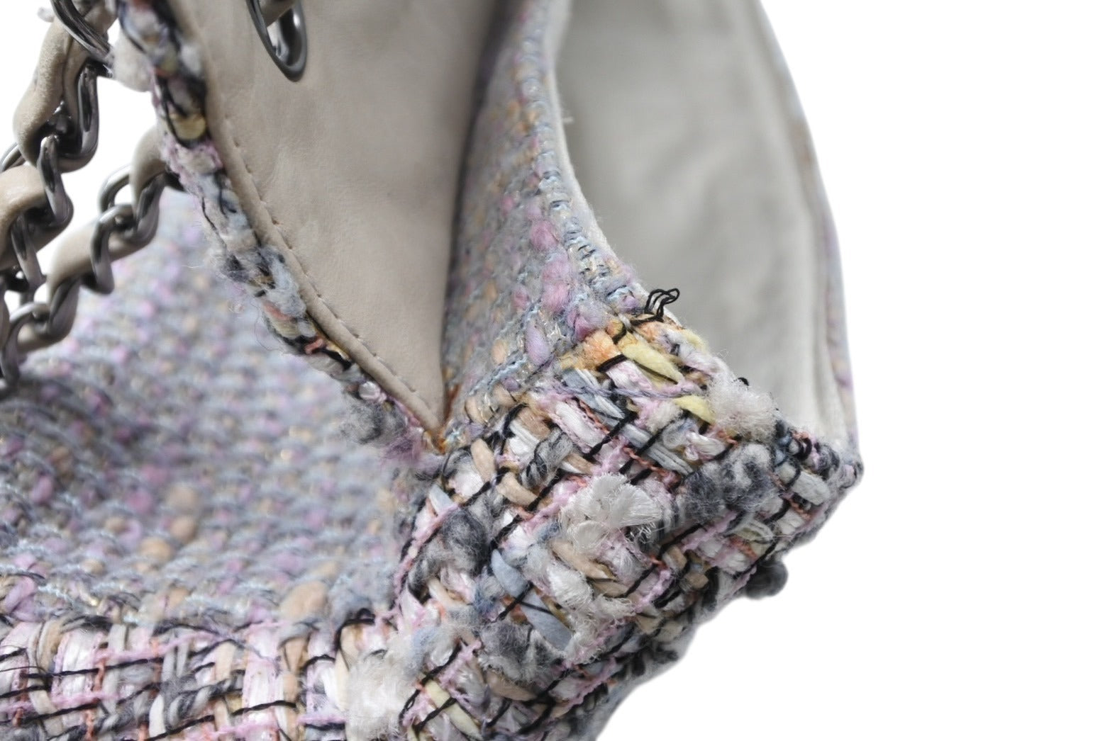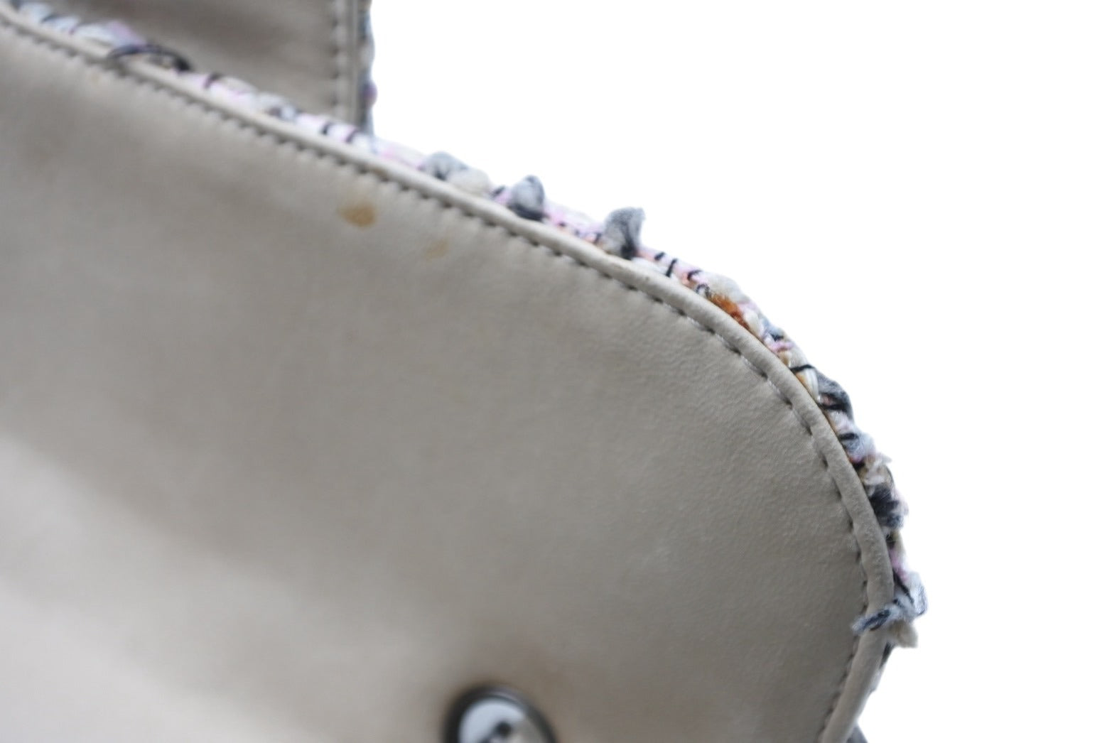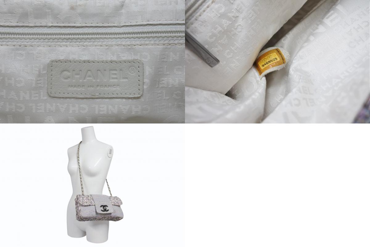 ツイード素材のチェーンショルダーバッグです。可愛らしいカラーリングのツイードやデカココマーク金具など、シャネルの魅力溢れるアイテムです。