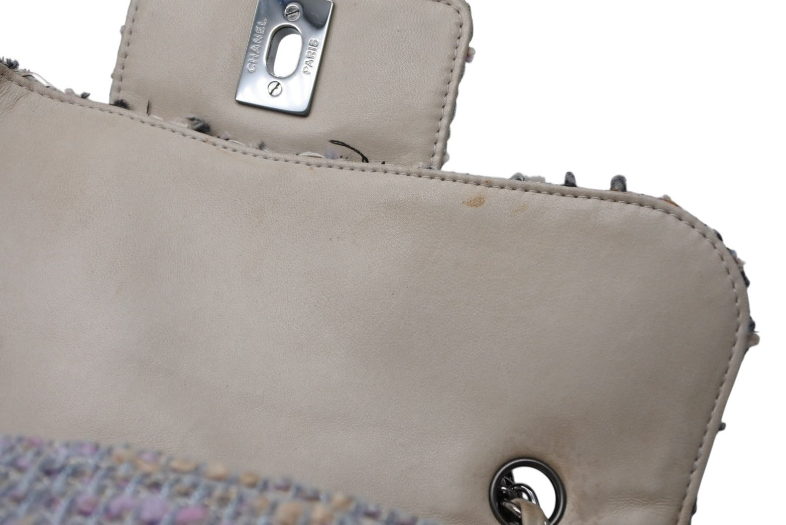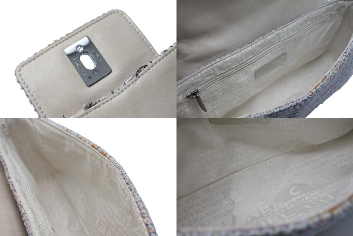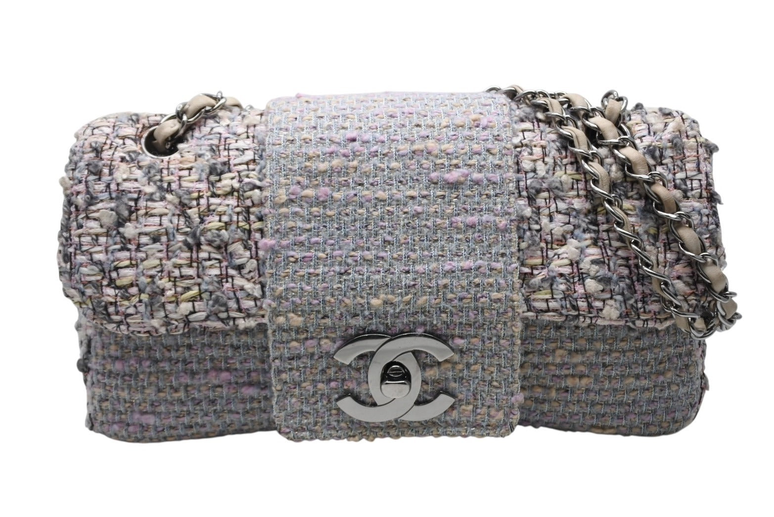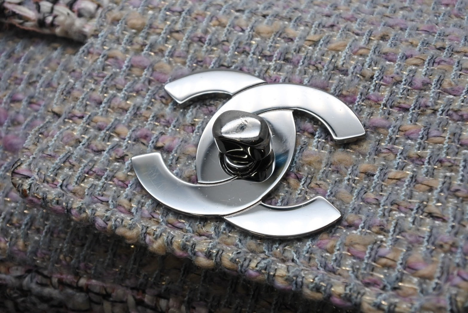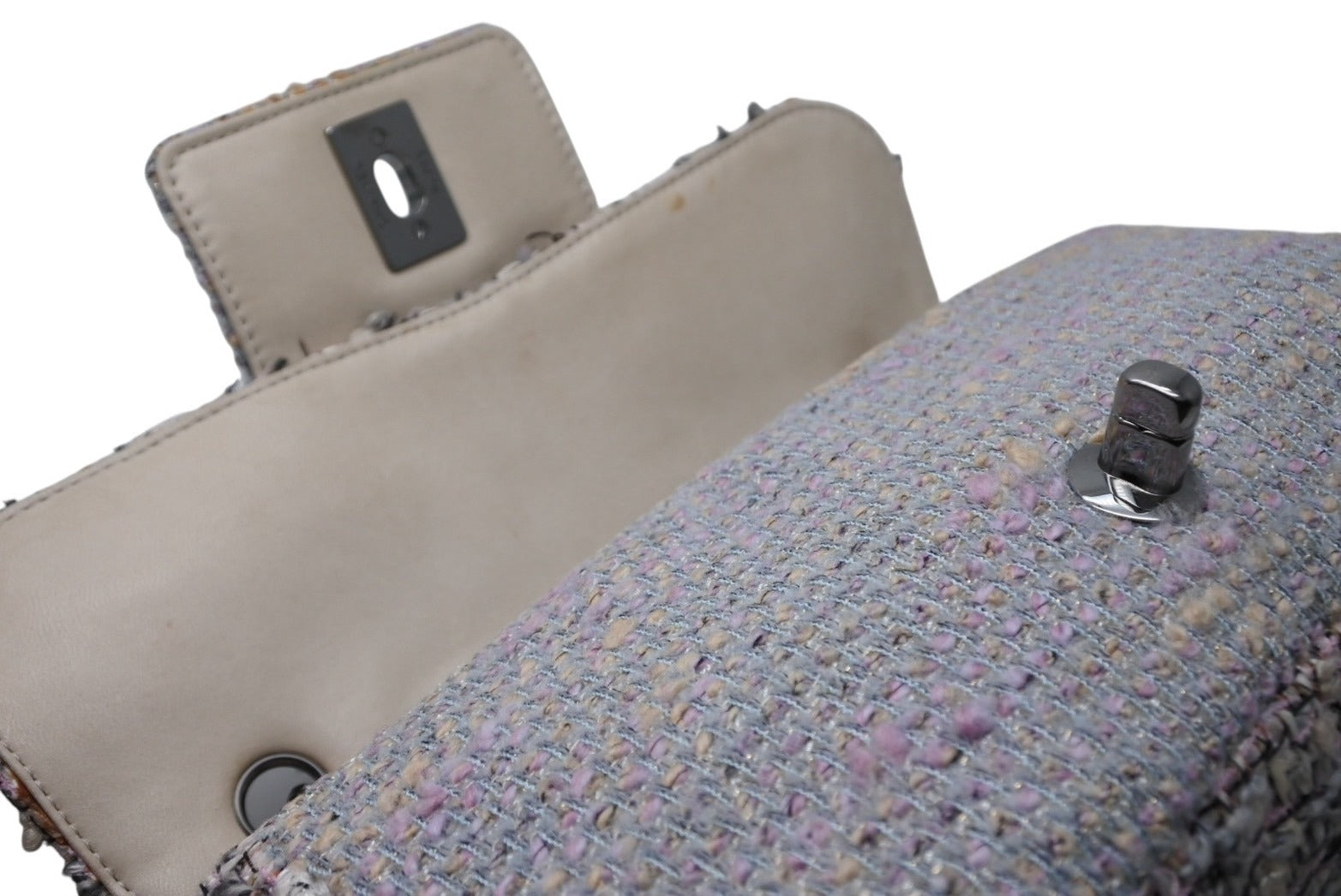 ツイード素材のチェーンショルダーバッグです。可愛らしいカラーリングのツイードやデカココマーク金具など、シャネルの魅力溢れるアイテムです。
