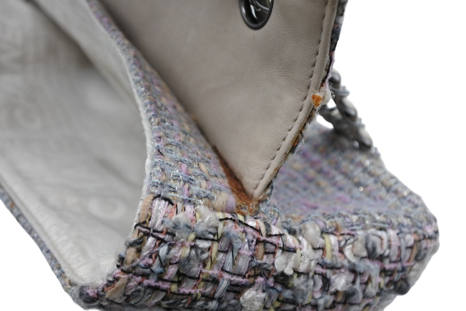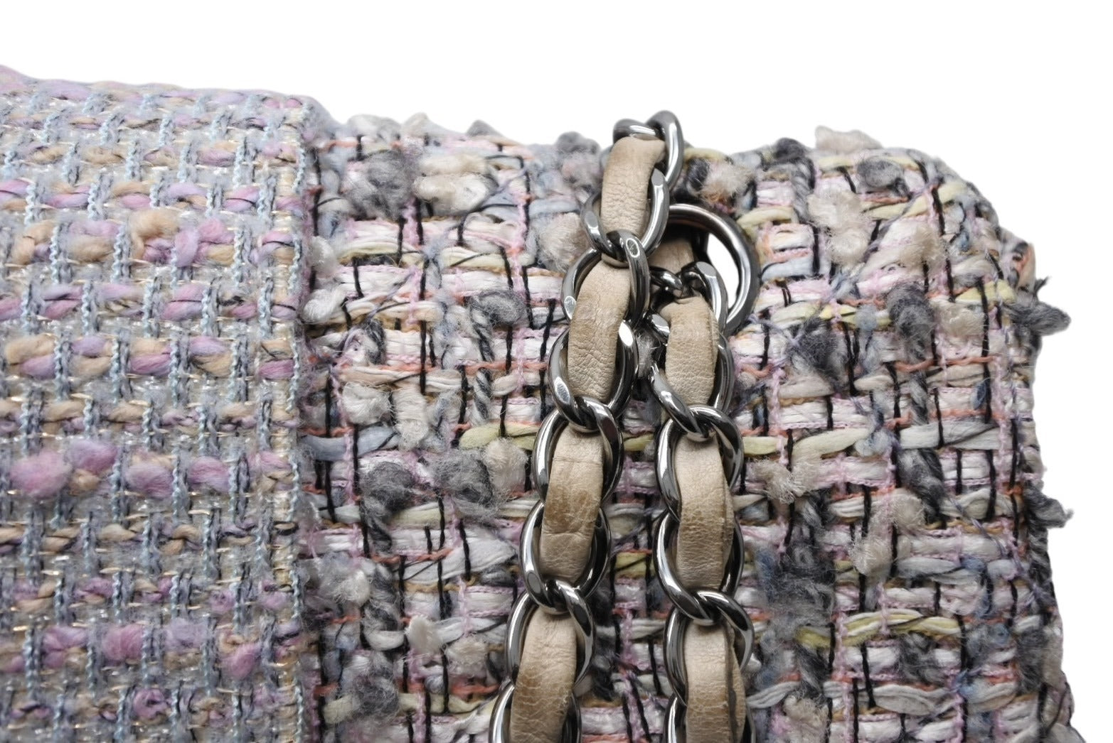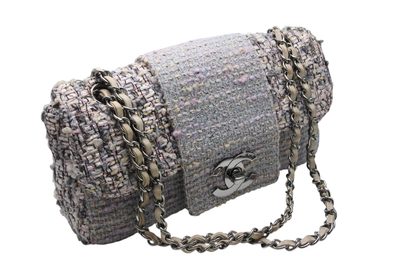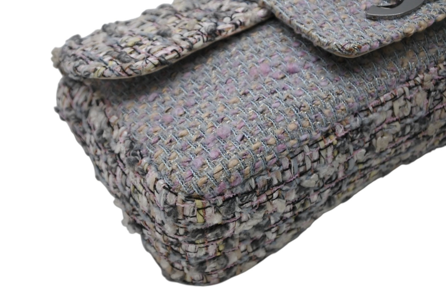 ツイード素材のチェーンショルダーバッグです。可愛らしいカラーリングのツイードやデカココマーク金具など、シャネルの魅力溢れるアイテムです。