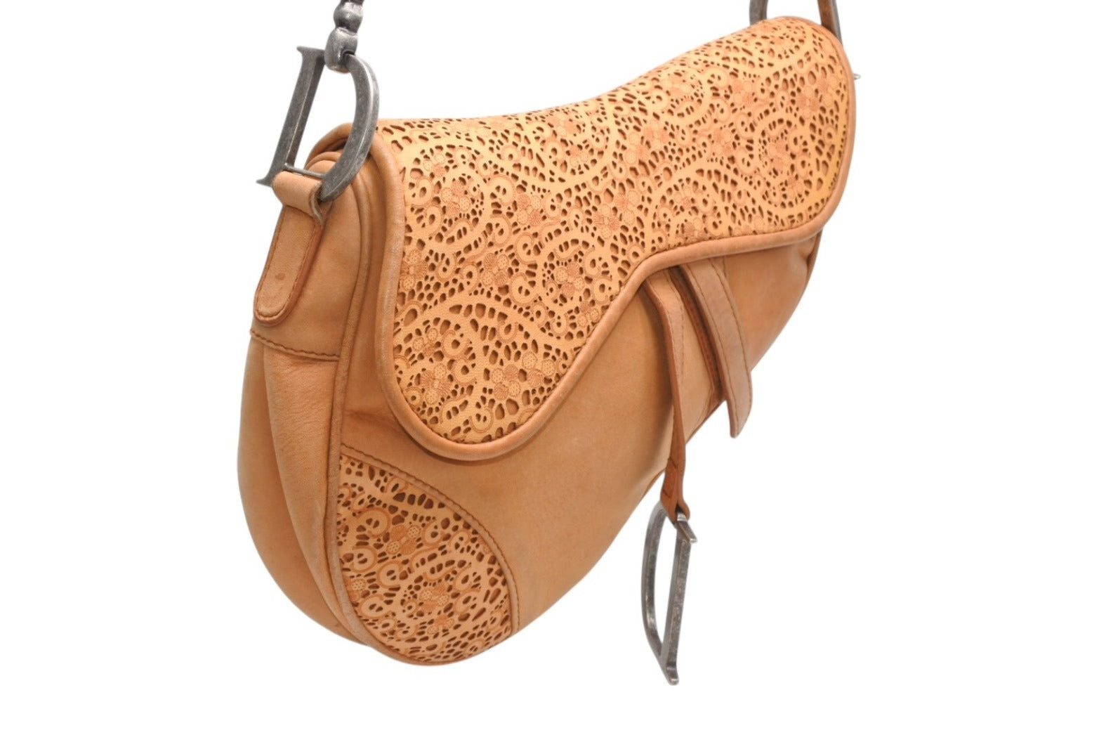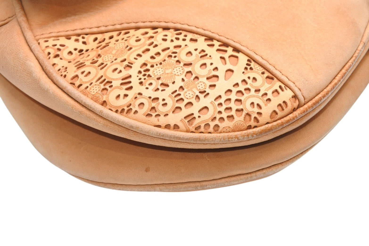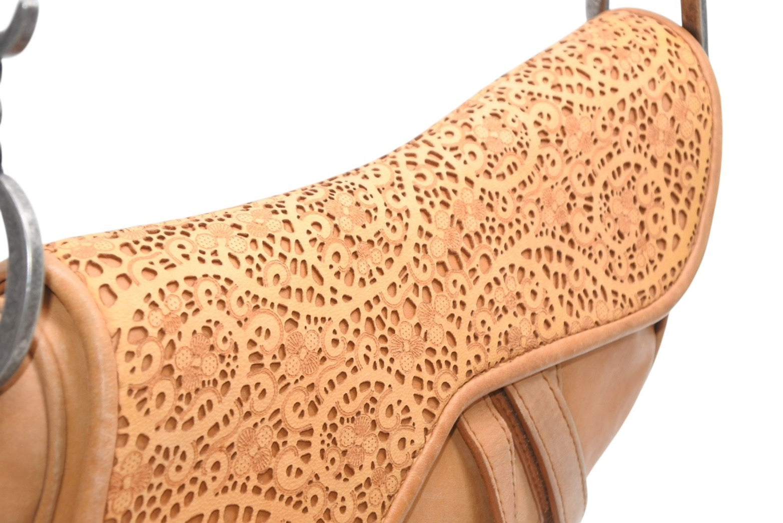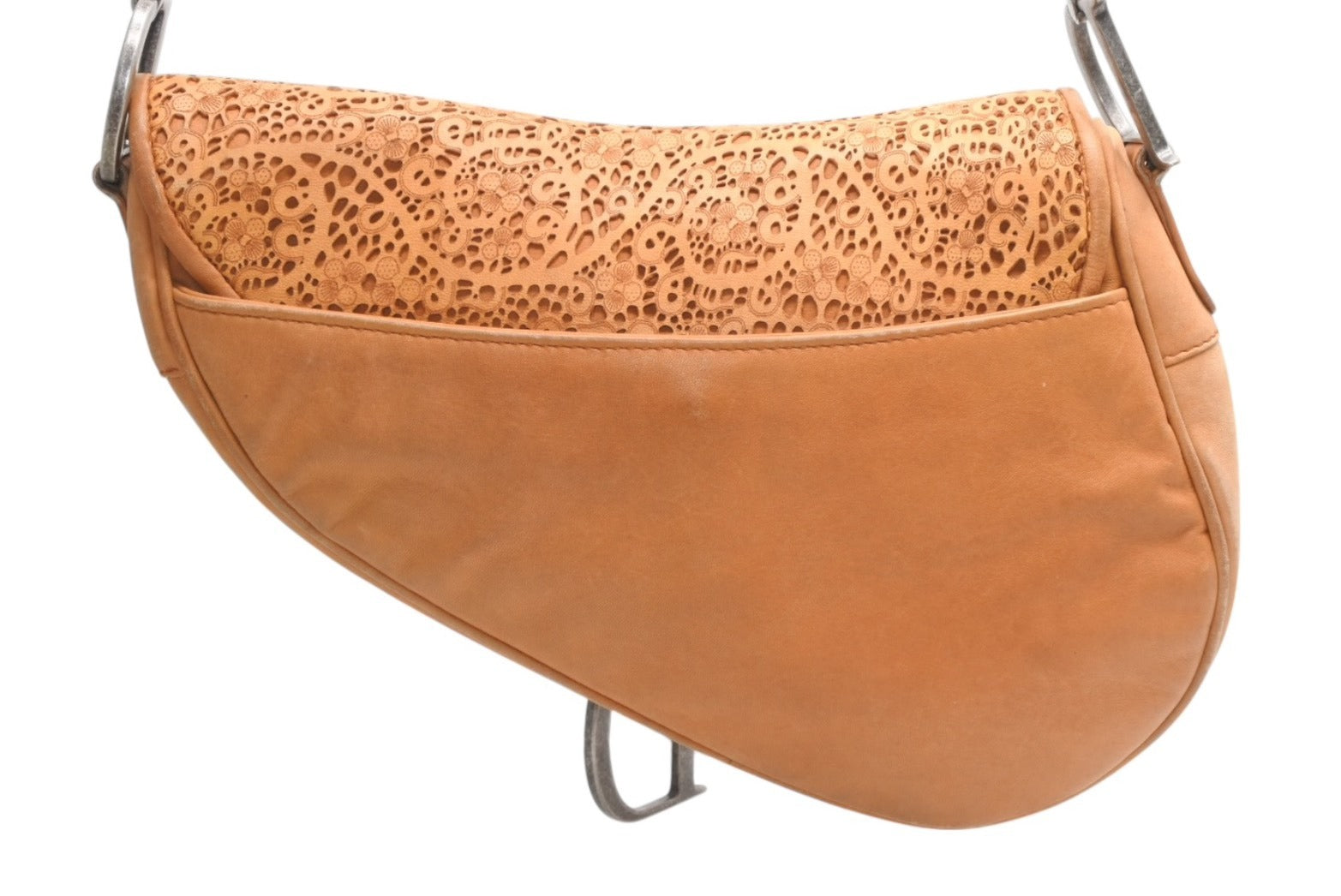 レザーのレースデザインがインパクトのあるサドルバッグです。