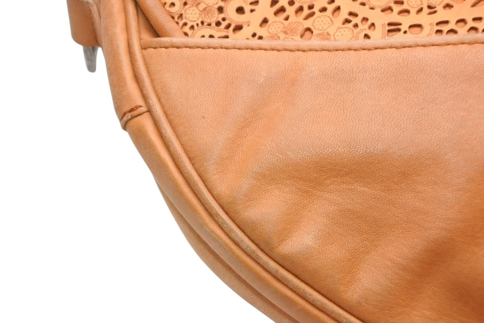 表面にスレ、薄汚れあり。金具パーツにスレ、小傷あり。開口部、レザーストラップにコバ割れあり。パイピングにスレあり。その他使用感の少ない状態です。