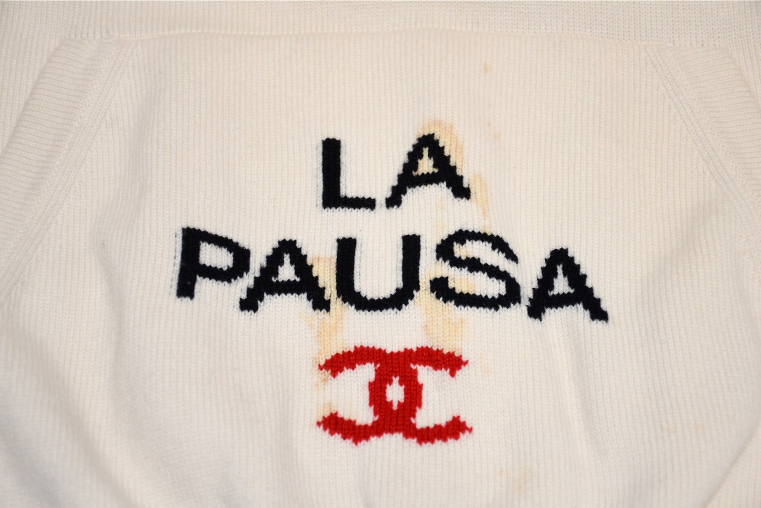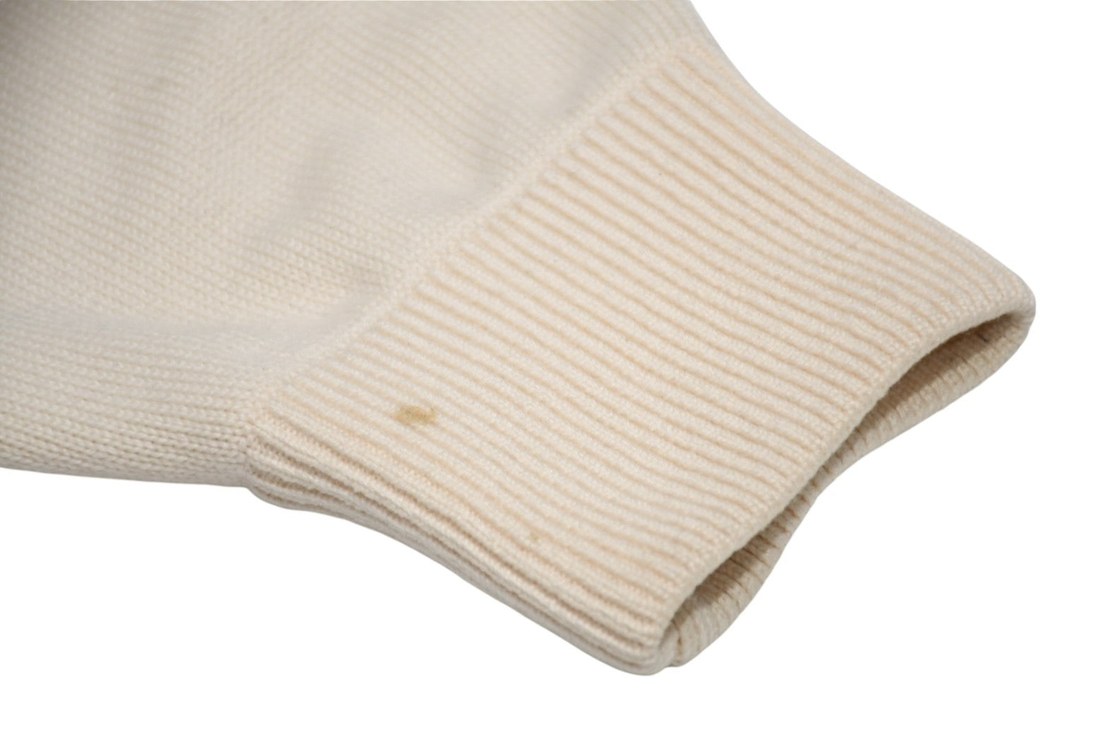 フロントにシミ、汚れあり。袖にシミ、毛玉あり。全体的に毛羽立ちあり。中古品としてご着用いただける状態です。