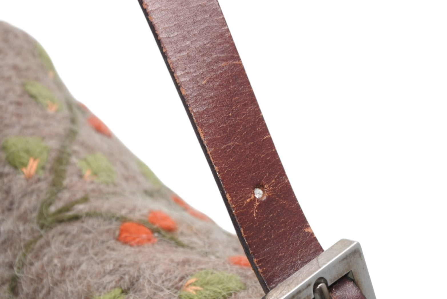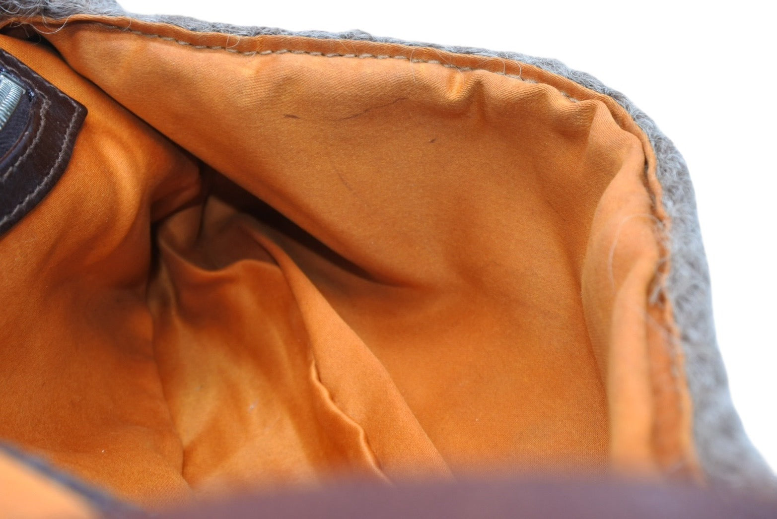 表面に毛羽立ちあり。金具パーツにスレ、小傷あり。ショルダーストラップにスレ、シワ、歪みあり。開口部レザー にスレ、シワあり。表面に少々汚れあり。内側にスレ、ペン跡、汚れあり。その他使用感の少ない状態です。