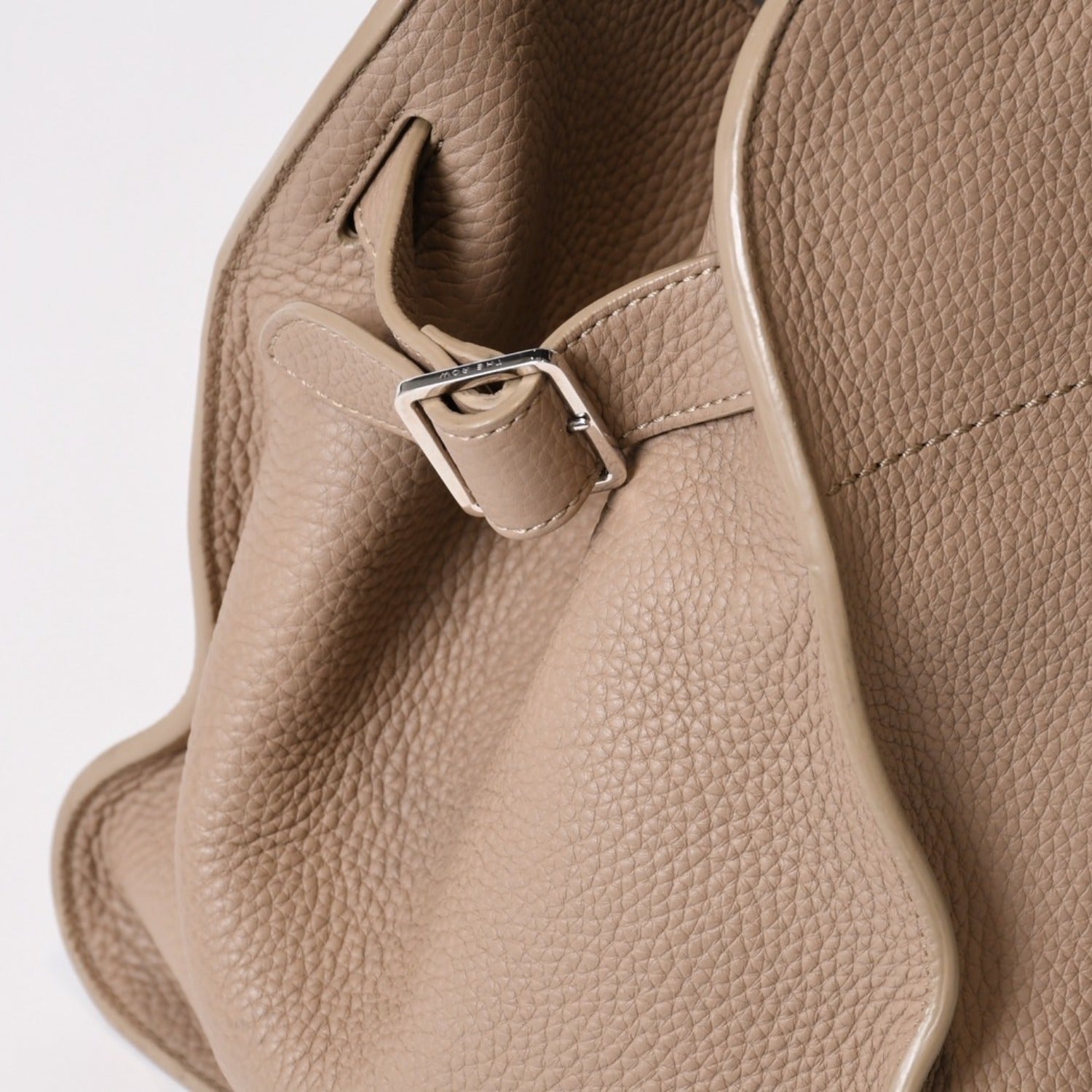 マットなグレイン仕上げのカーフスキン製のソフトな構造のトップハンドル付きのバッグで、ベルト付きのマチのあるサイドパネル、内側のトグル開閉が特徴です。