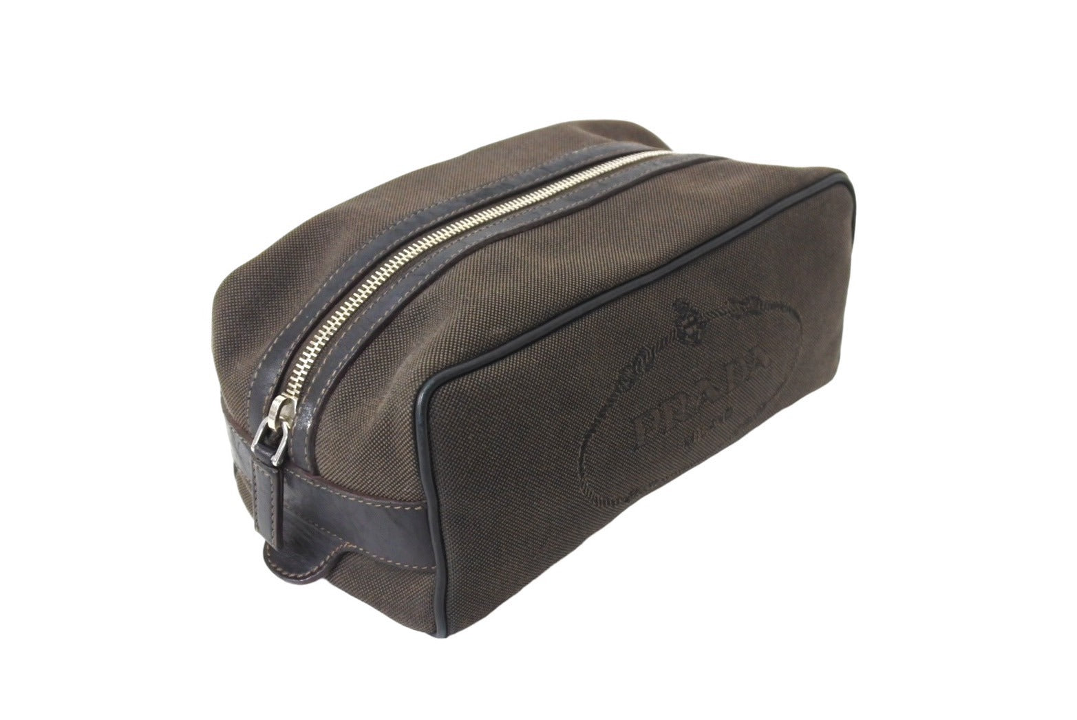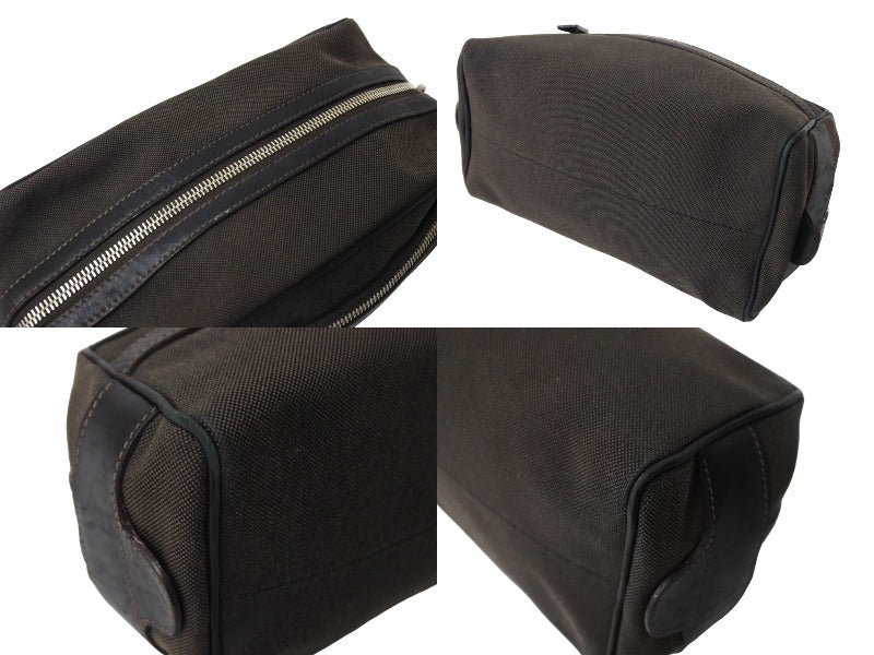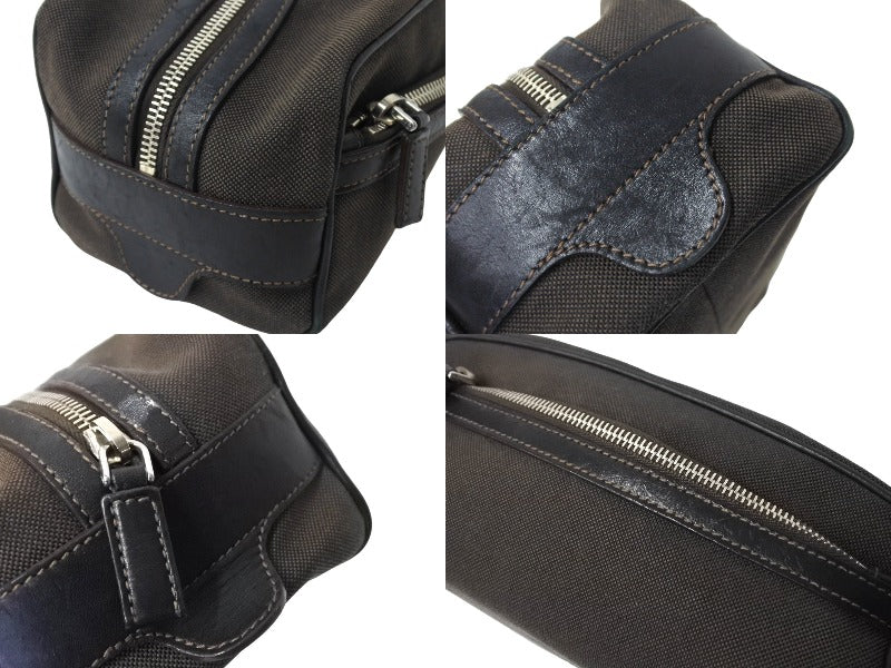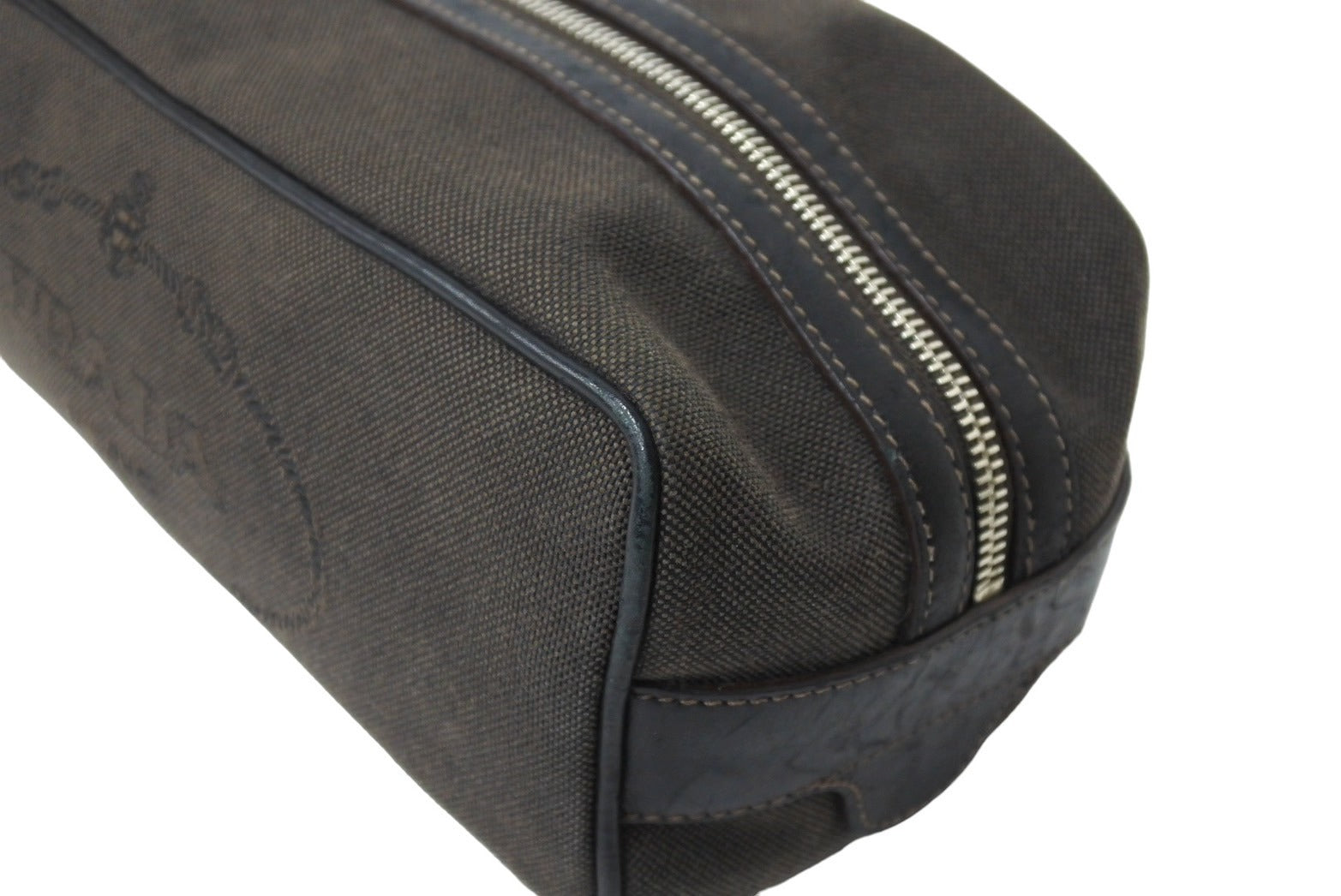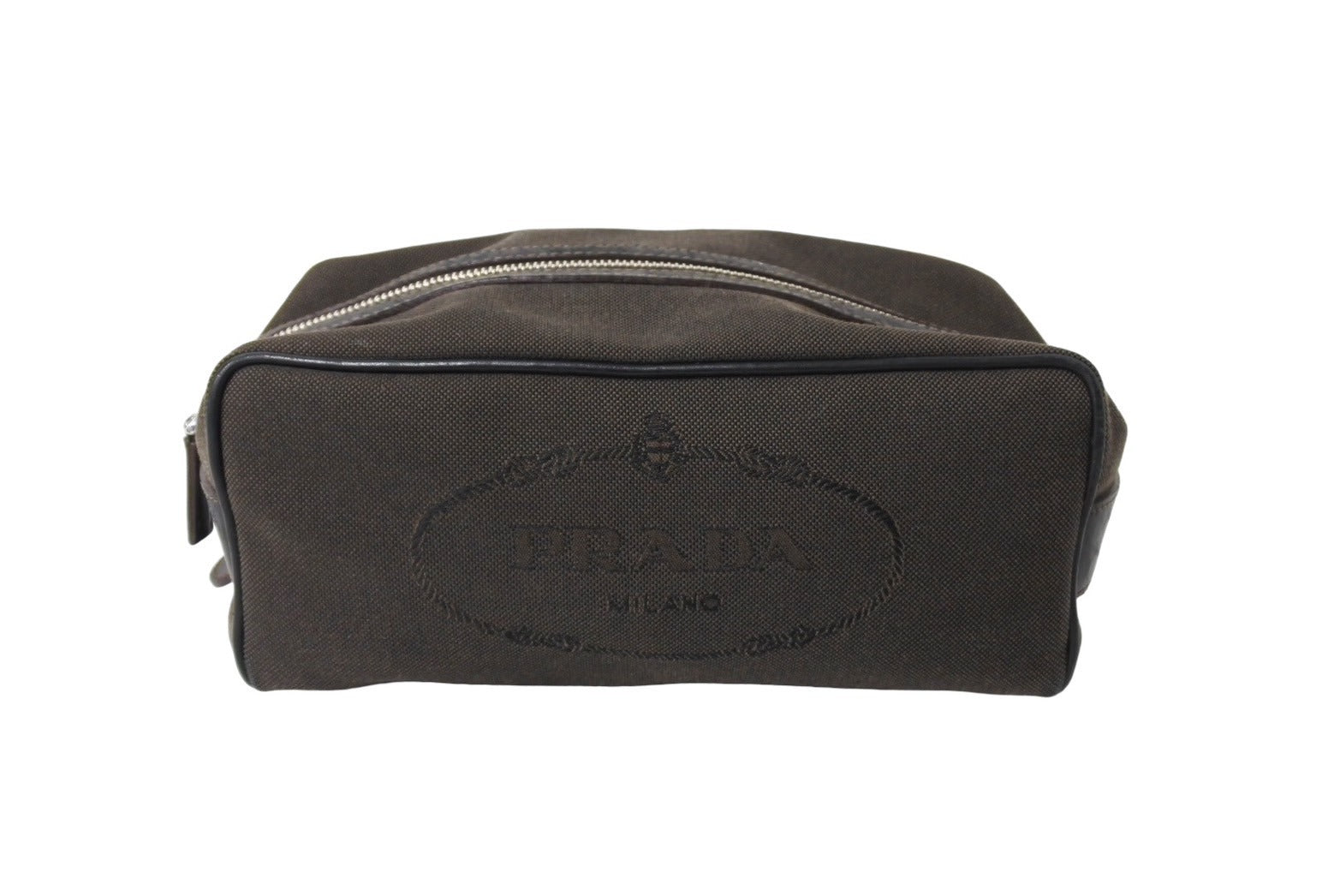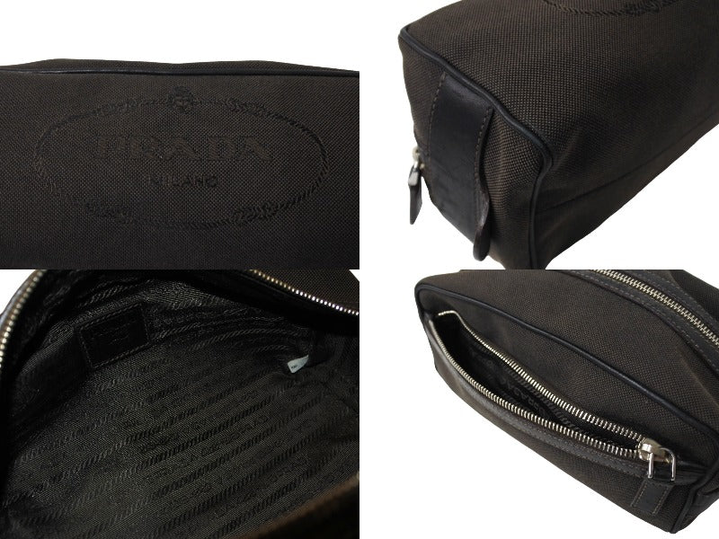 PRADA プラダ ポーチ 小物入れ クラッチバッグ ジャガード ロゴ コットンキャンバス レザー ブラウン シルバー金具 美品 中古 65552