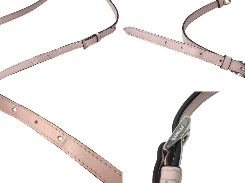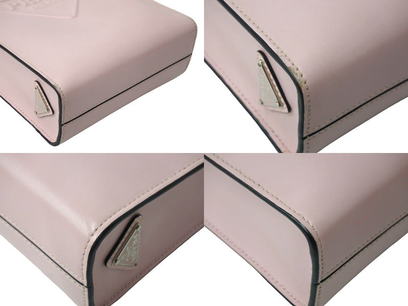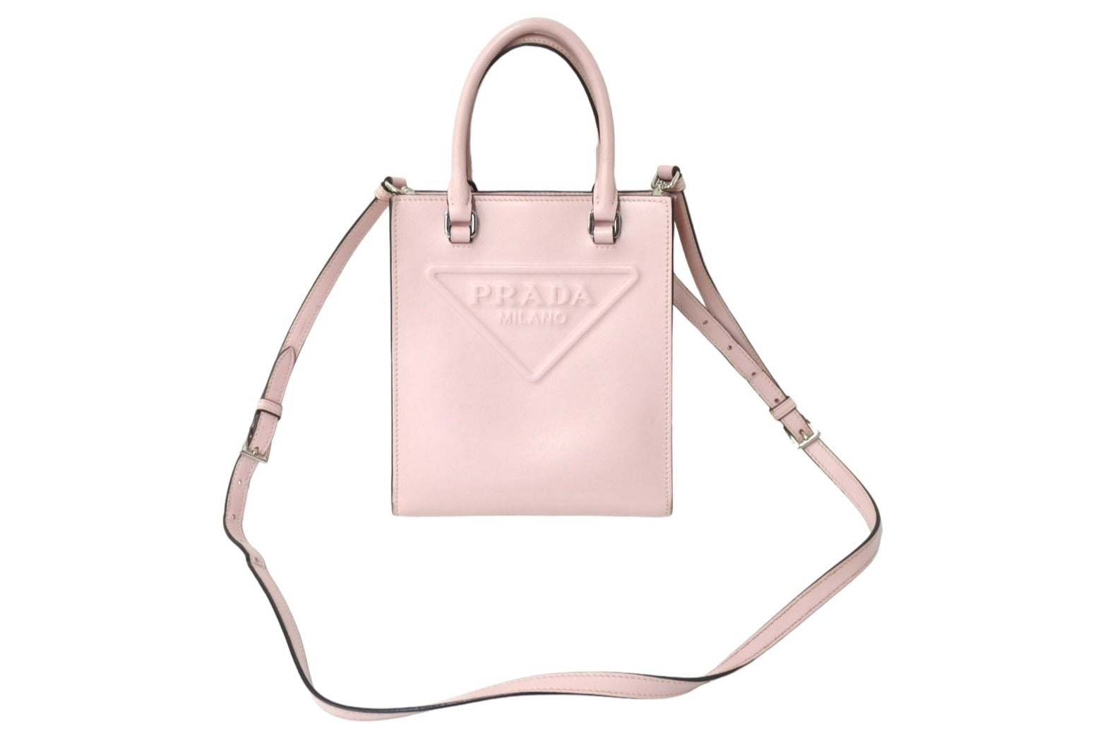 エレガントで洗練されたデザインのレザーのバッグ。エンボス加工のレタリングロゴとプラダのアイコニックなエナメルトライアングルがあしらわれたお洒落なデザイン。