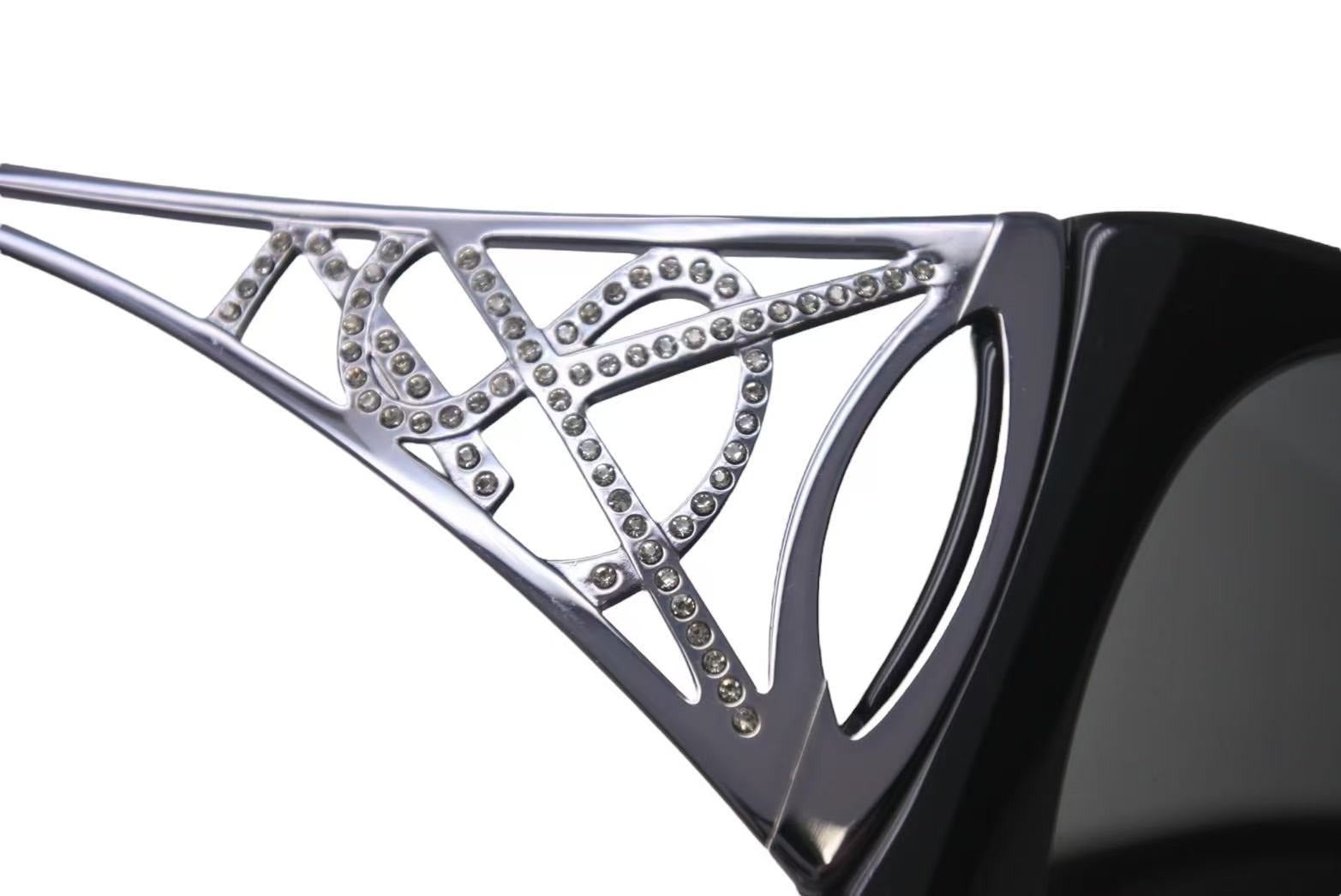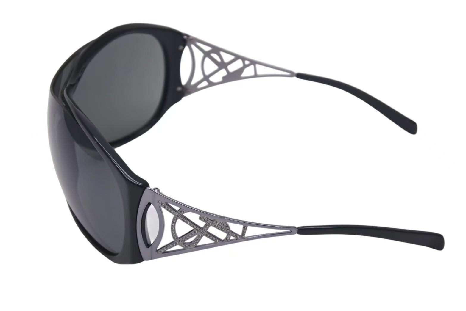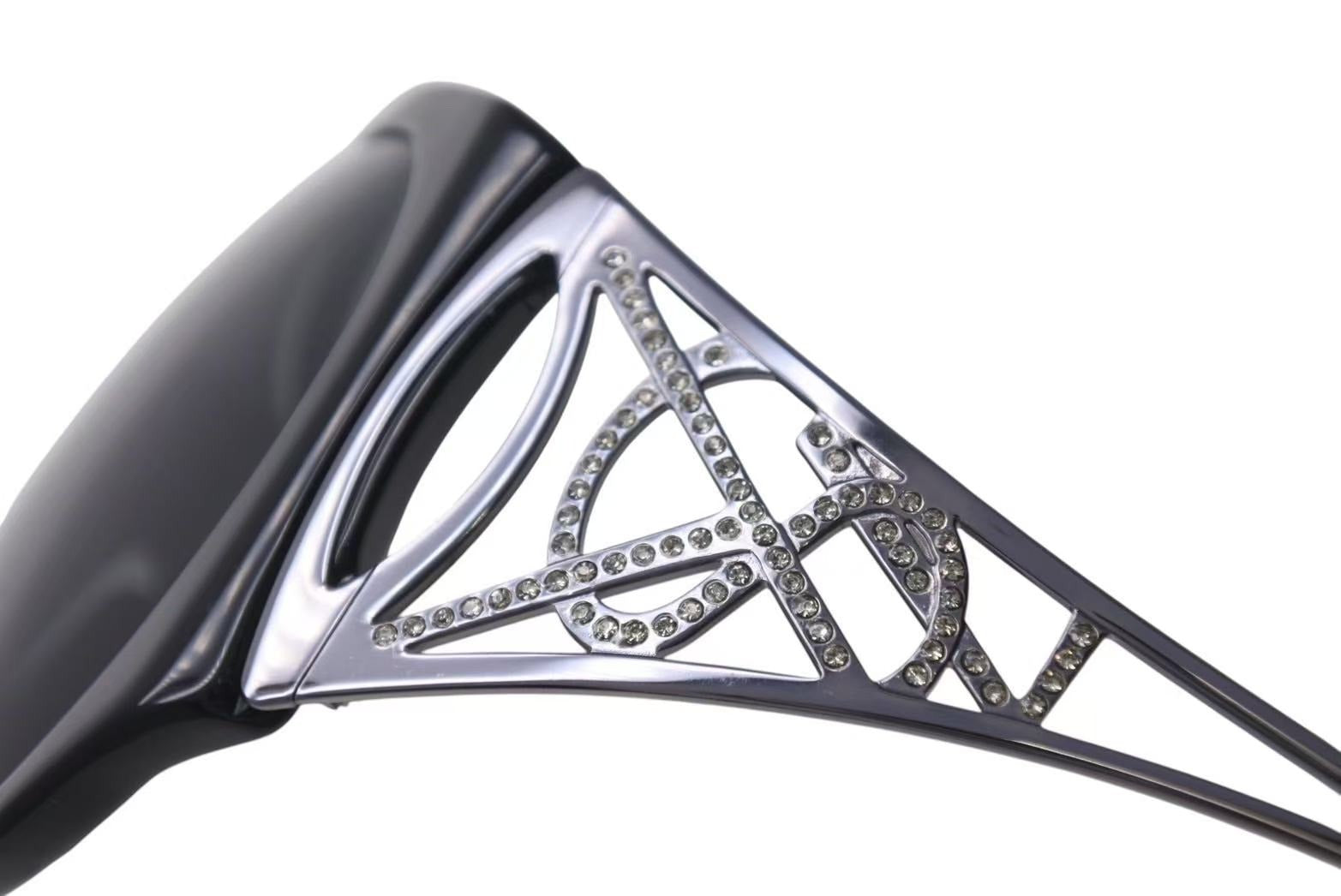 テンプルに施されたラインストーン付きのロゴが目を惹くアイテムです。