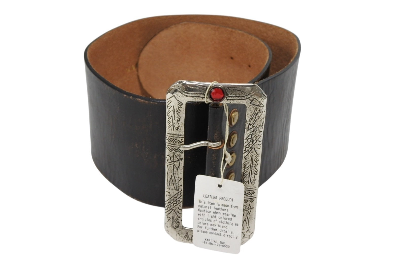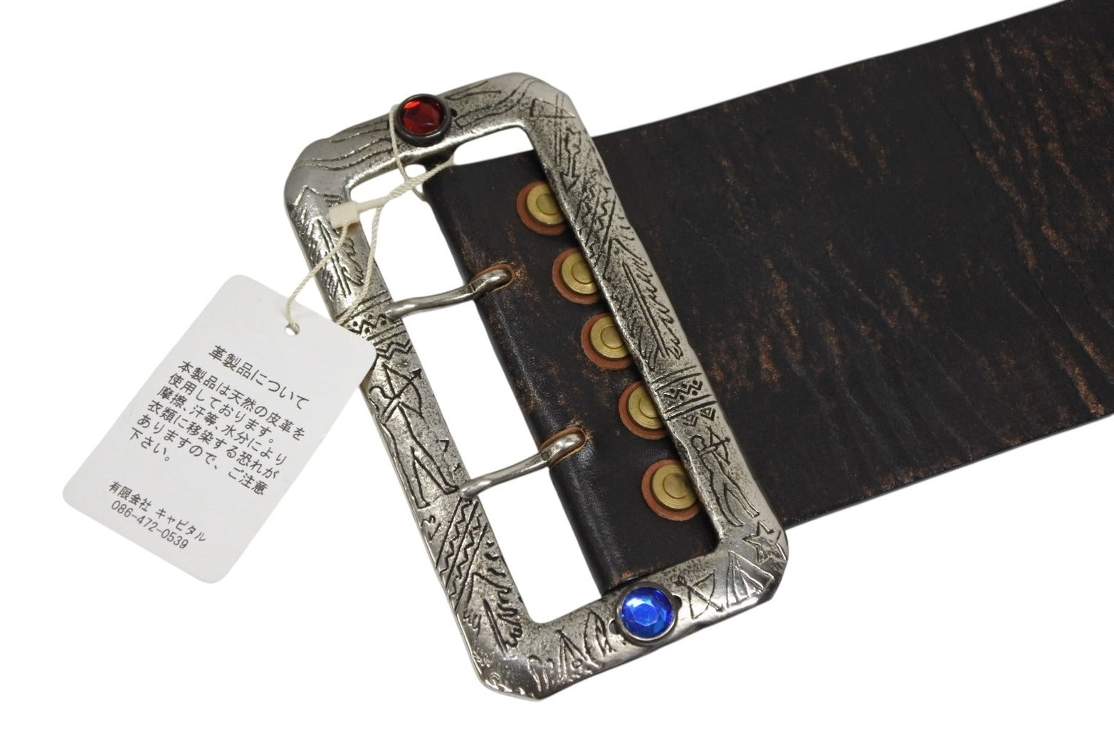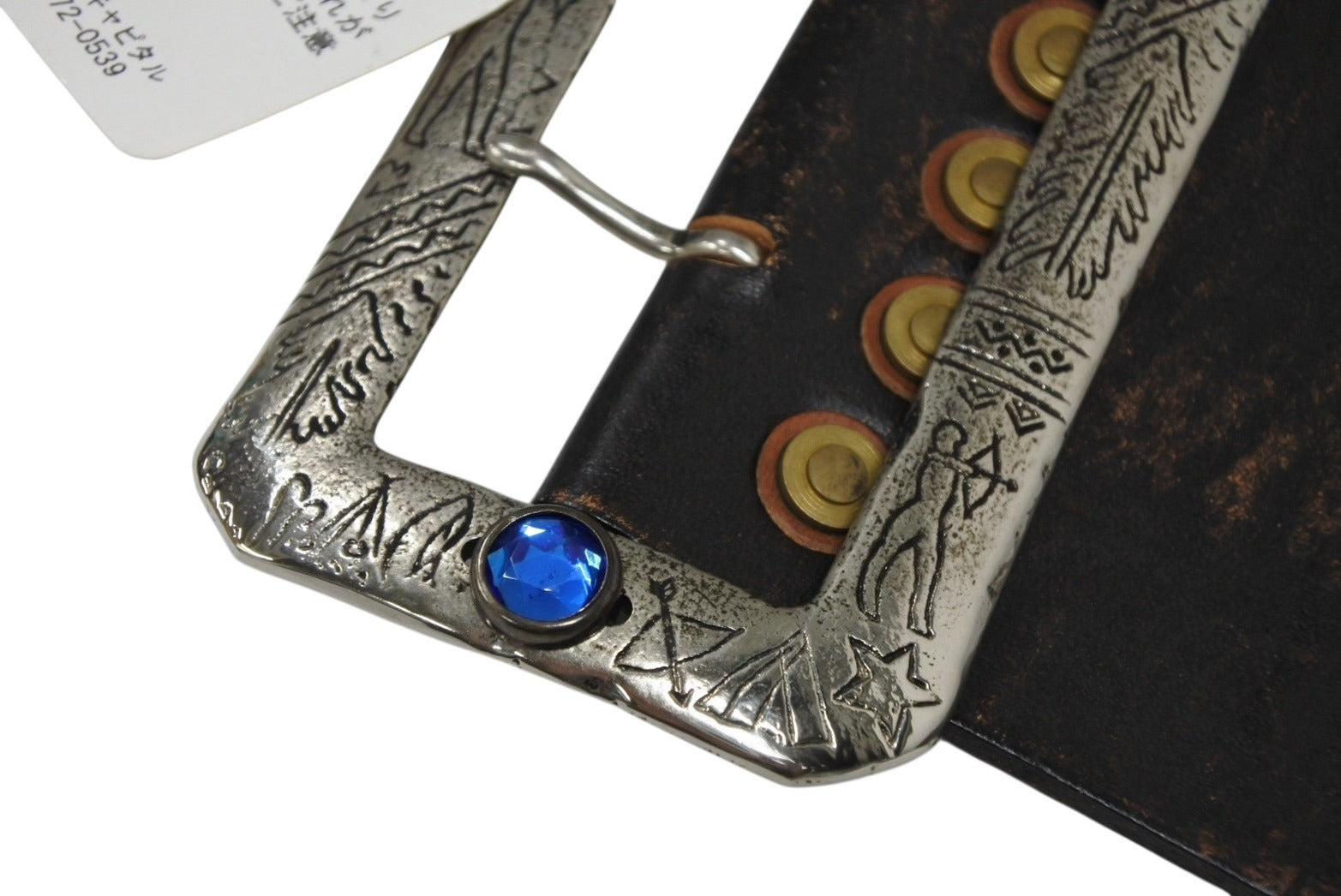ヴィンテージのような風合いのオイルレザーにカラフルなスタッズとシルバー金具の組み合わせがかっこいいレザーベルトです。