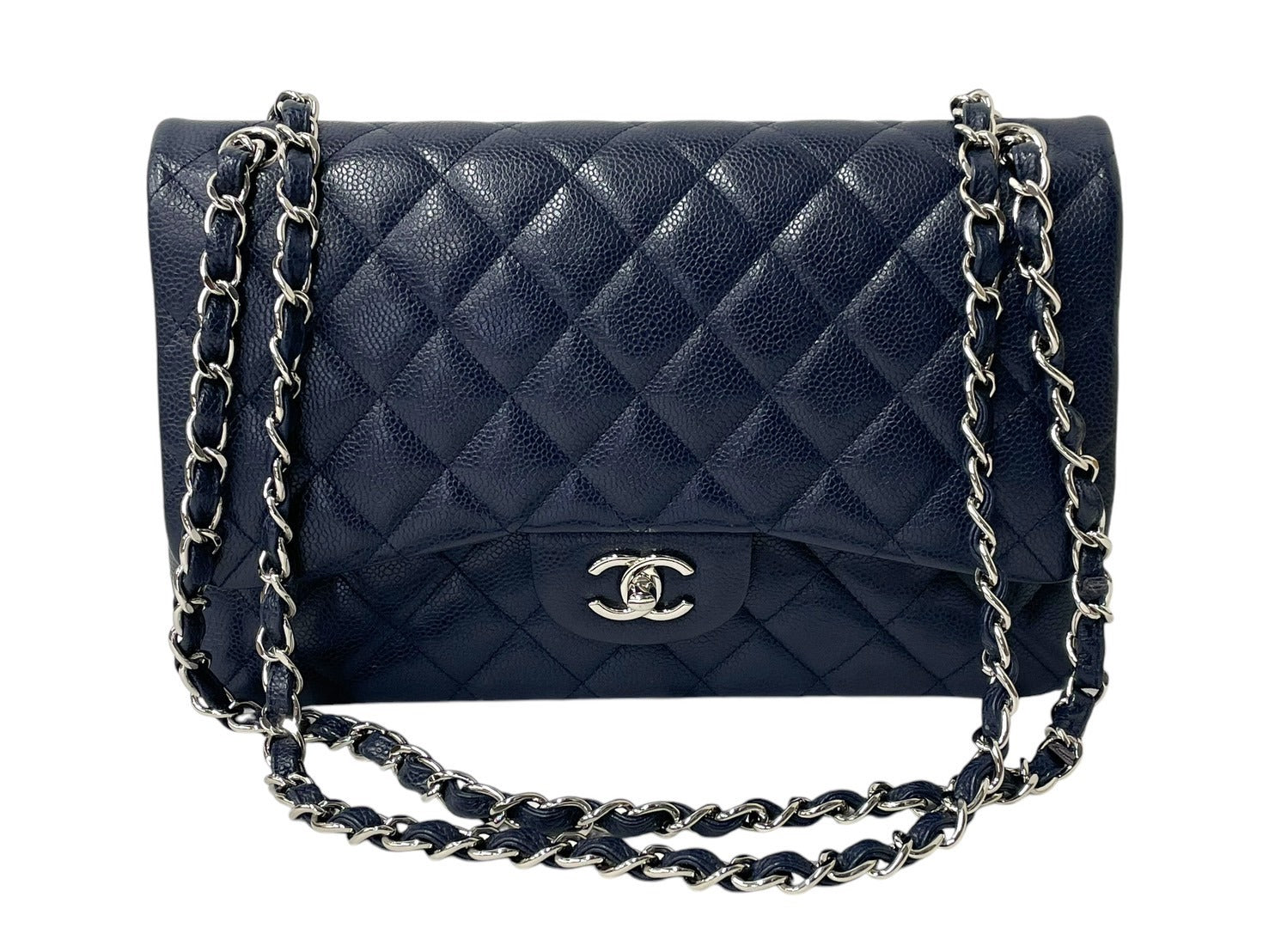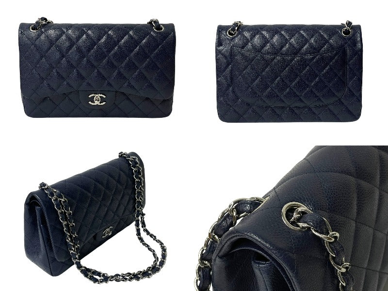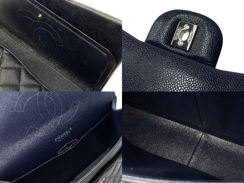極美品 CHANEL シャネル チェーンショルダーバッグ キャビアスキン マトラッセ30 Wフラップ ネイビー シルバー金具 19番台 中古 4c067661
