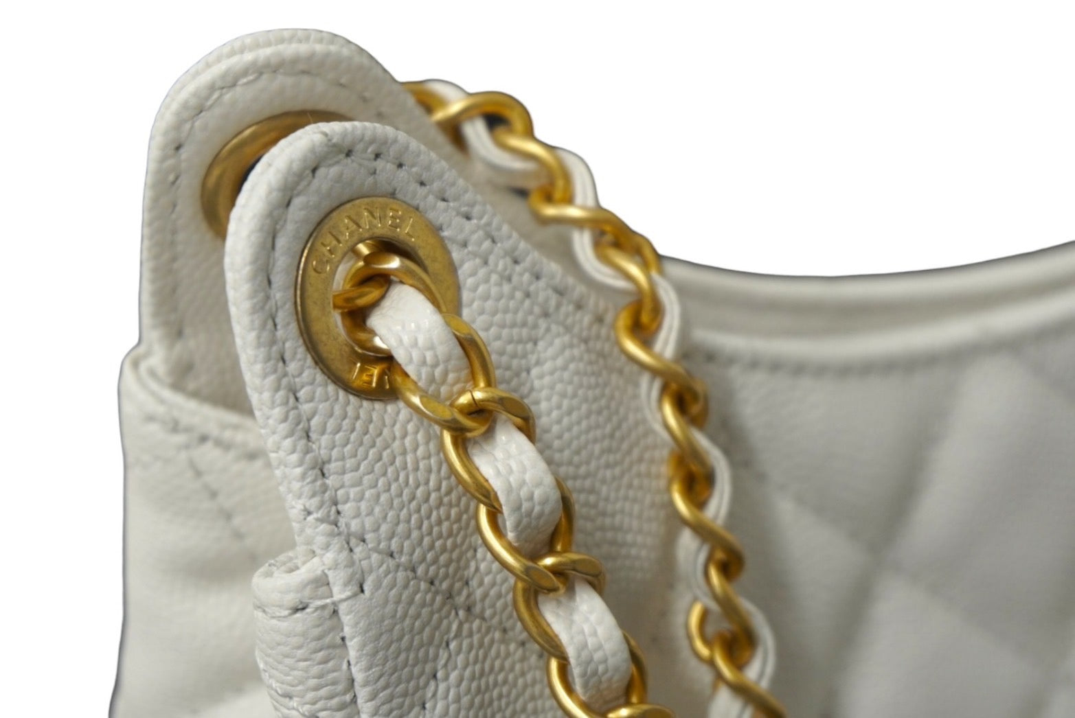 ホーボー型のチェーンショルダーで、ホワイトにゴールドカラーが高級感のあるアイテムです。
