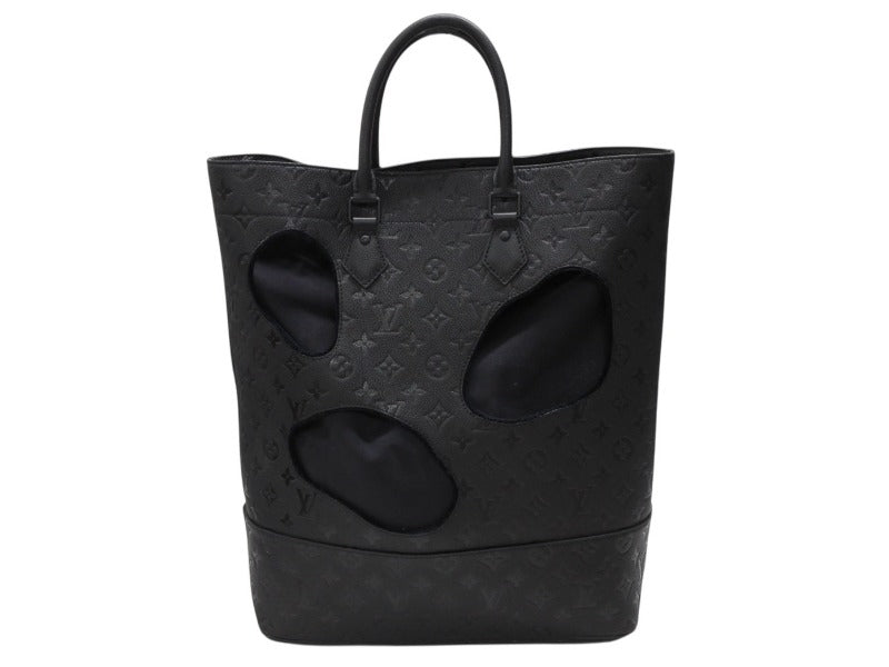 2014年当時のフォルムを生かしつつ、新たな限定モデルとして「バッグ ウィズ ホールズ」が登場。エンボス加工でモノグラム・パターンを施したブラックのグレインカウハイドレザーに大胆な穴を開け、内装には取外し可能なテキスタイル製ポーチを配した。