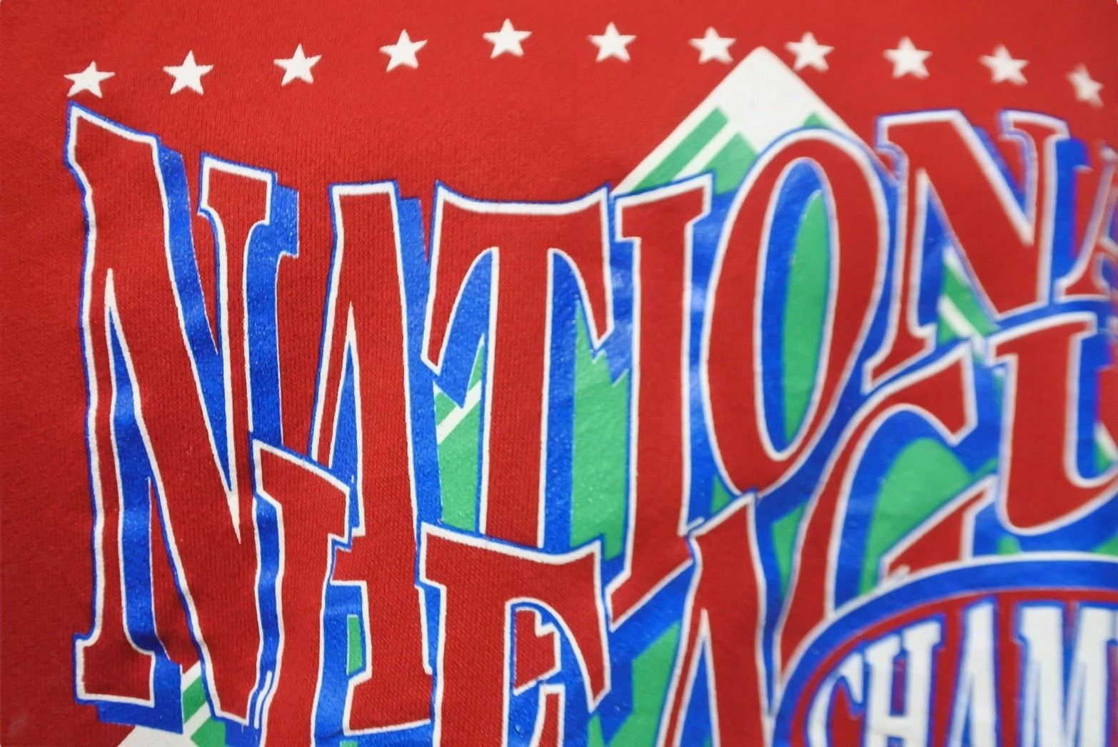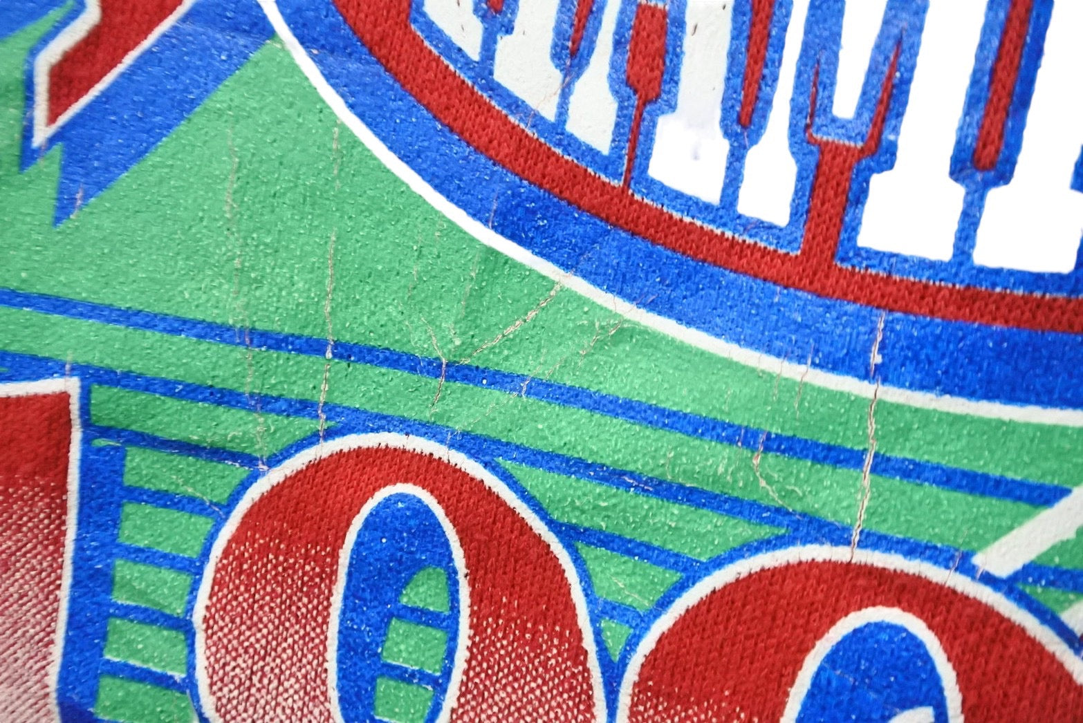 全体的にプリントひび割れ、糸ほつれ、毛羽立ち、タグインク薄れ、内側毛玉あり。