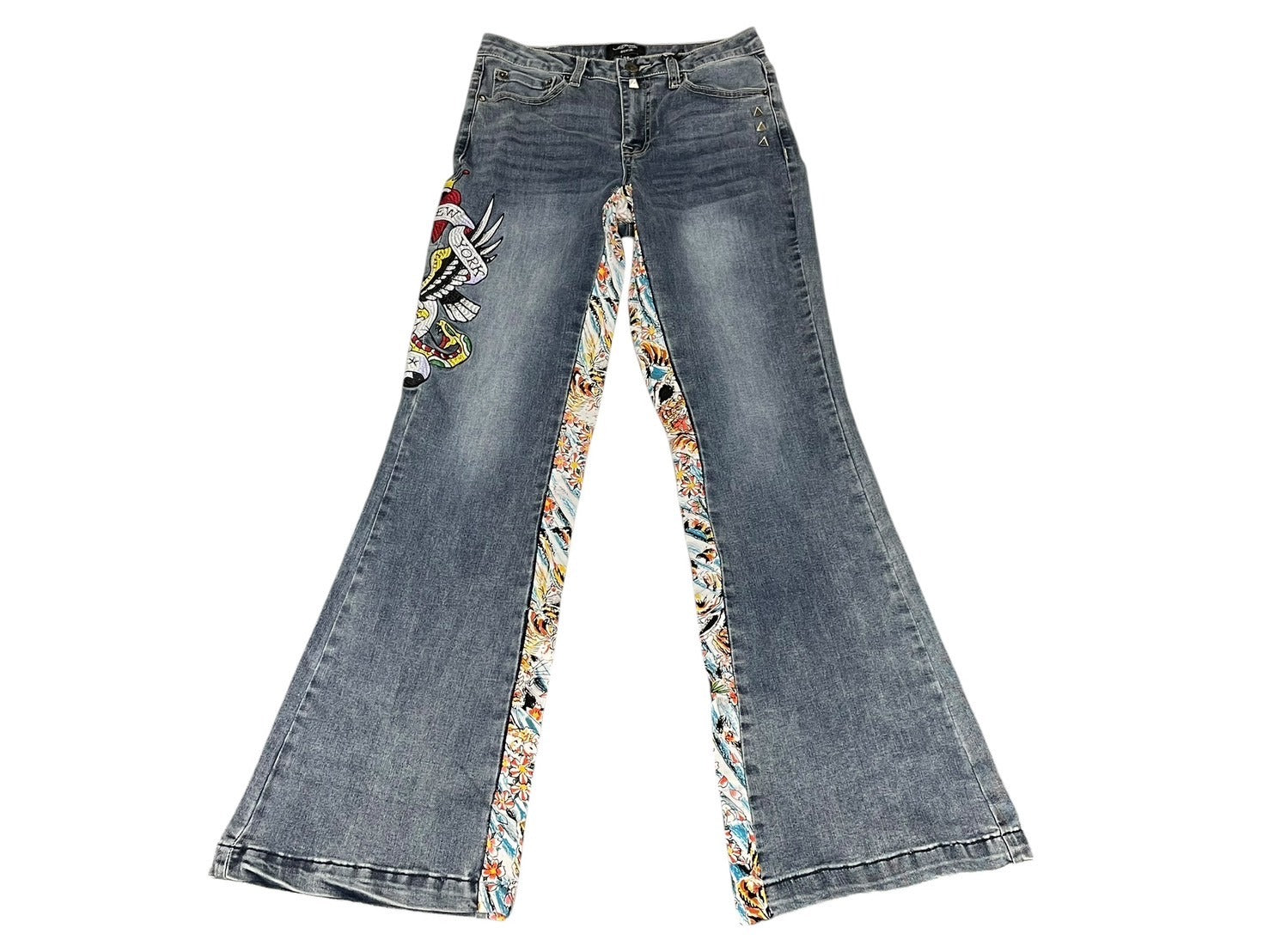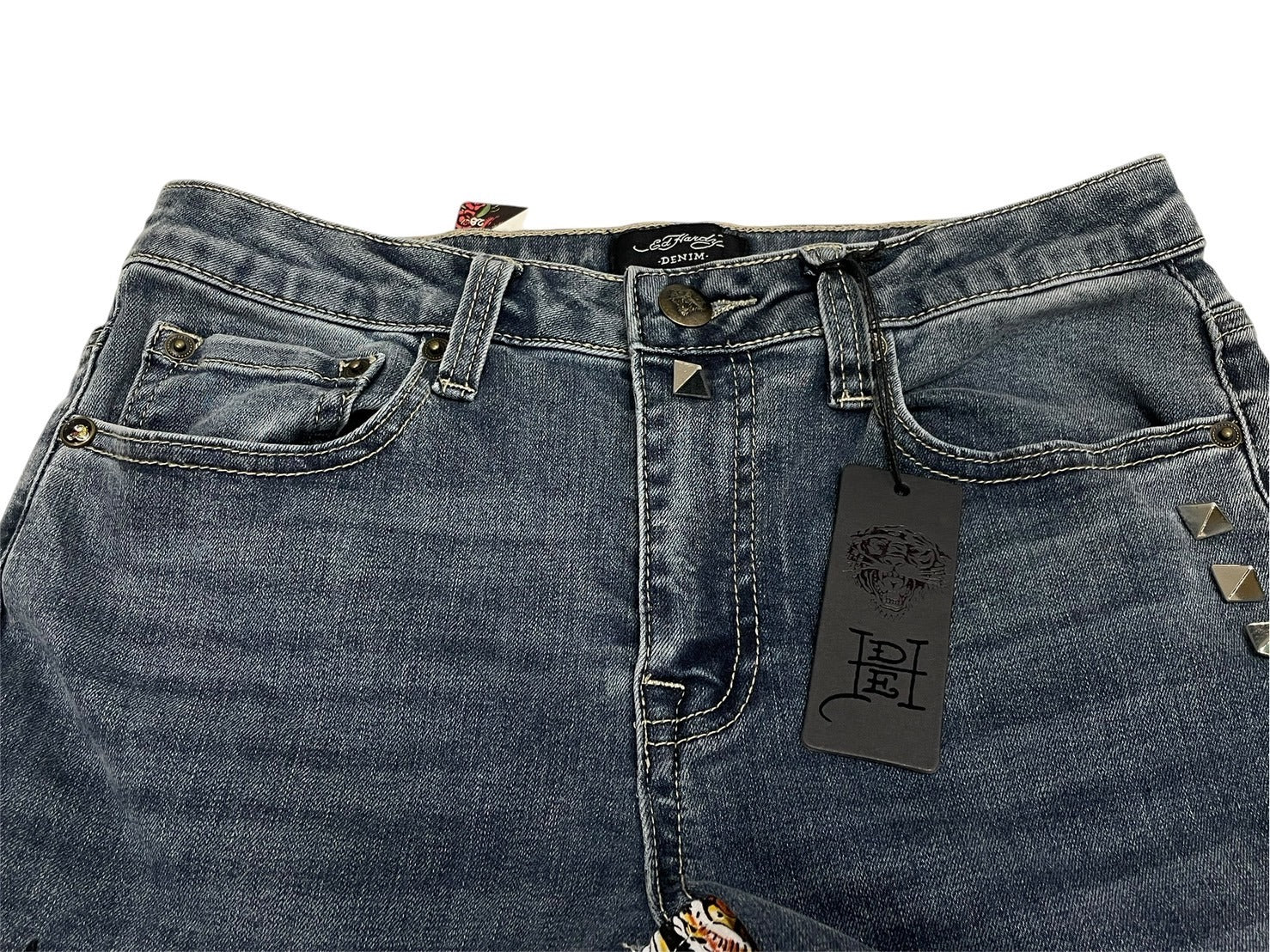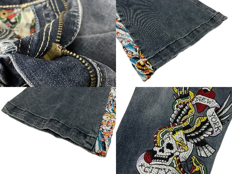 新品未使用 ED HARDY エドハーディ リメイク フレアデニム スタッズ 刺繍 WEHD8400-2 コットン ブルー サイズ28 中古 4c069856