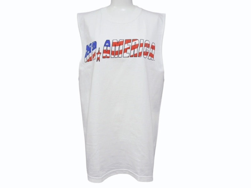 1977年にプロレスラーになり、1983年に米プロレス団体のワールド レスリング フェデレーション(WWF)と契約して一躍有名になった、伝説的なプロレスラーの二つ名である、Mr.Americaのグラフィックがプリントされたタンクトップです。