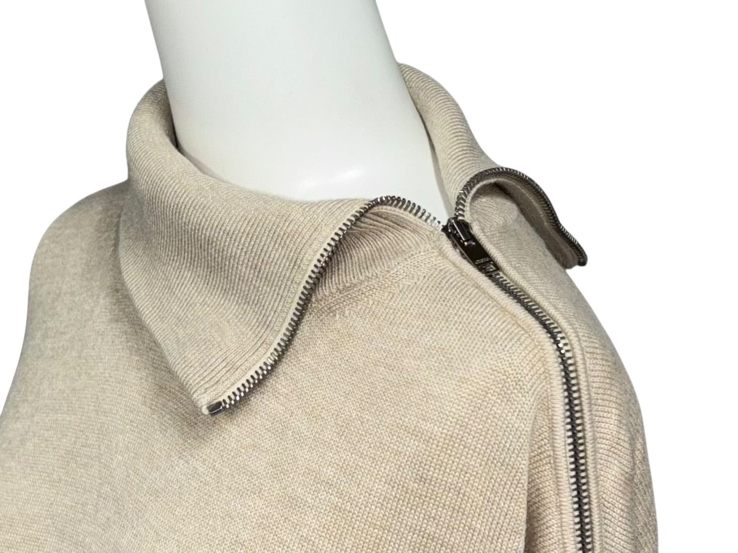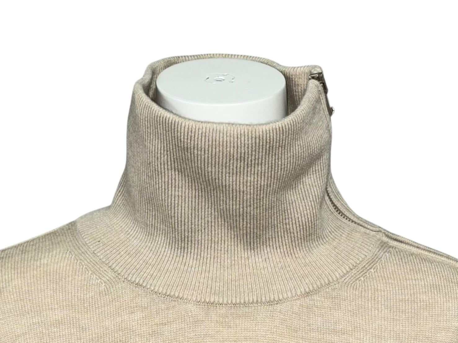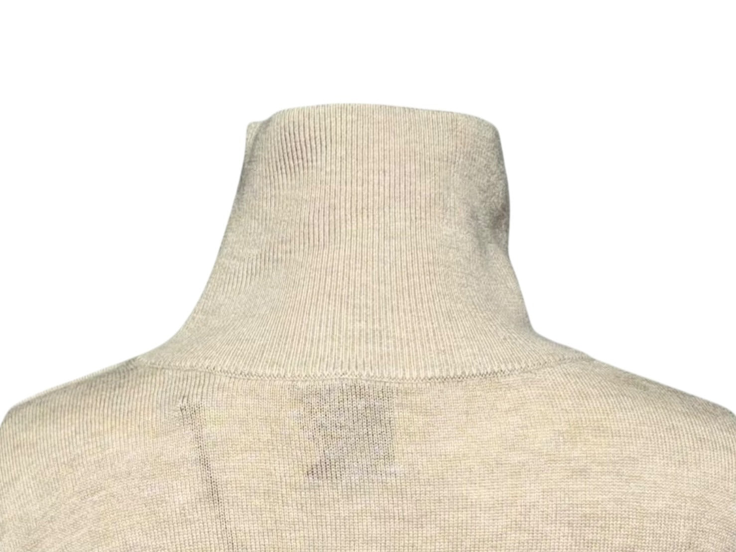 ハイネックまたはモックネック(襟元がやや高め)デザイン。
