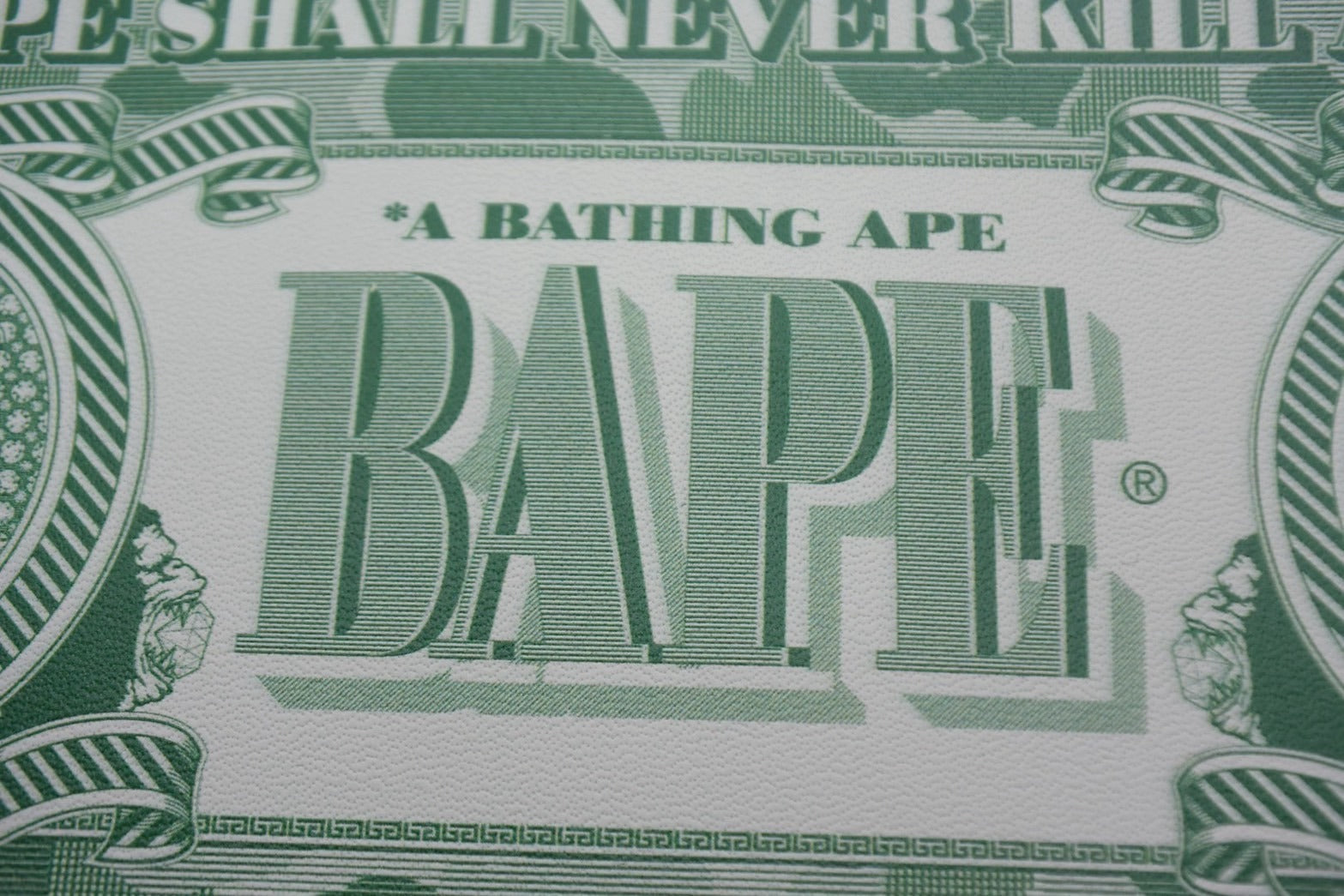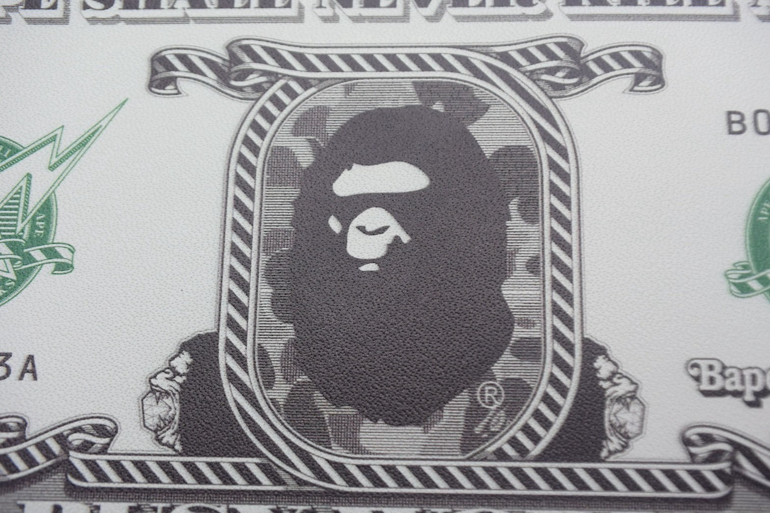 表面にAPE HEAD・裏面にブランドロゴをドル札風にアレンジしたグラフィックを全面プリントしたデザイン。