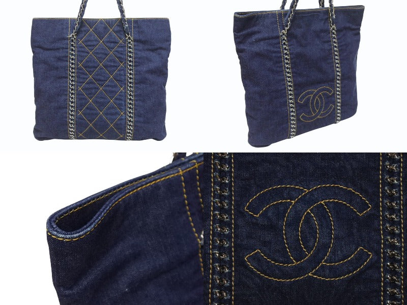 トートバッグ 極美品 CHANEL シャネル ラグジュアリーライン チェーントートバッグ 10番台 ココマーク ステッチ デニム ネイビー シルバー金具 中古 4b005451