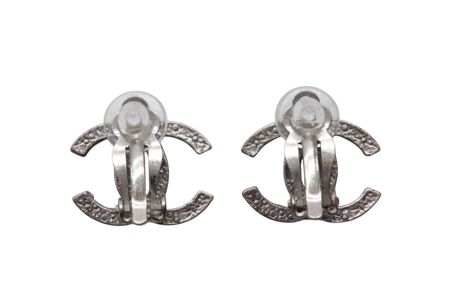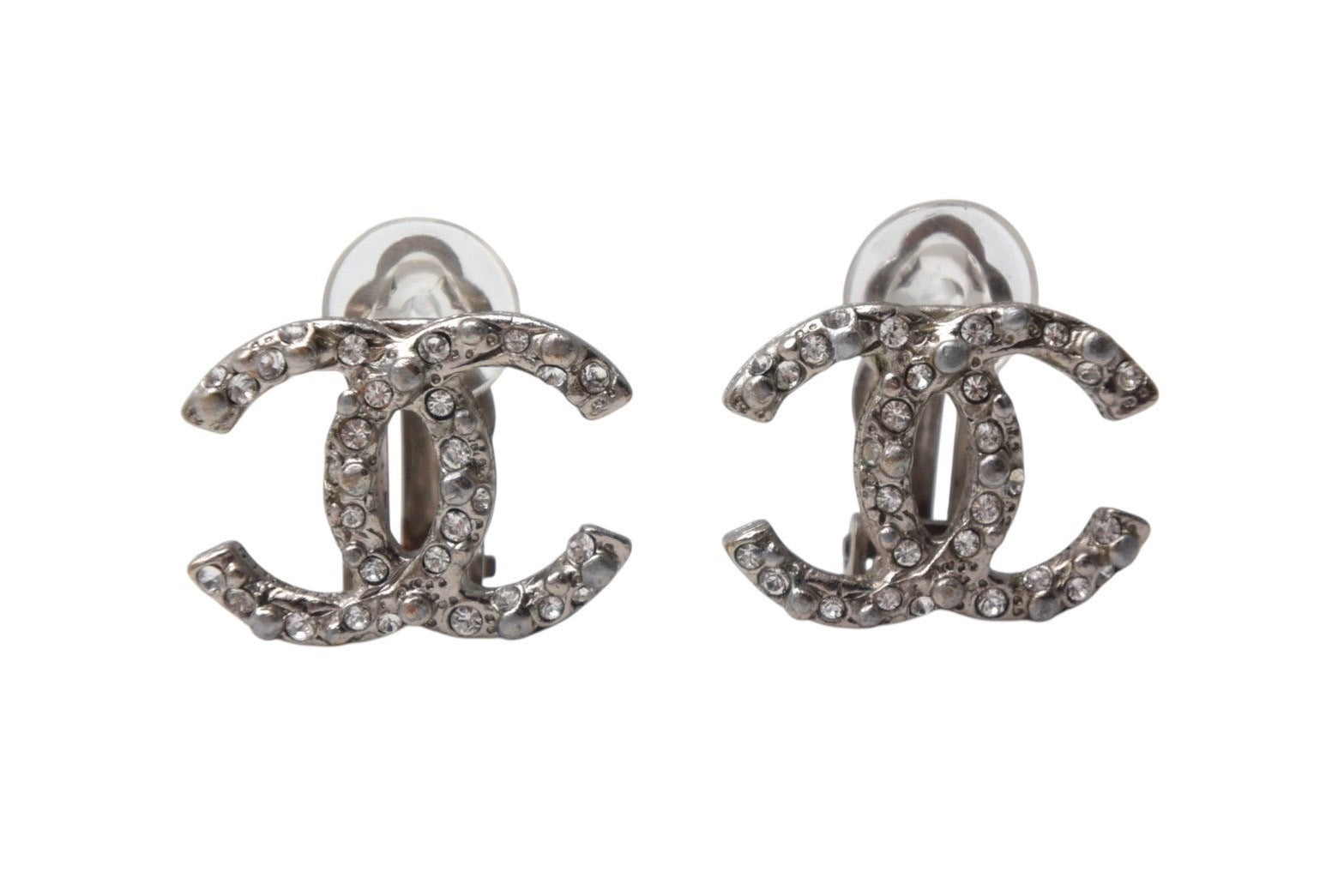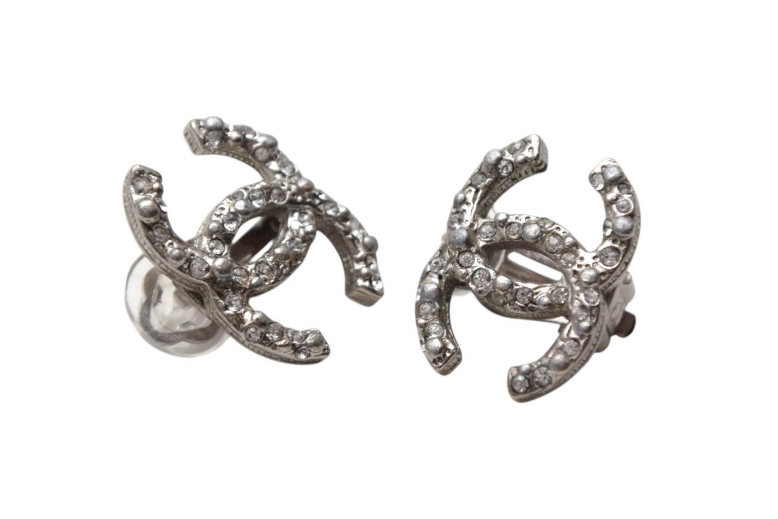 極美品 CHANEL シャネル イヤリング 両耳 ココマーク A12A刻印 フランス製 メタル ラインストーン 2.7g シルバー金具 中古 4c075481