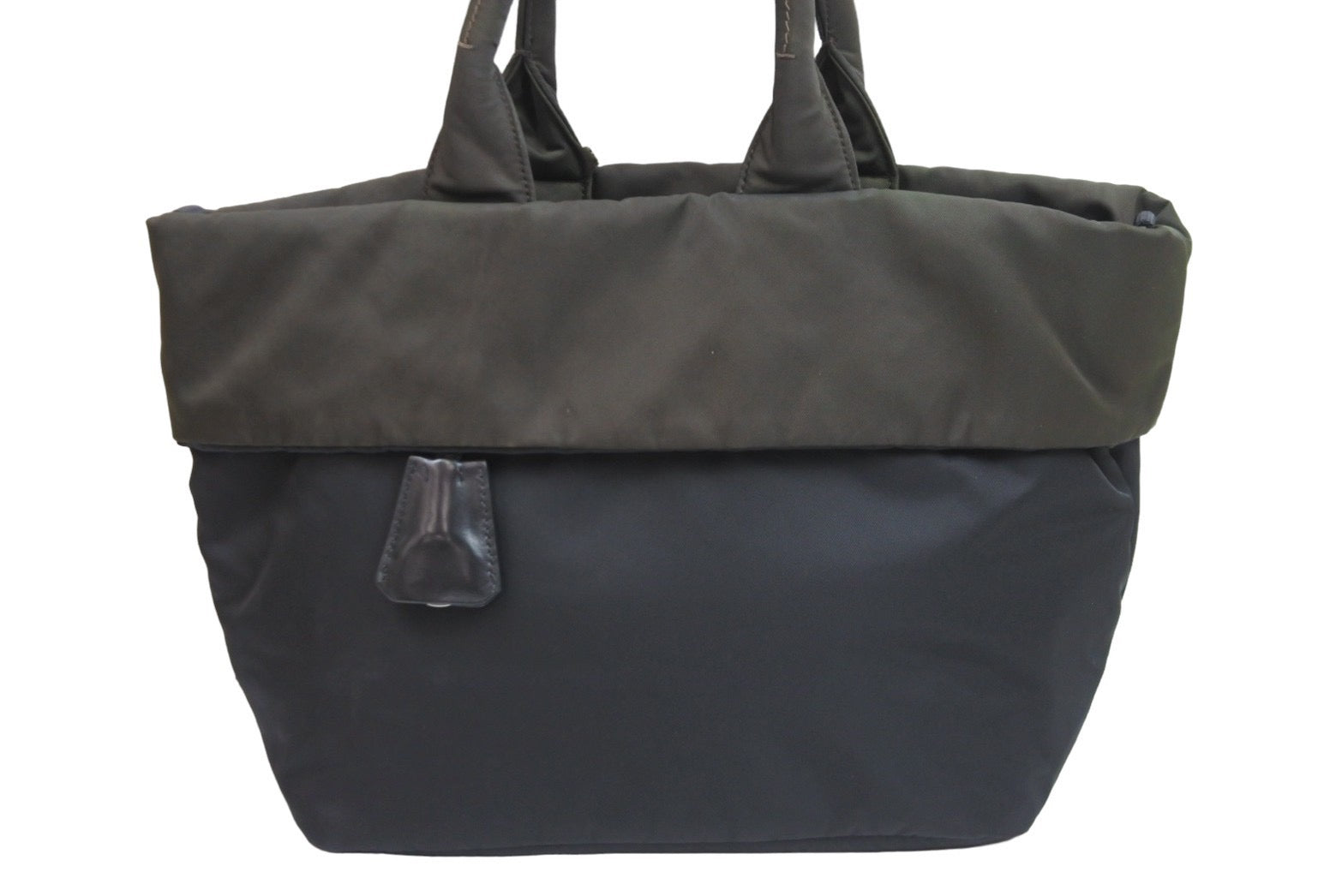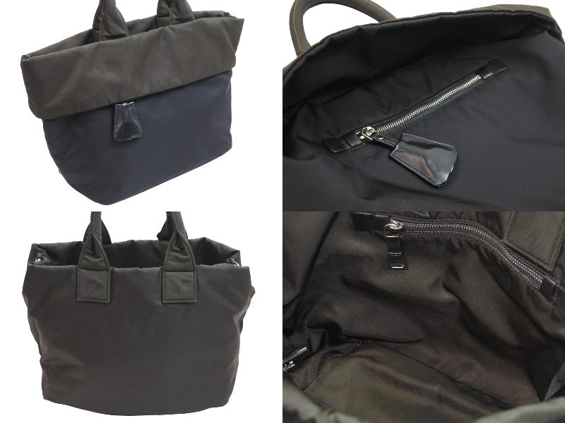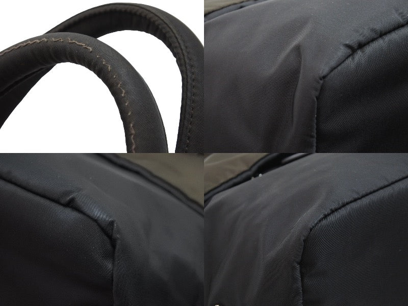 カーキの部分は全体的にヤケあり、レザー部分周りにシミがあります。