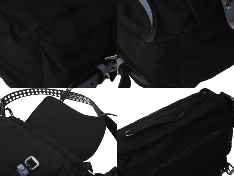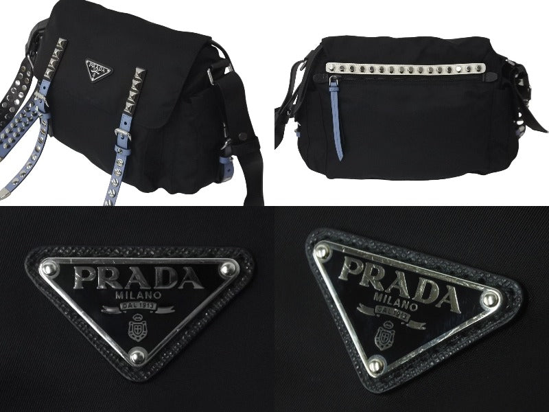 PRADA プラダ ナイロン スタッズ ショルダーバッグ ブラック トライアングルロゴ シルバー金具 レザー 1BD118 美品 中古 60418