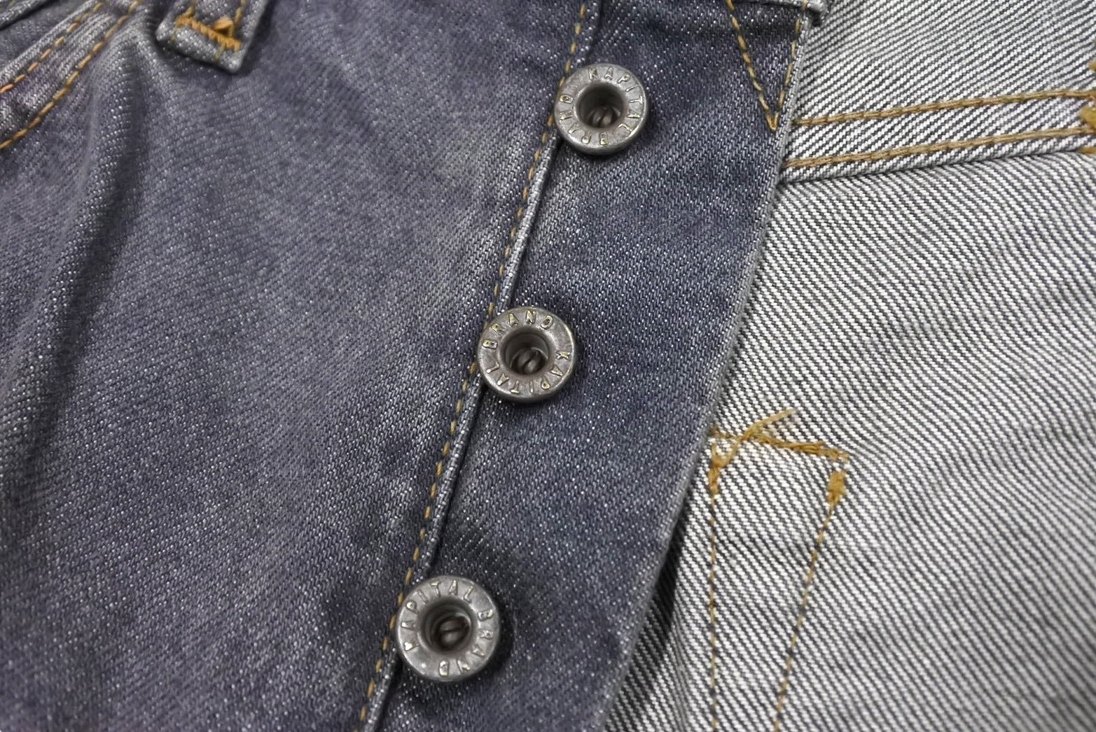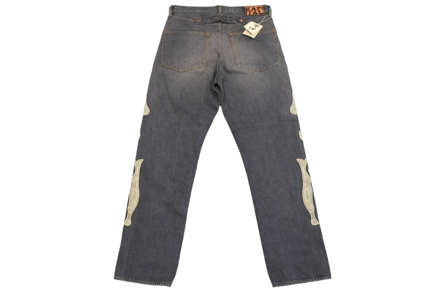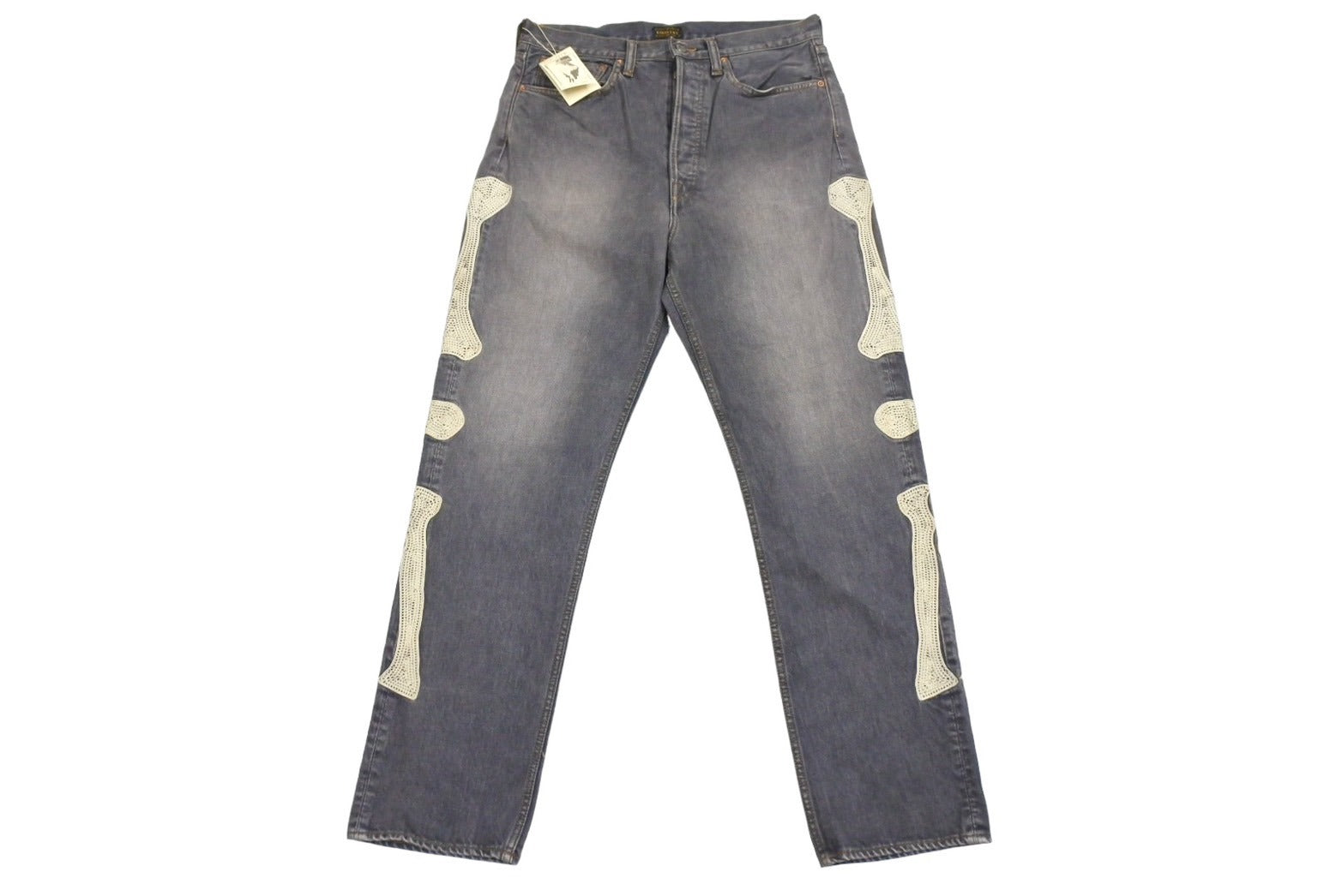 メキシコの「死者の日」をモチーフに、デフォルメされた骨の刺繍を両サイドに施したブラックデニムパンツ。緩やかにテーパードのかかったシルエットです。