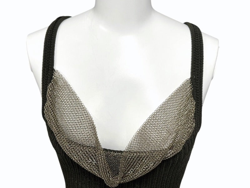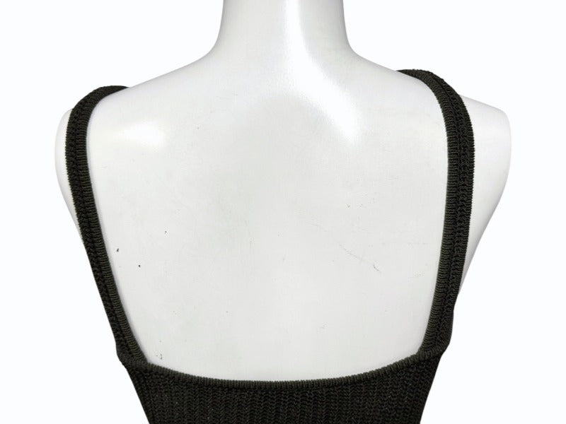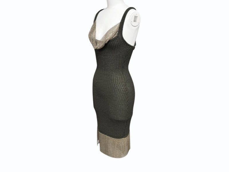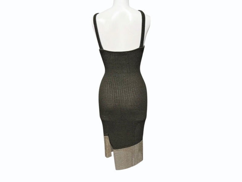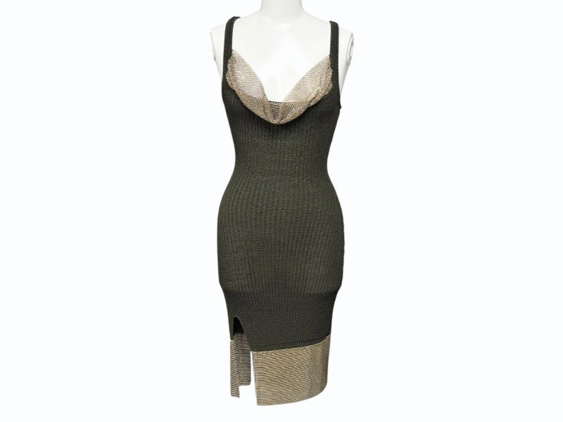 カーキのワンピースにゴールドの金具がついていて高級感があるデザインです。