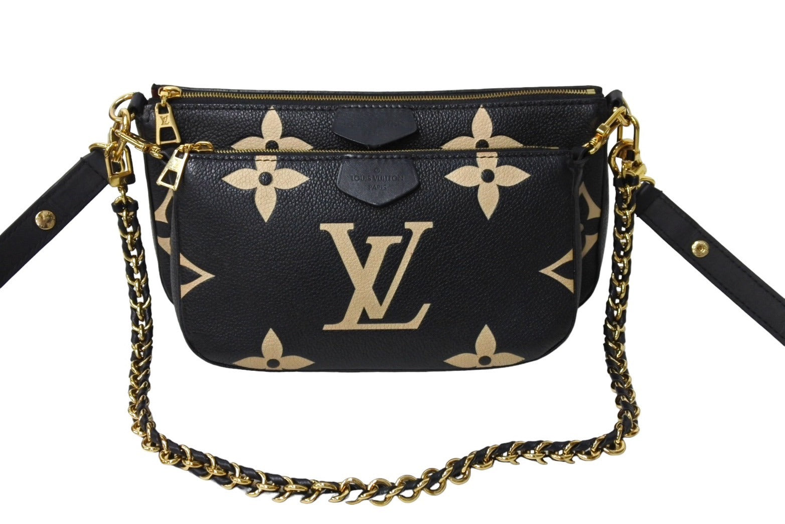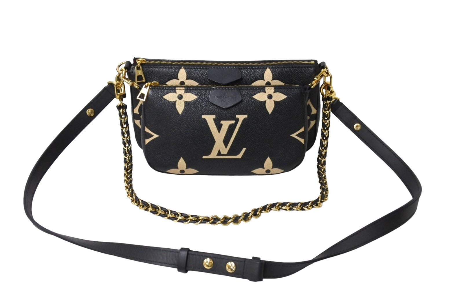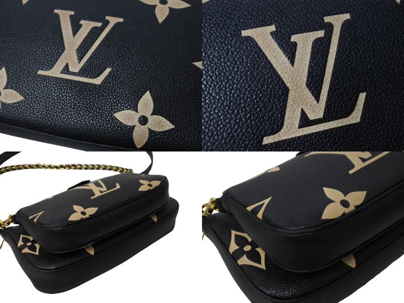 エンボス加工が特徴のブラックのモノグラム アンプラント レザーに、クリームカラーのモノグラム パターンをプリントした「ミュルティ ポシェット アクセソワール」。印象的なクロスボディバッグです。2つのバッグを一体化させ、女性の必需品を持ち運ぶのに最適なサイズに仕上げ、取外し可能なポーチも備えています。しなやかで軽量な持ち運びしやすいアイテムです。
