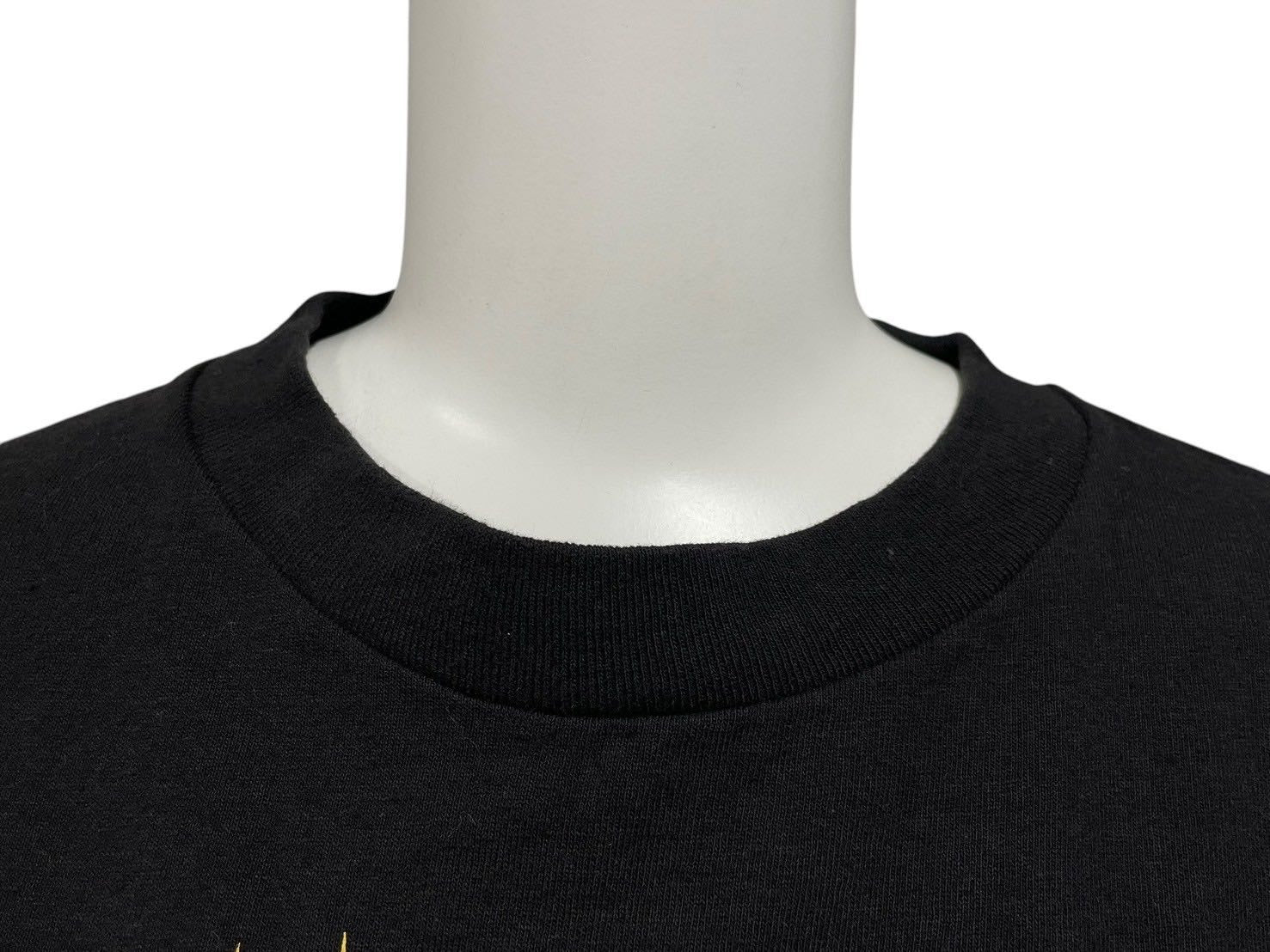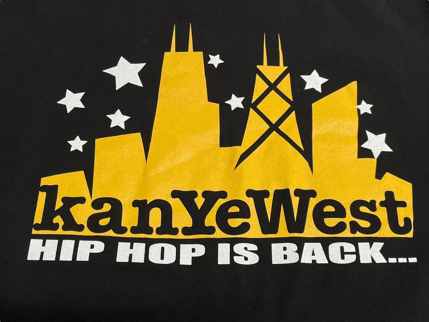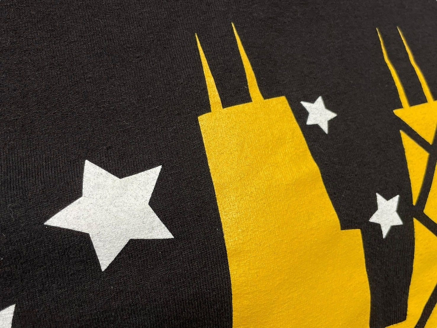 フロントに建物と星、文字をプリントした個性あるデザインのTシャツです。
