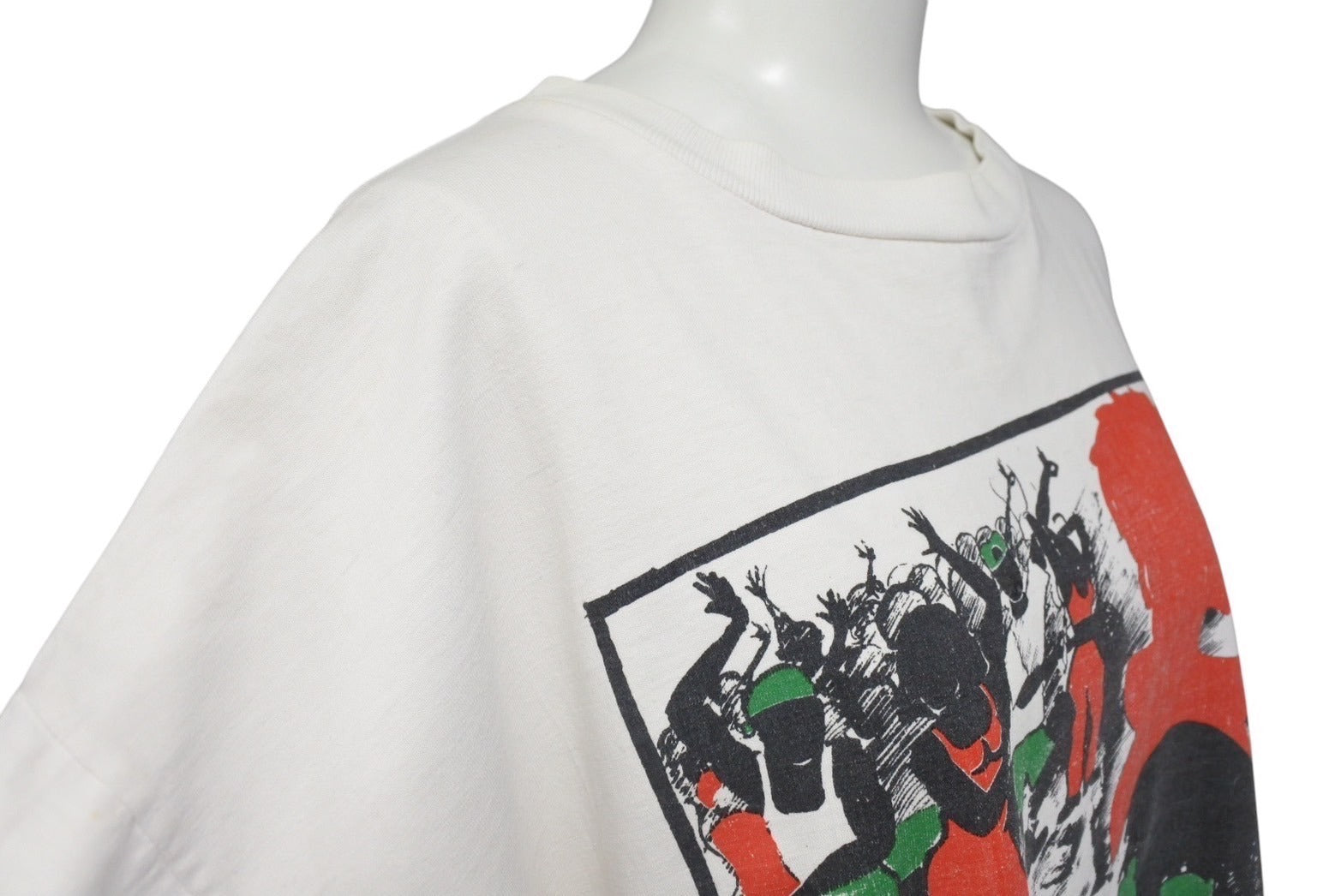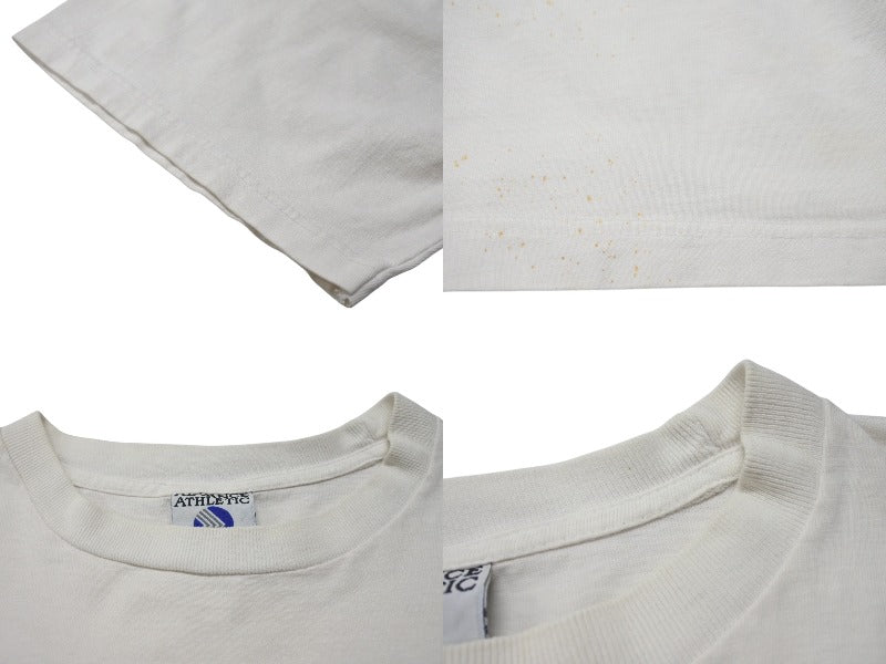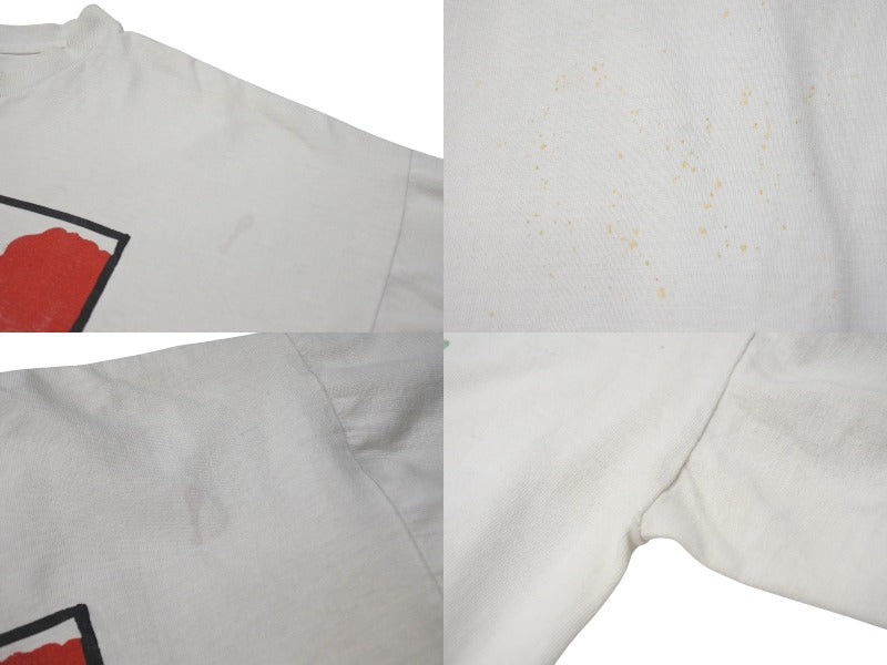 全体的に少々の毛羽立ちと黄ばみがあります。首元に汚れあります。左右の胸元に多少のシミと汚れがあります。後ろの首元にほつれがあり、背面の右下に汚れがあります。表面と裏面のプリントに多少の剥げがあります。