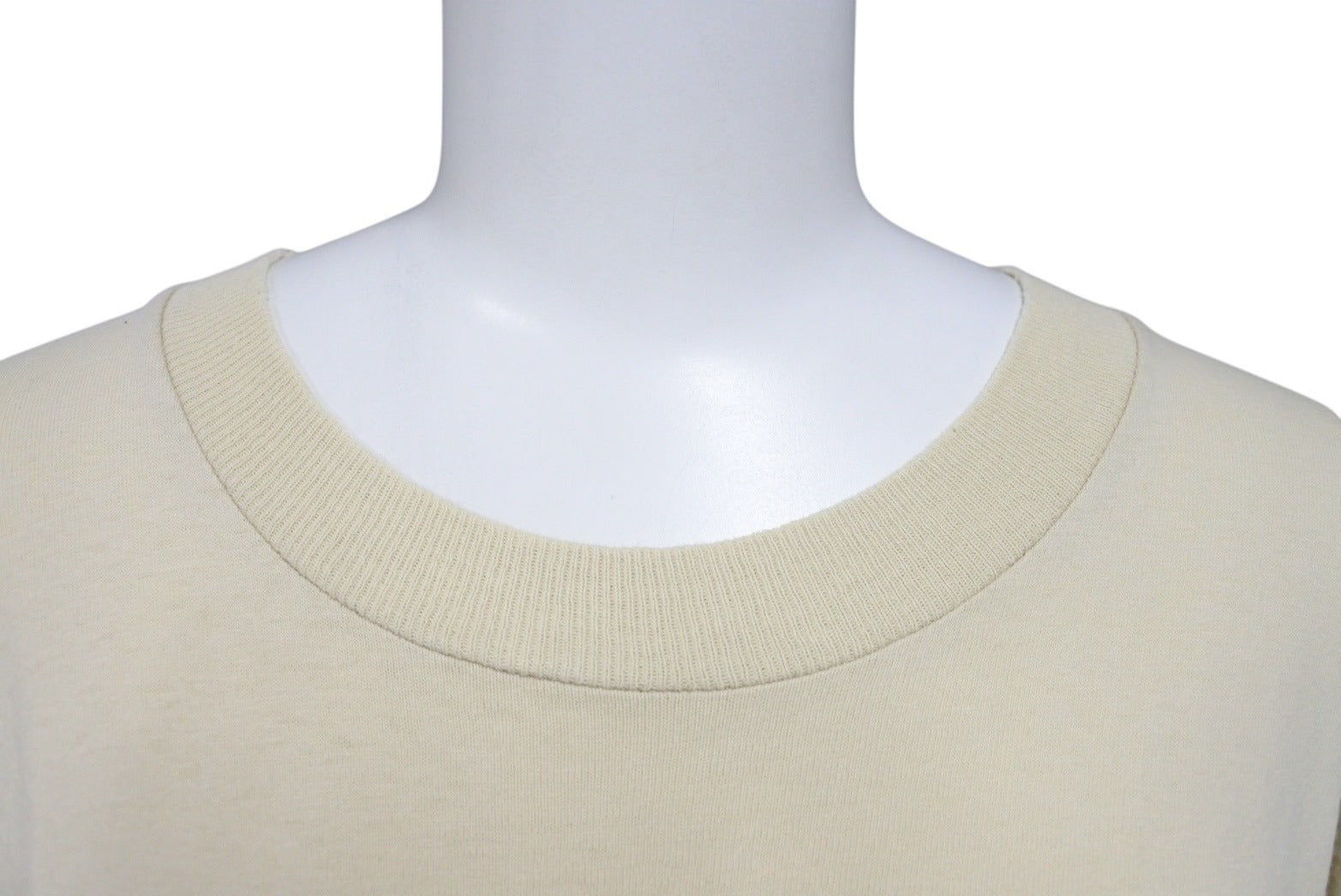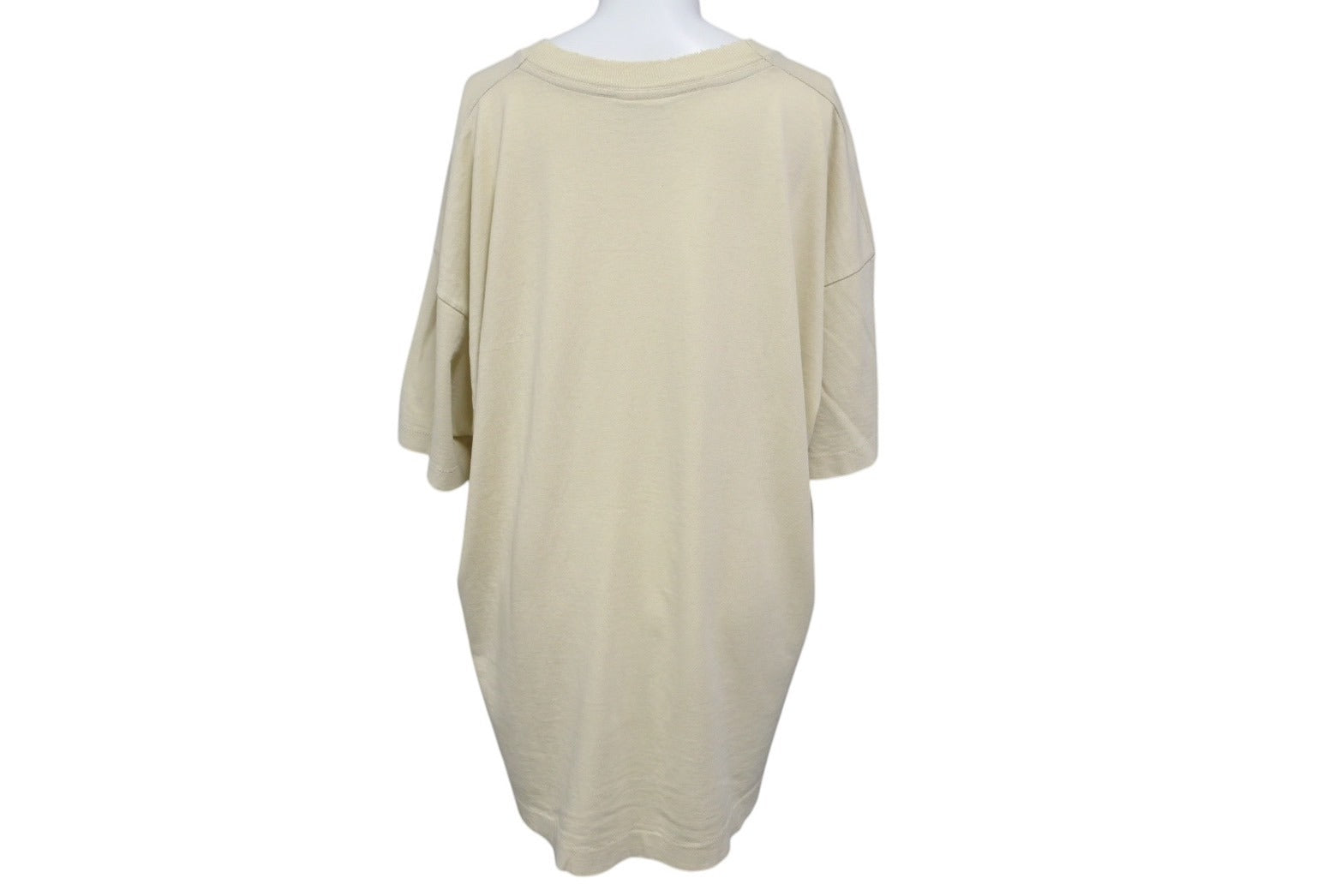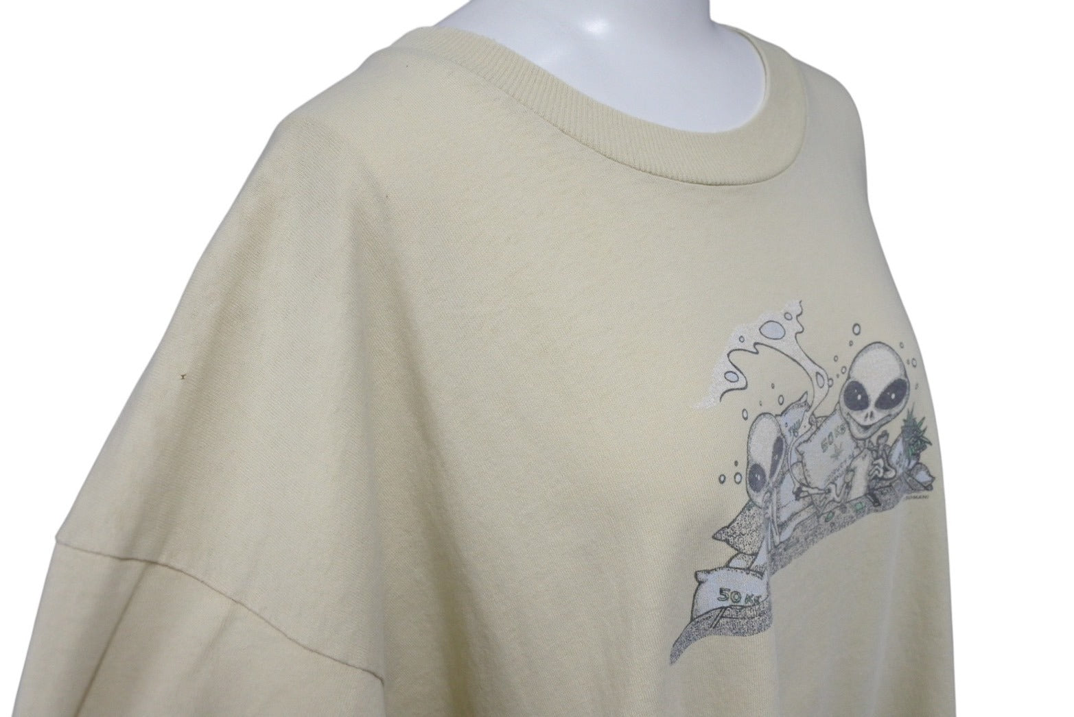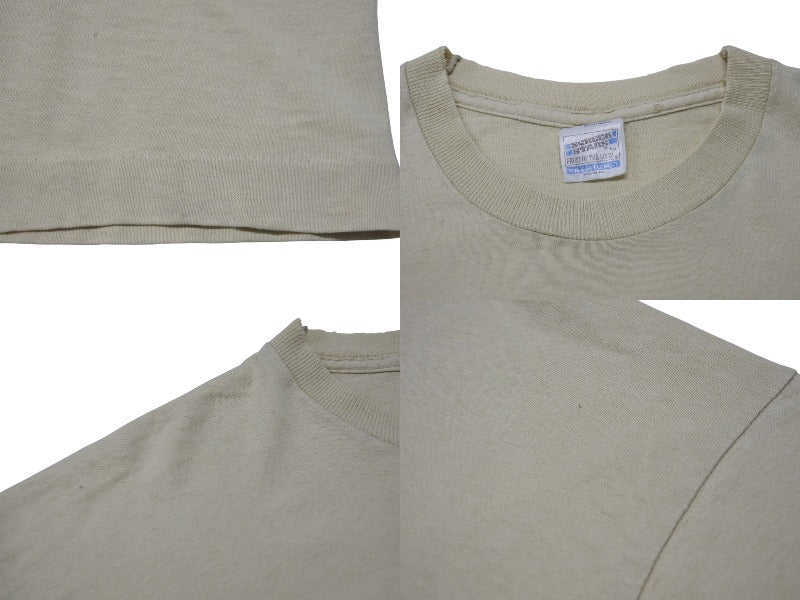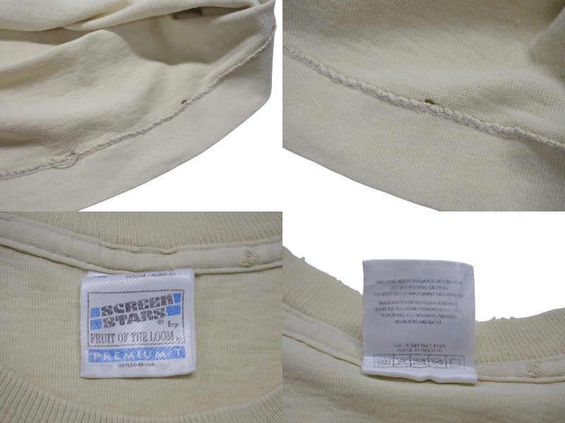 首元に擦り切れあり。フロント肩部分、フロント下部にピンホールあり。背面右袖付近にシミあり。プリントにフェードあり。色褪せ、毛羽立ちあり。その他使用感の少ない状態です。