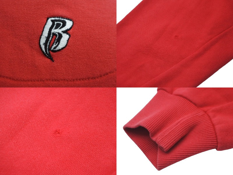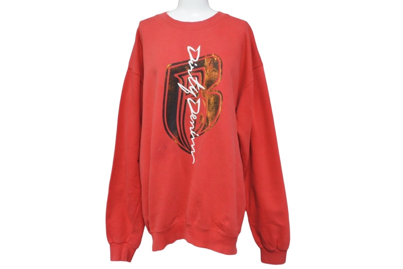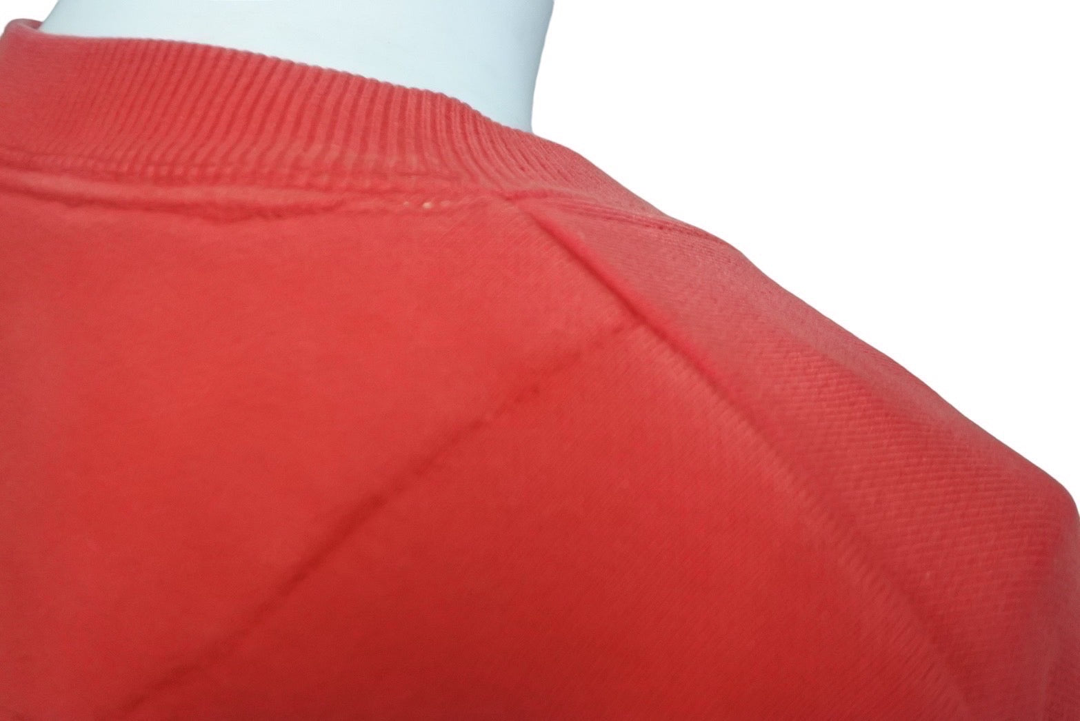 全体的に毛羽立ちあり。表面プリント横に汚れあり。右袖口付近小さな破れあり。表面下部付近小さな汚れあり。左袖裏汚れあり。首元と袖口と裾色褪せあり。