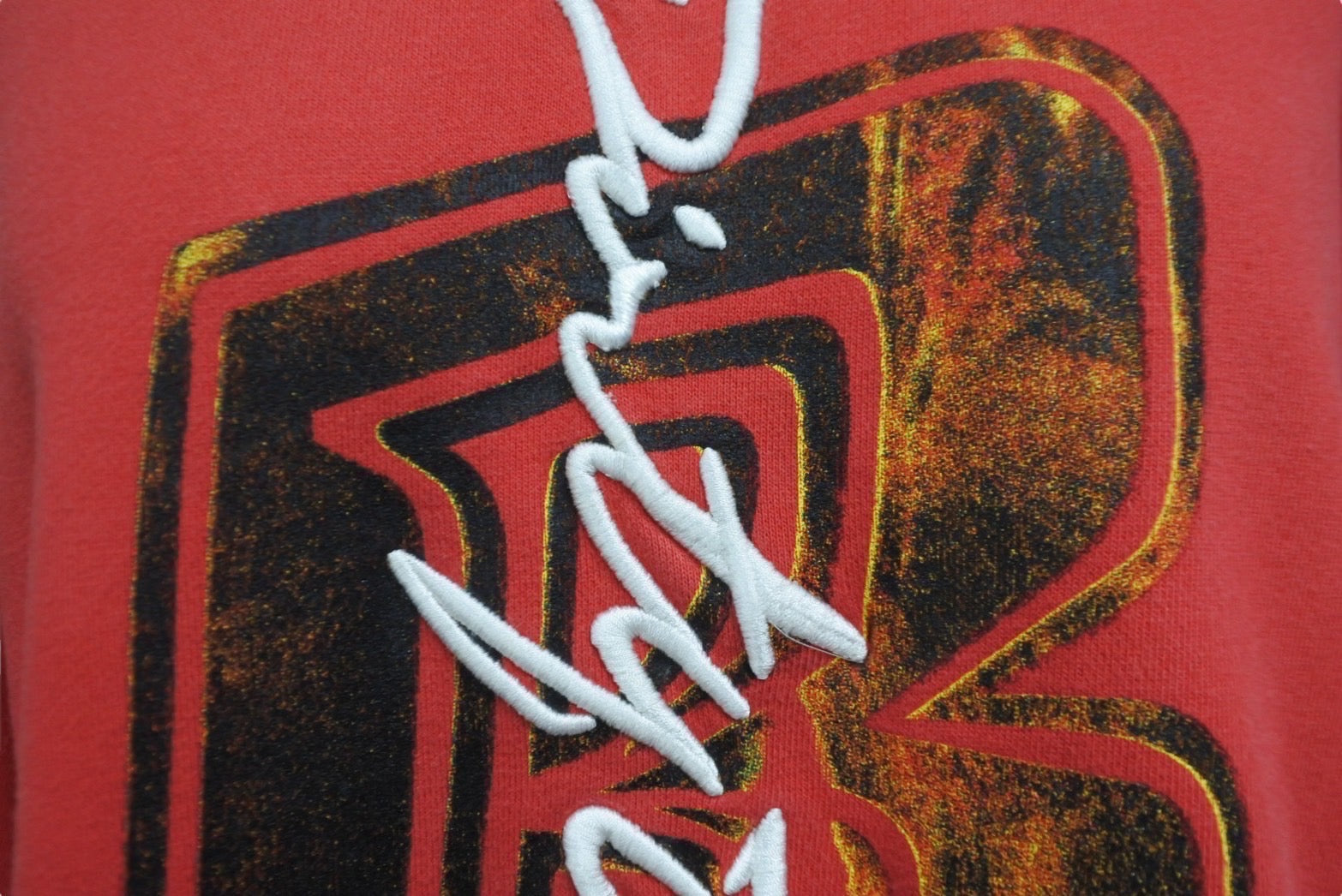 表面にプリントと刺繍が施されたビッグロゴデザインのヴィンテージらしいアイテムです。