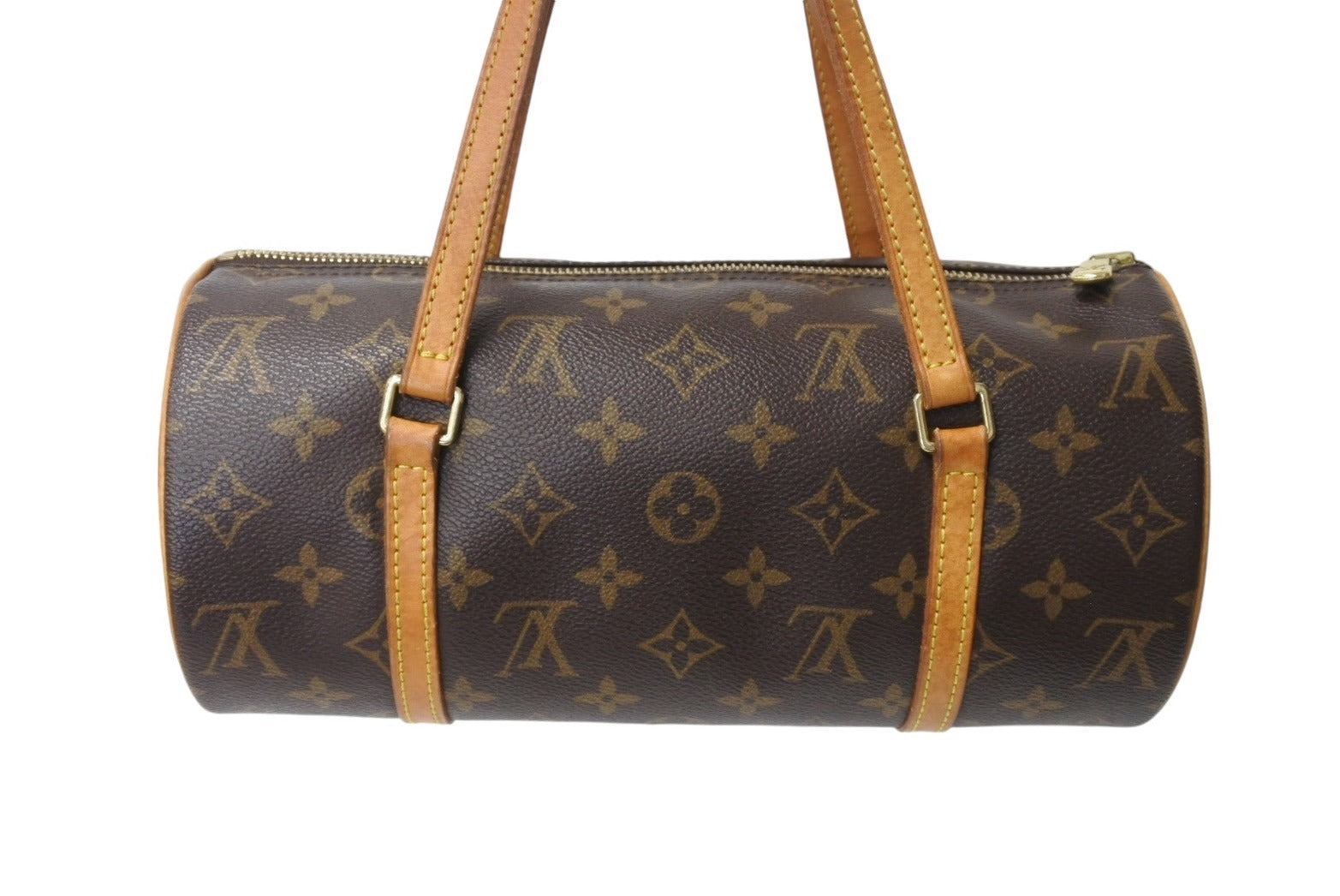 ヌメ革部分にに汚れとスレ。角スレと金具傷があり、内側に汚れがありますがその他目立つ汚れの少ないアイテムです。