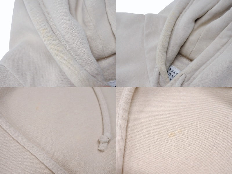 フードサイド部分にシミあり、袖口部分微かに毛羽立ち、シミなどあります。