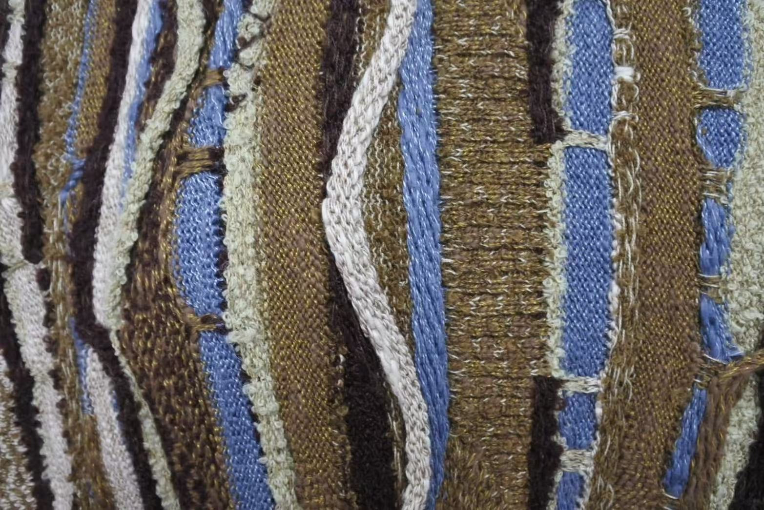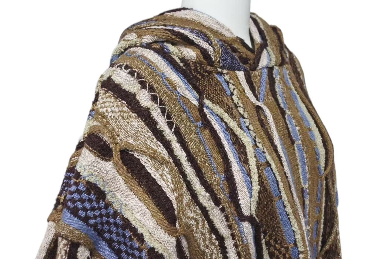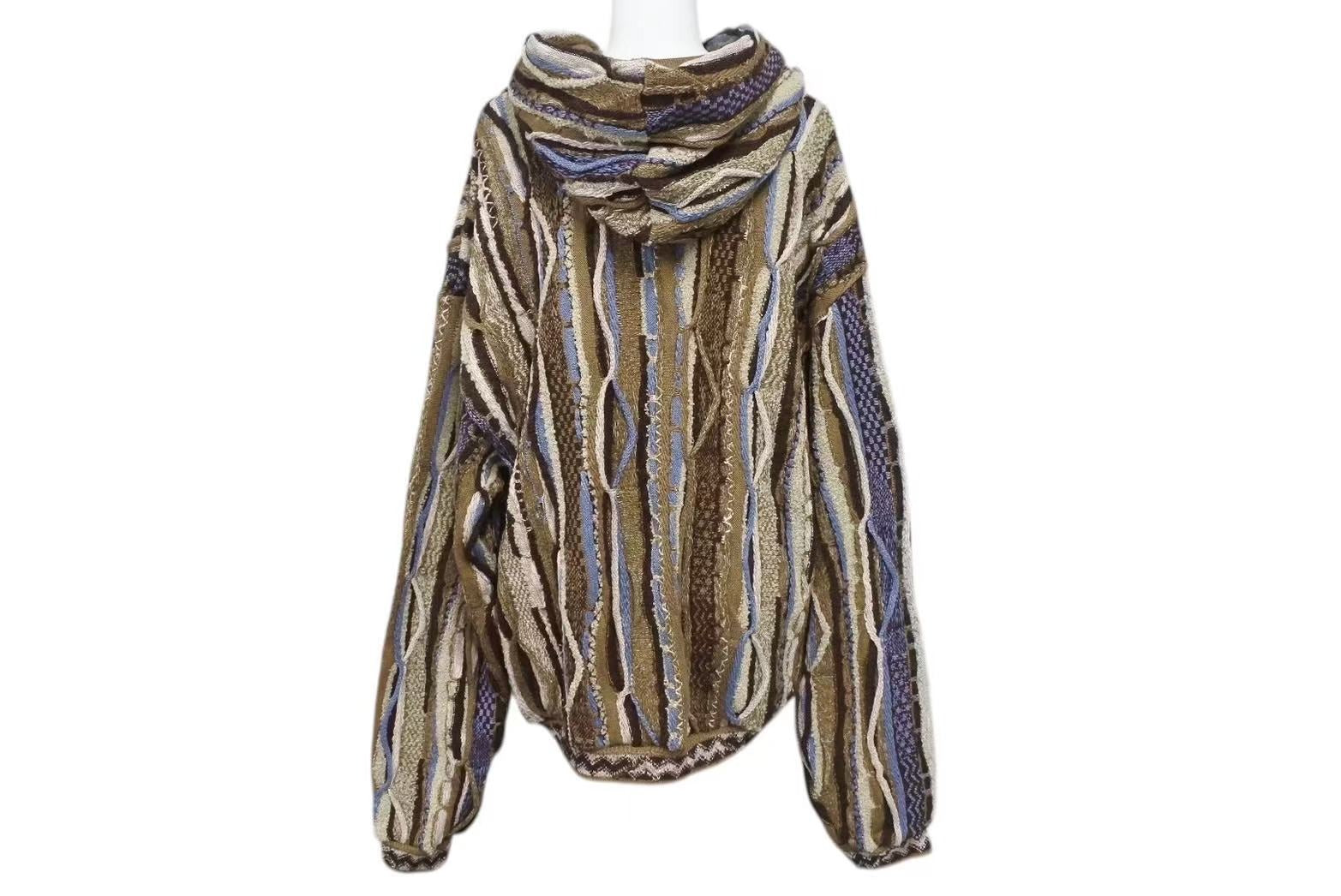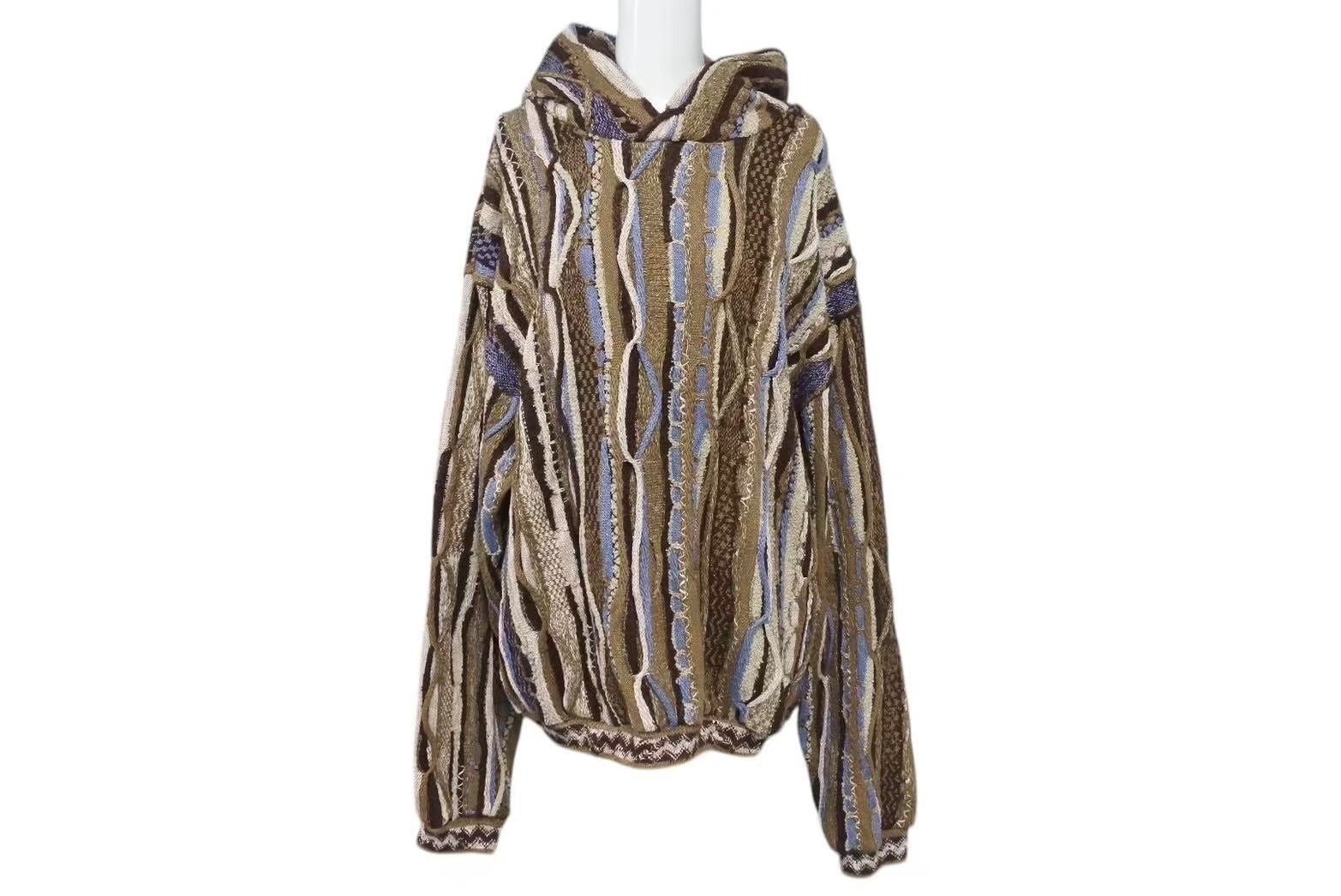 柔らかい質感の7Gニットのフードセーター。立体的で複雑なデザインの編み地が目を引く一枚です。