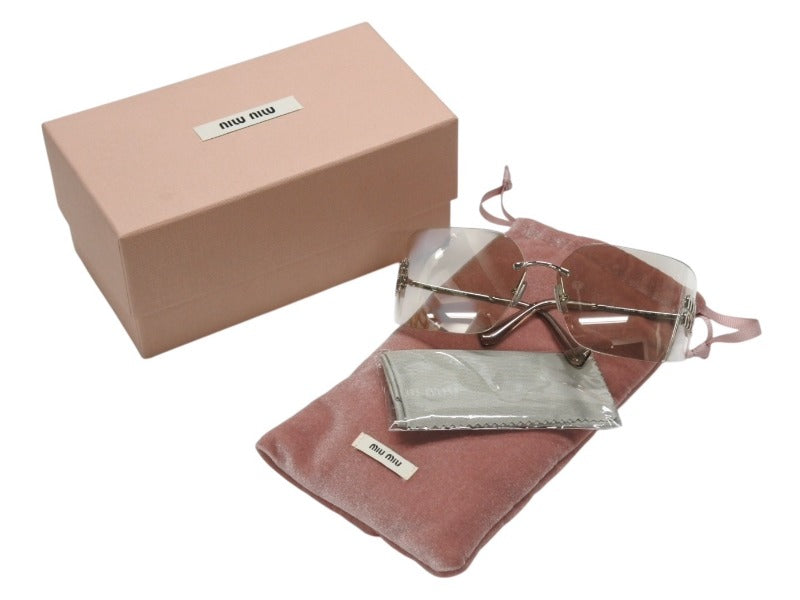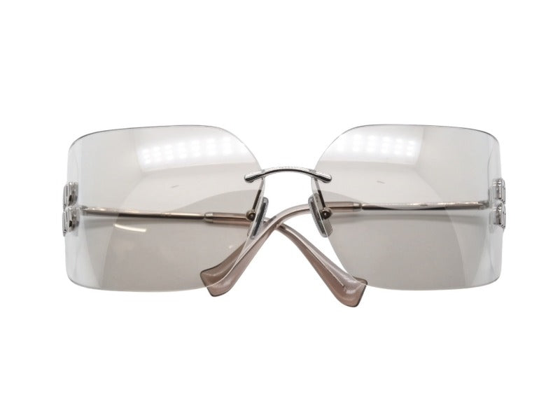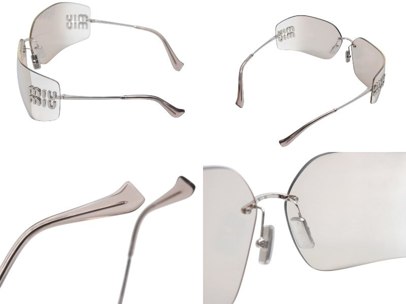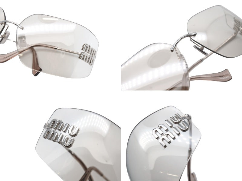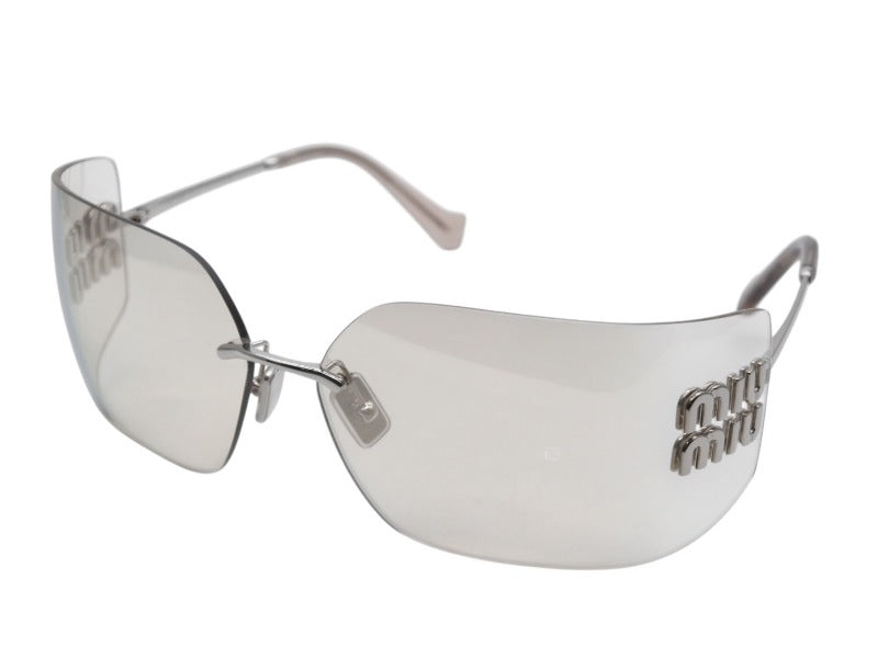 極美品 MIUMIU ミュウミュウ 夜明けのサングラス SMU54Y サイズ80□14 110 リムレス シールド グレー シルバー ロゴ金具 中古 4b006758
