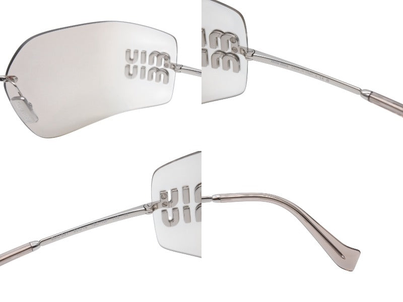 洗練されたモダンなデザインのメタルサングラスです。カーブしたレンズに縦向きの印象的なMIU MIU ロゴをあしらった、超軽量なリムレススタイルです。