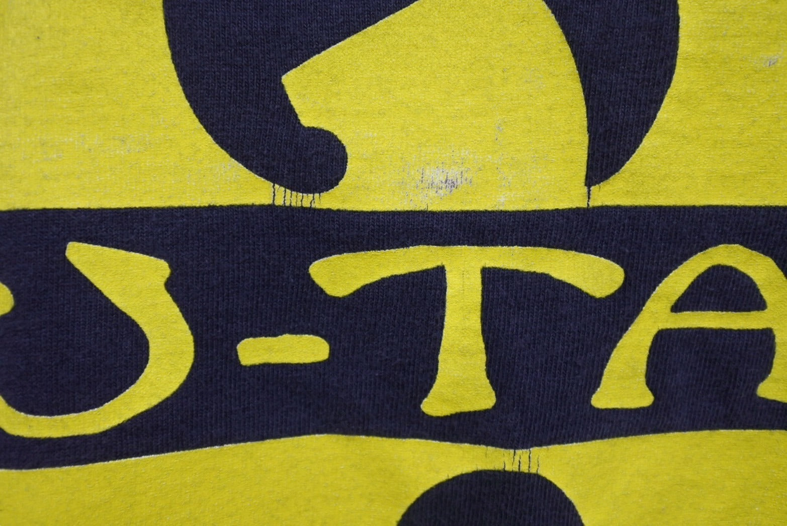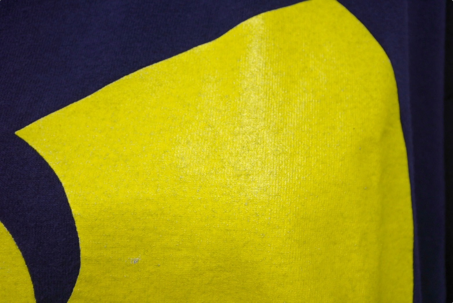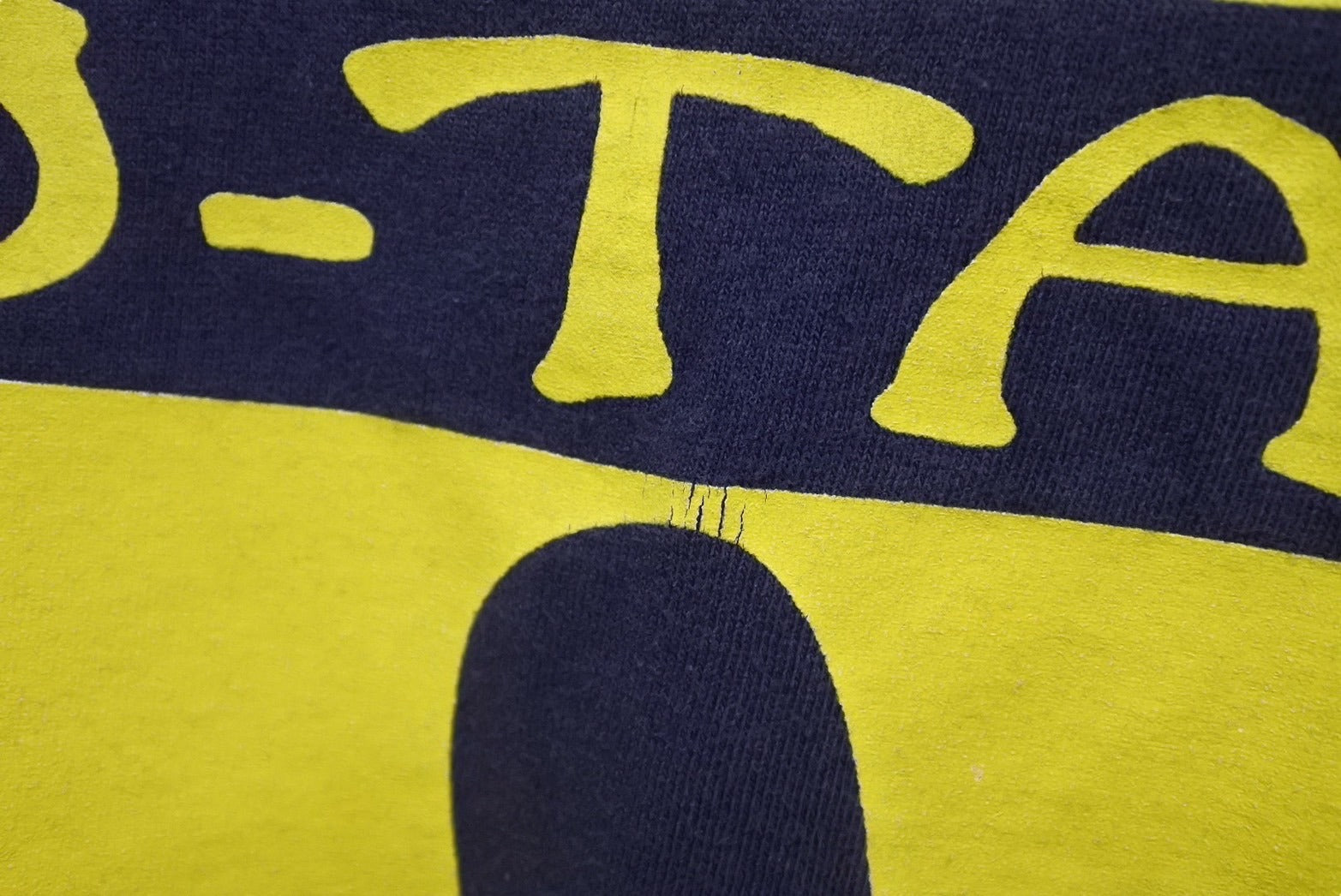 プリント割れ、首元、袖口色あせ、ヨレあります。僅かに全体的に色褪せあります。