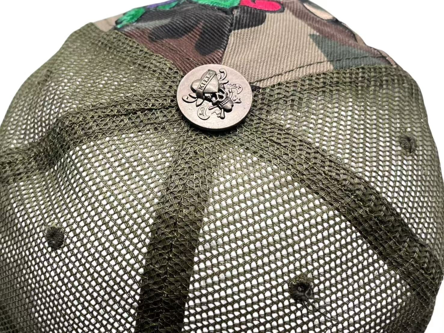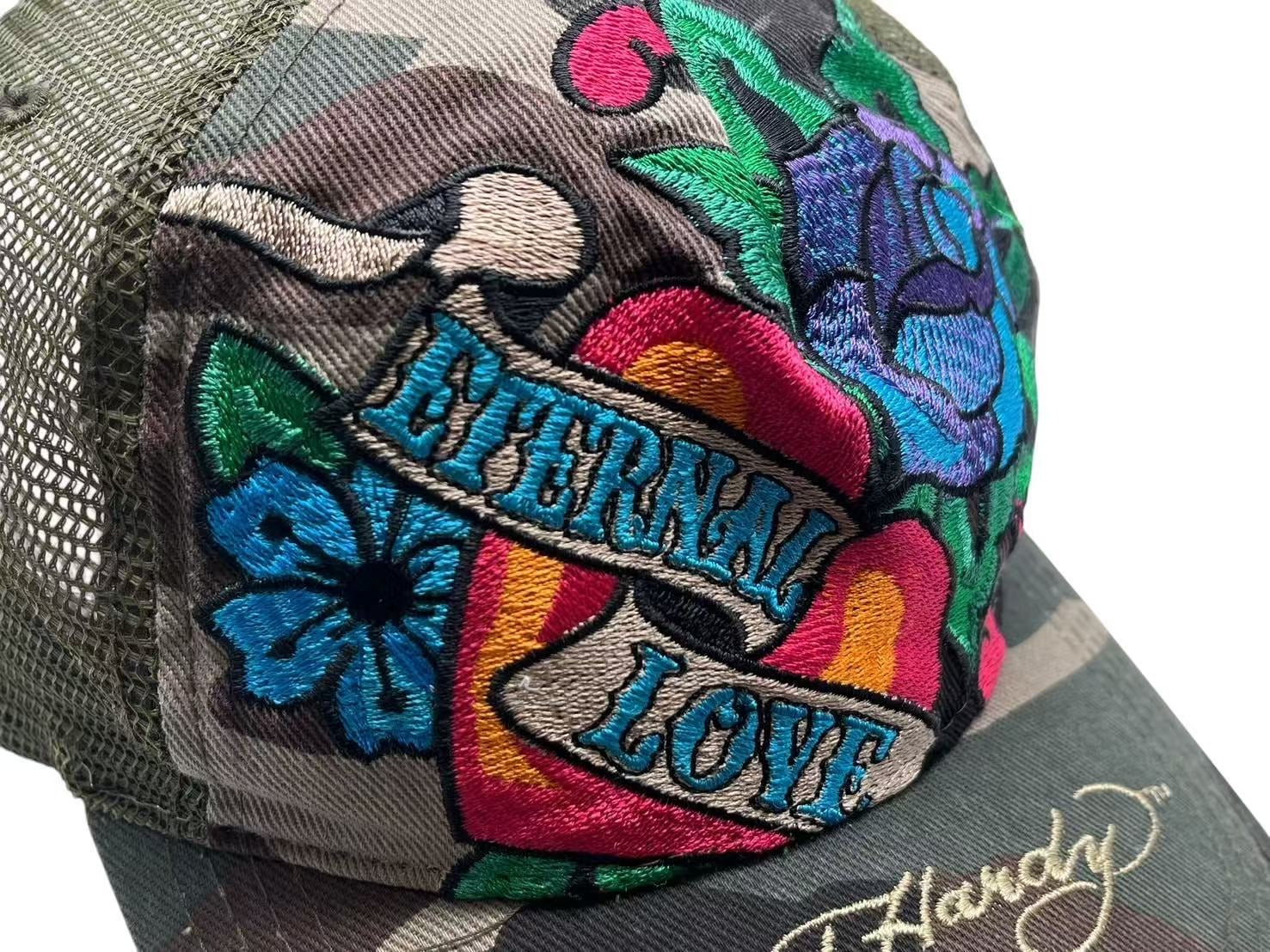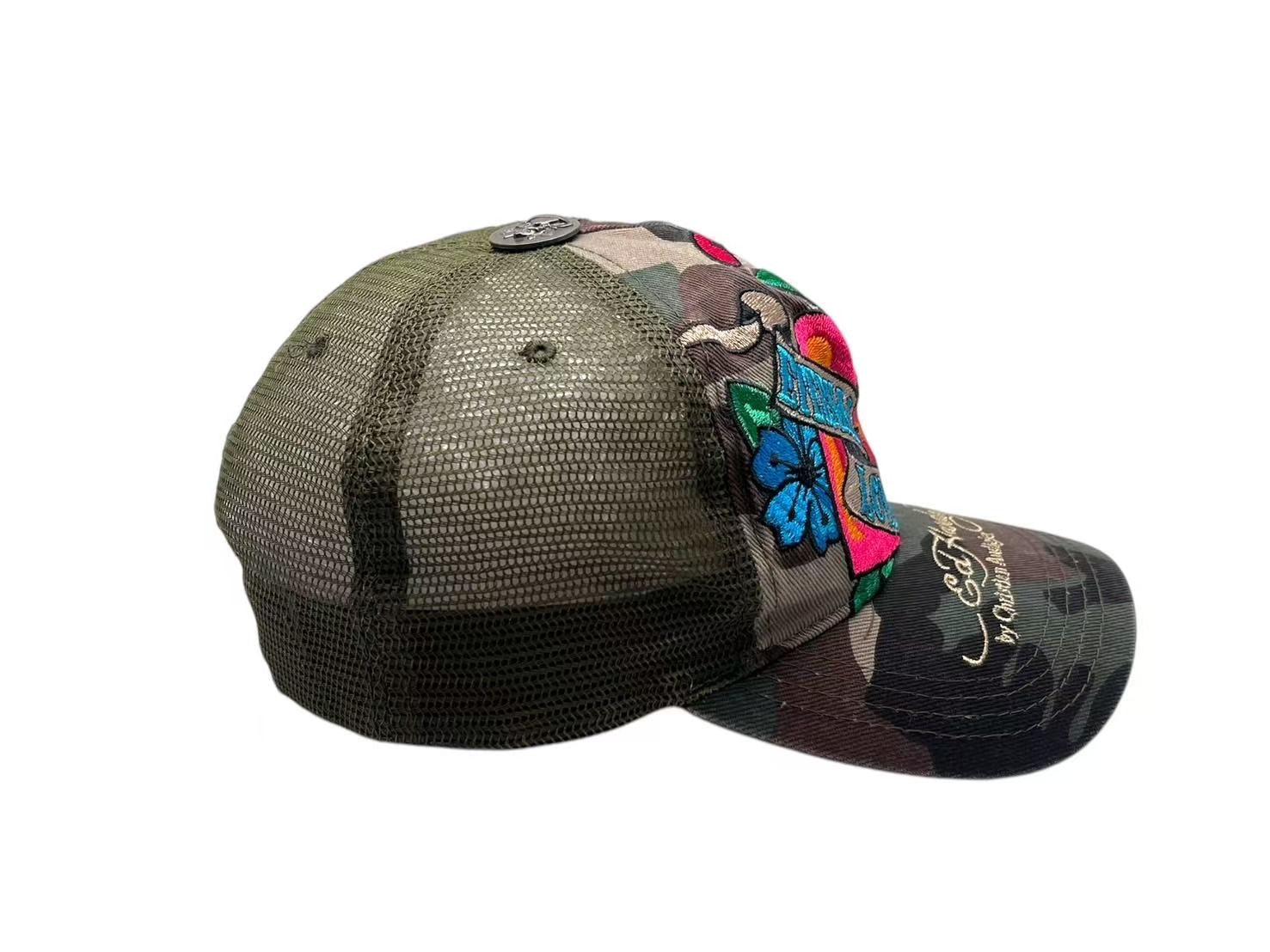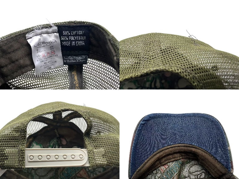 Ed Hardy エドハーディー Audigier エターナルラブ 刺繍 メッシュキャップ 帽子 デニム カモ グリーン 美品 中古 4b000518