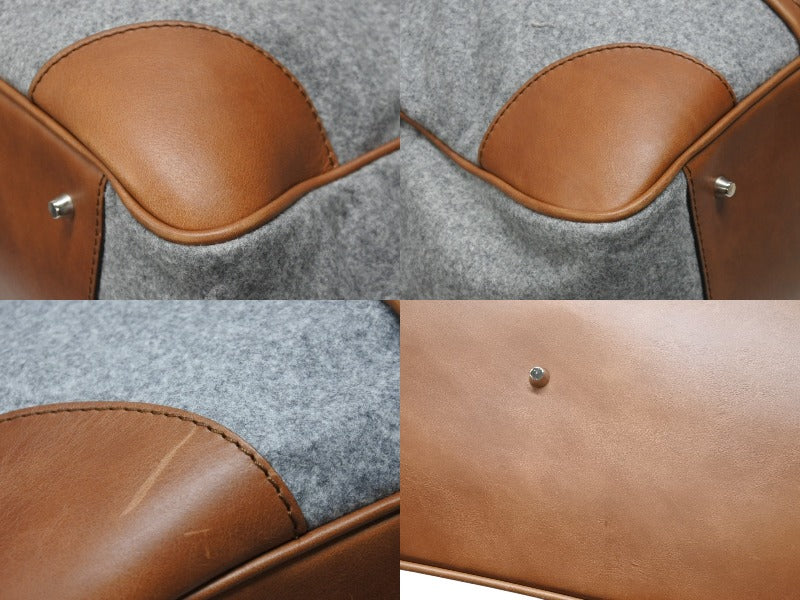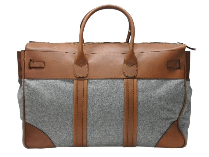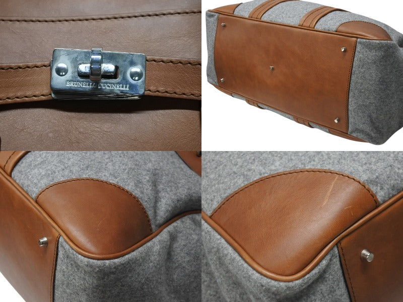 Brunello Cucinelli ブルネロクチネリ カントリーバッグ ビジネスバッグ レザー ウール ブラウン グレー シルバー金具 美品 中古 4b004968