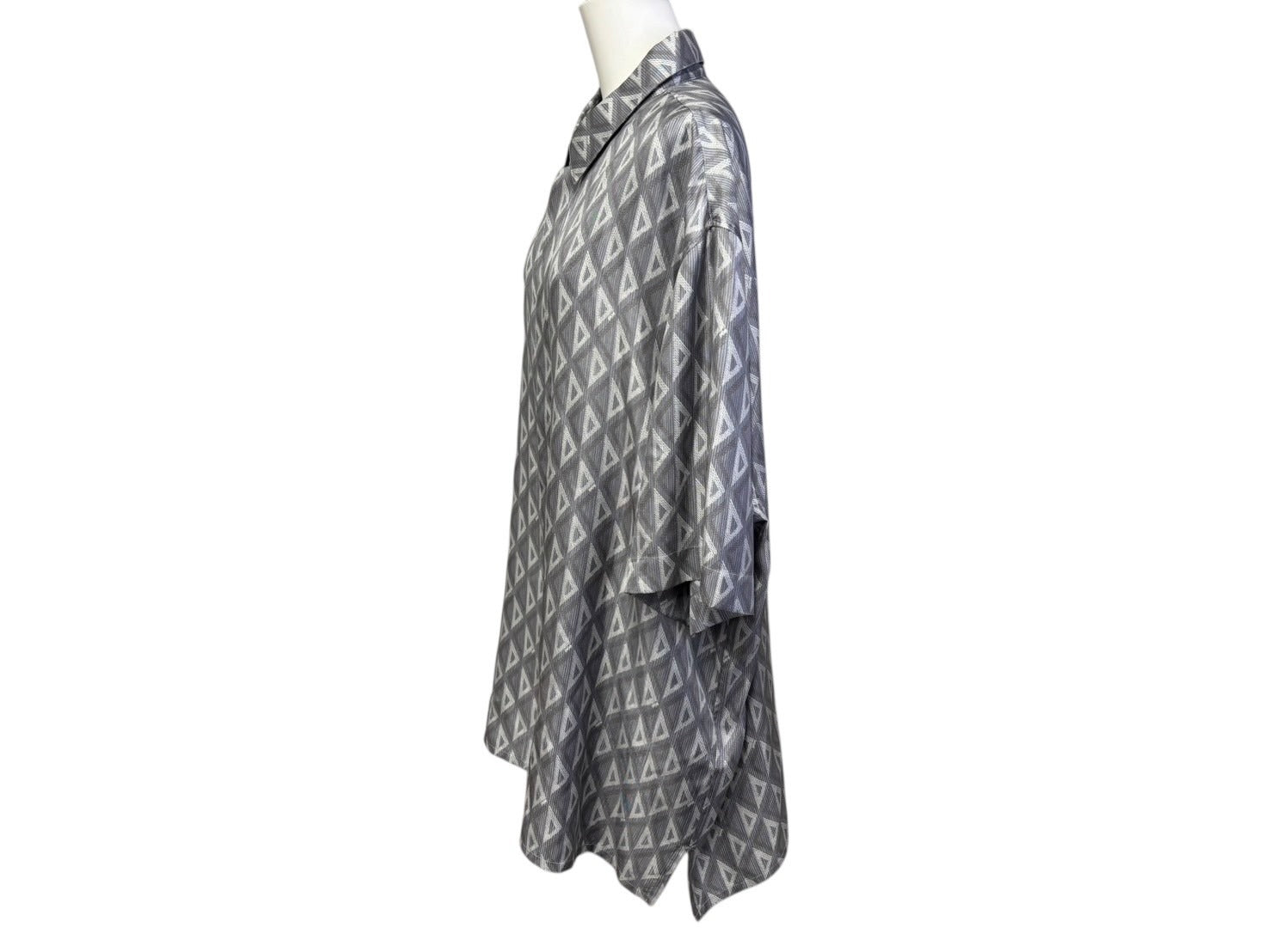 シルク素材の総柄デザインが目を惹く比翼ボタンシャツになります。