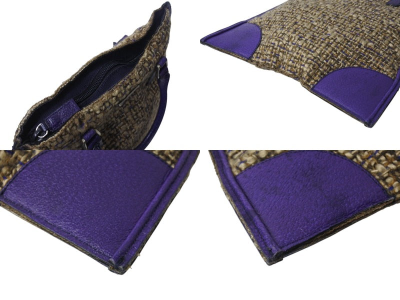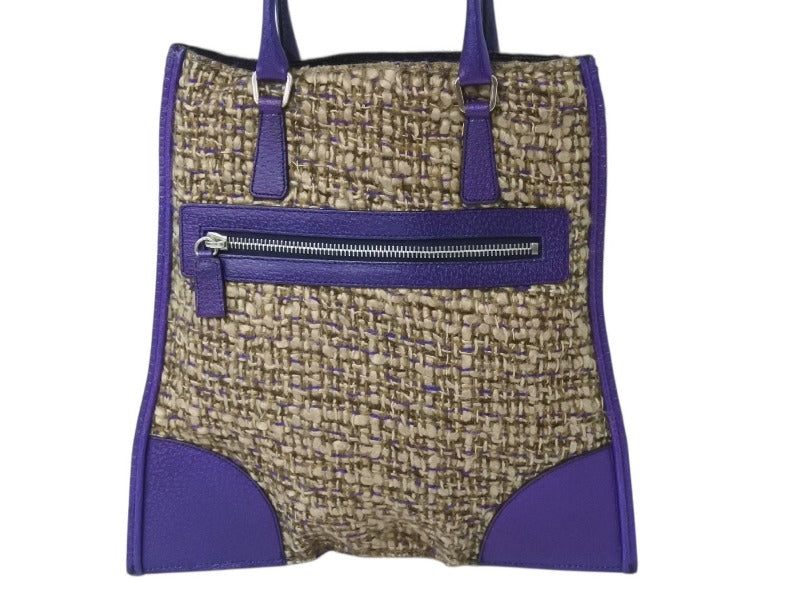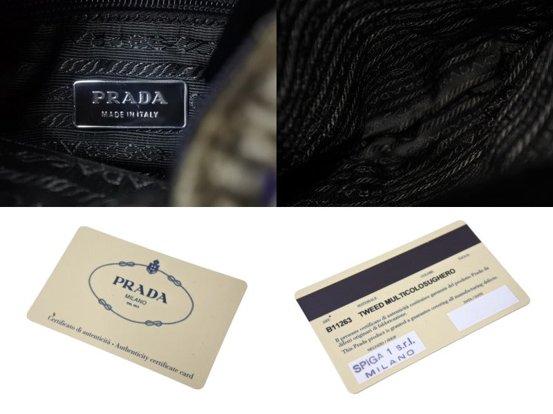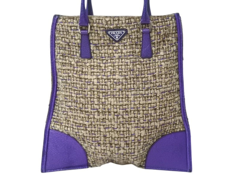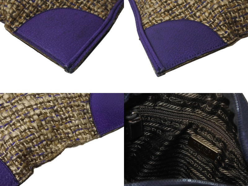 極美品 PRADA プラダ ツイード レザー ハンドバッグ ベージュ パープル トライアングルロゴ 手持ち 鞄 B11263 シルバー金具 中古 4b002883