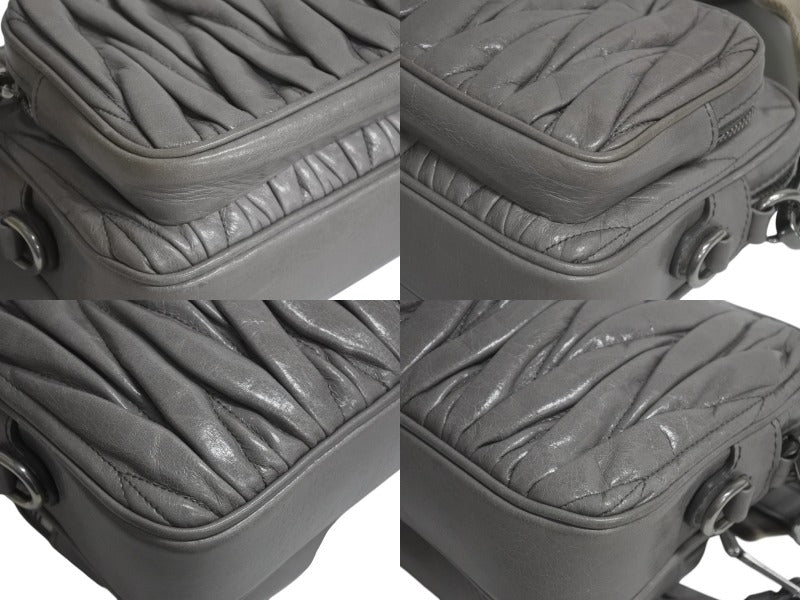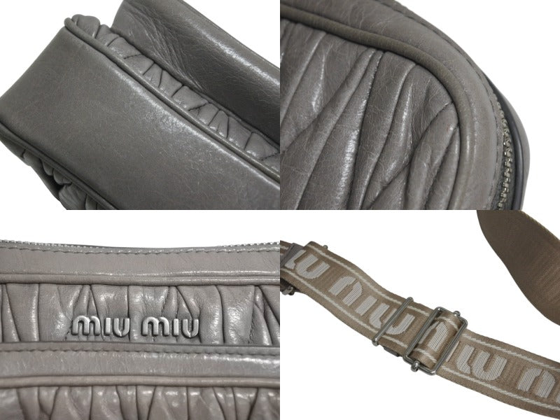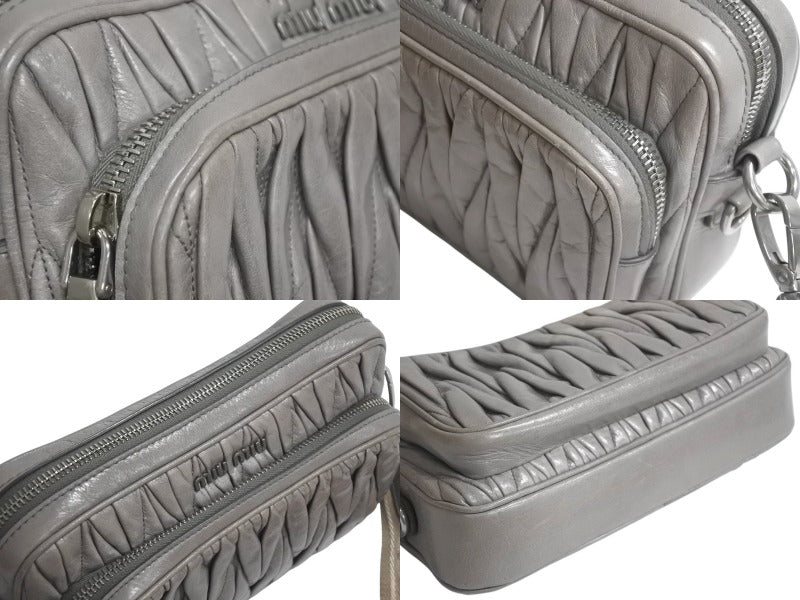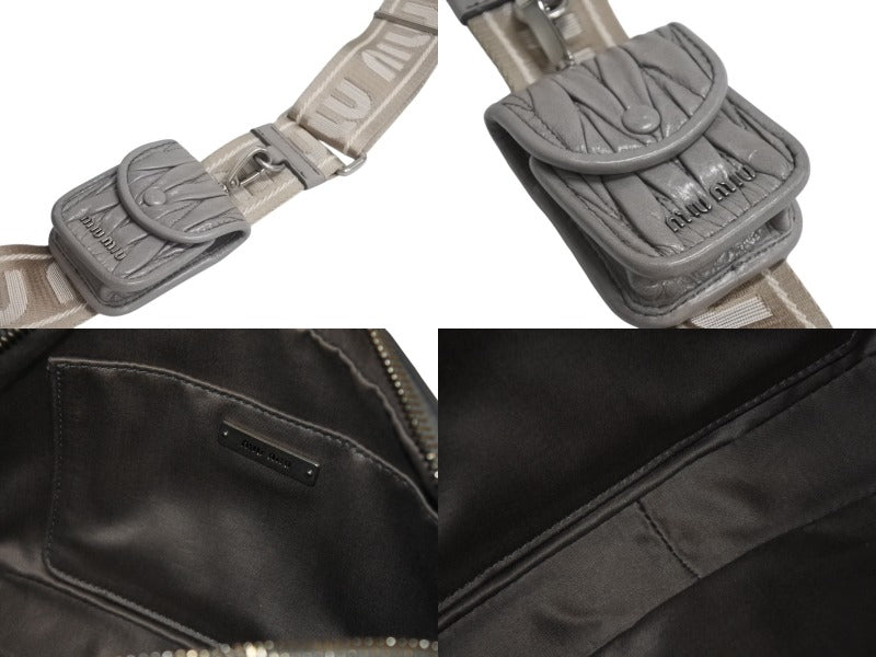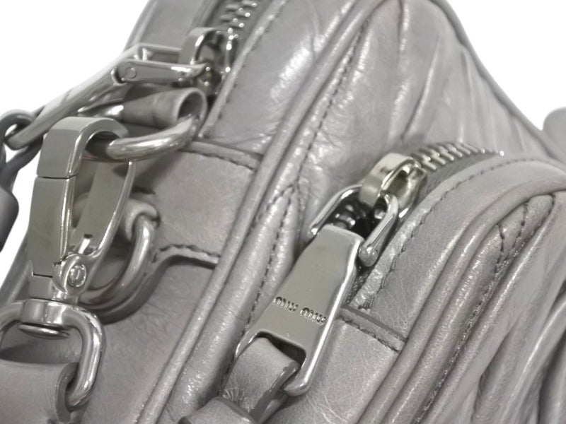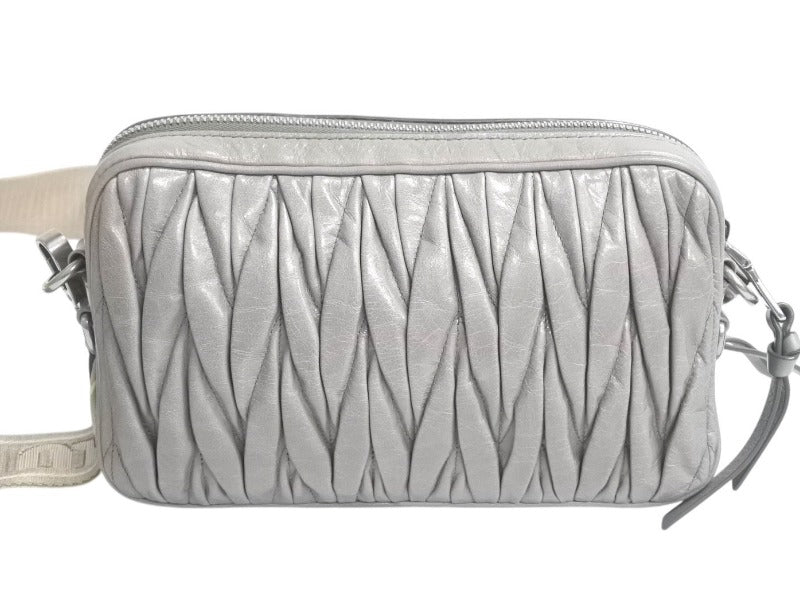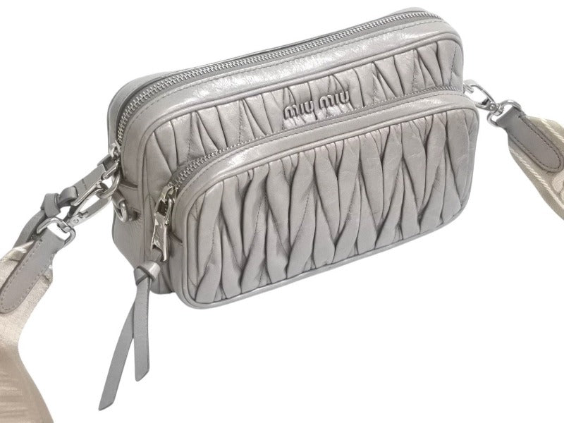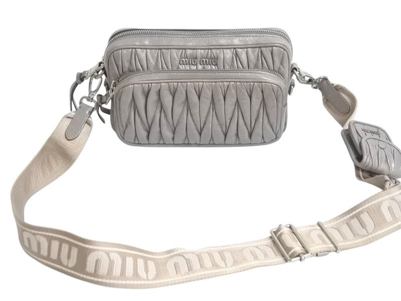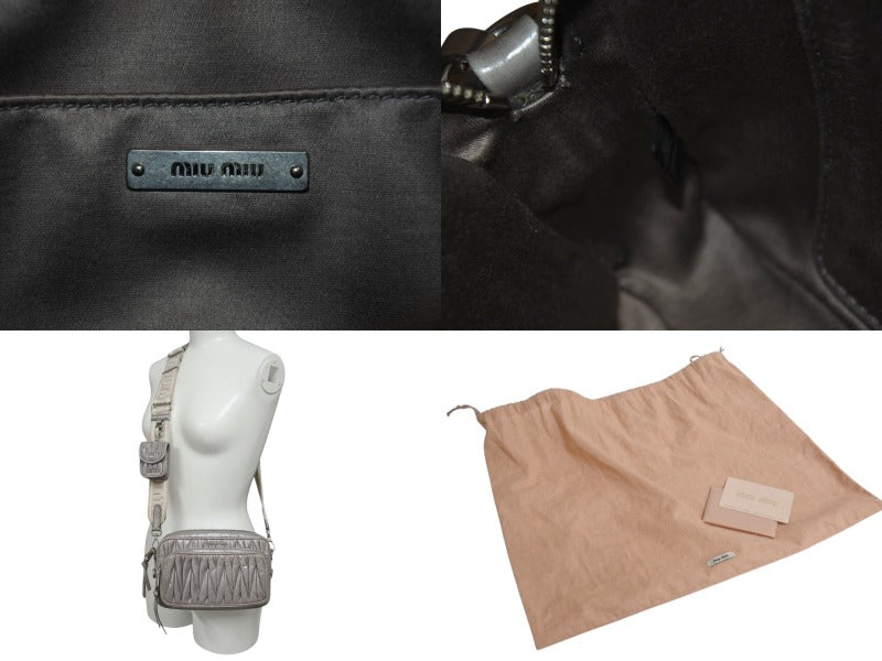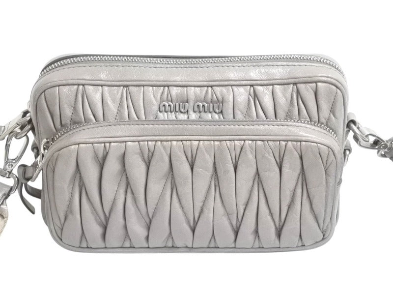 ミュウミュウを代表する上質なキルティングレザーにロゴ金具パーツがアクセントになったショルダーバッグです。
