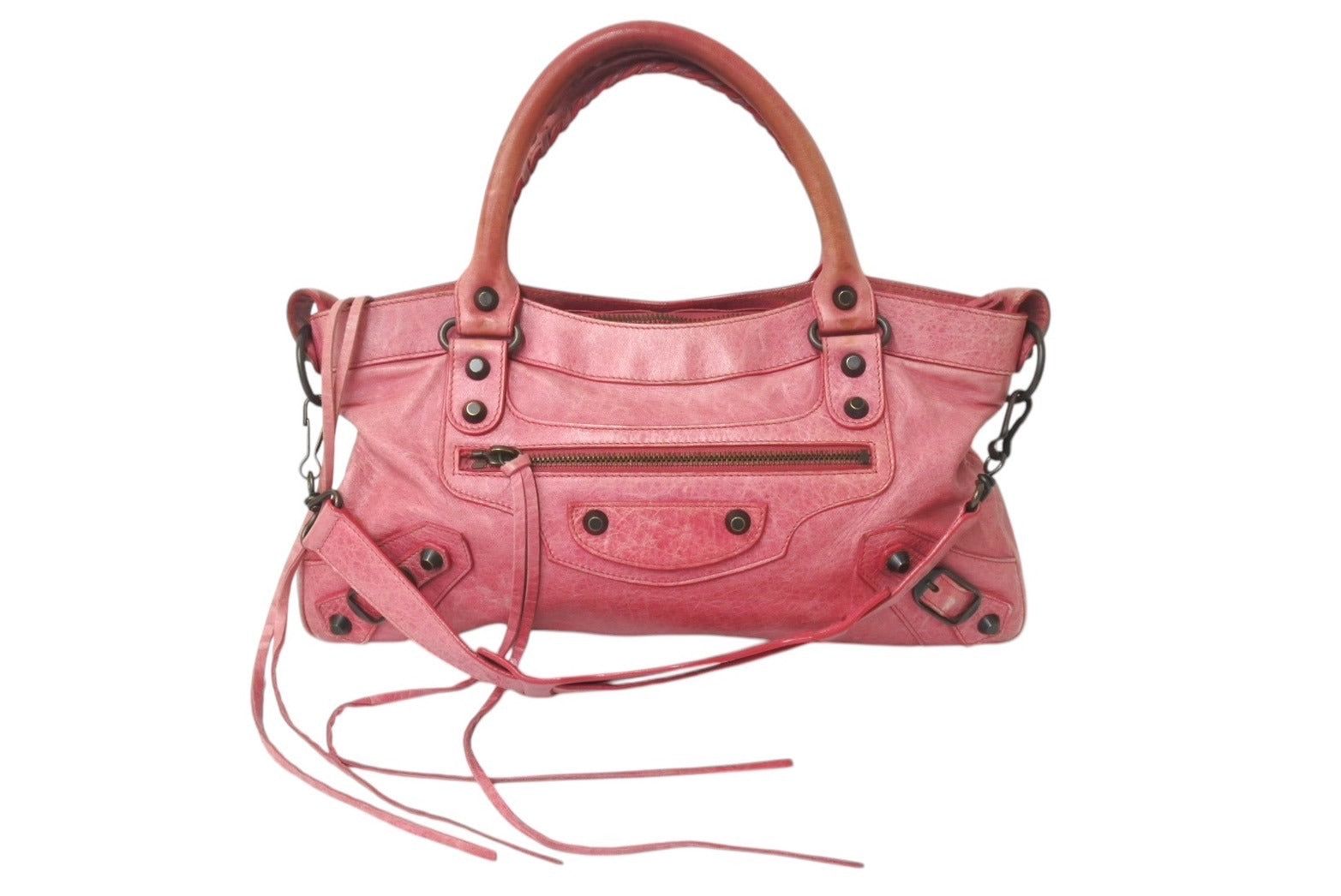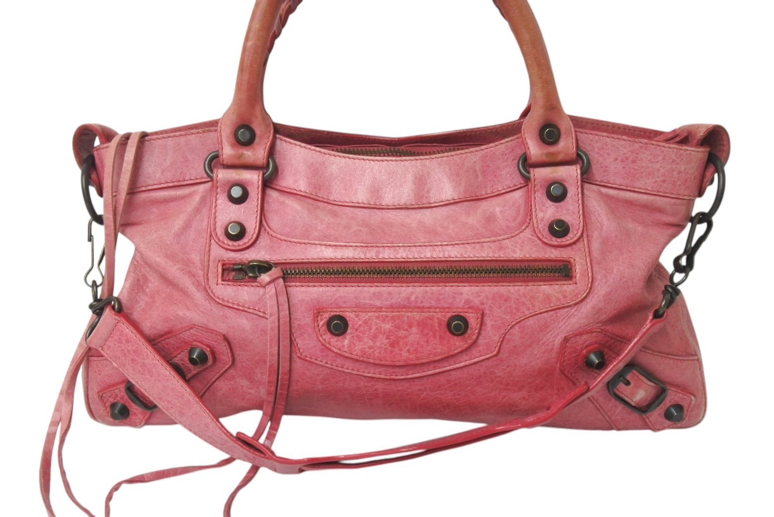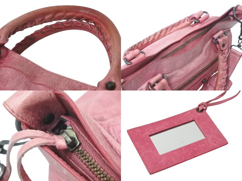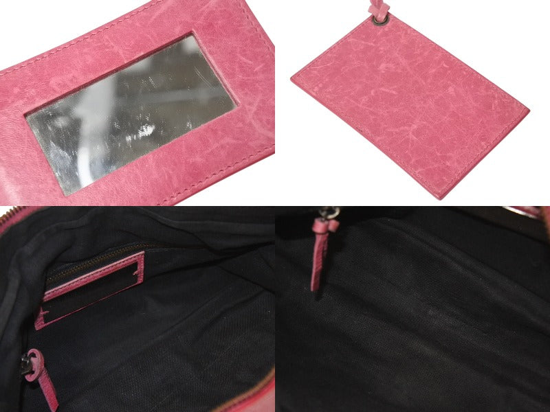 全体的にスレあり。ファスナー付近レザー部分汚れあり。ミラーに傷あり。ハンドル色褪せ、コバ割れあり。内側汚れ、使用感あり。