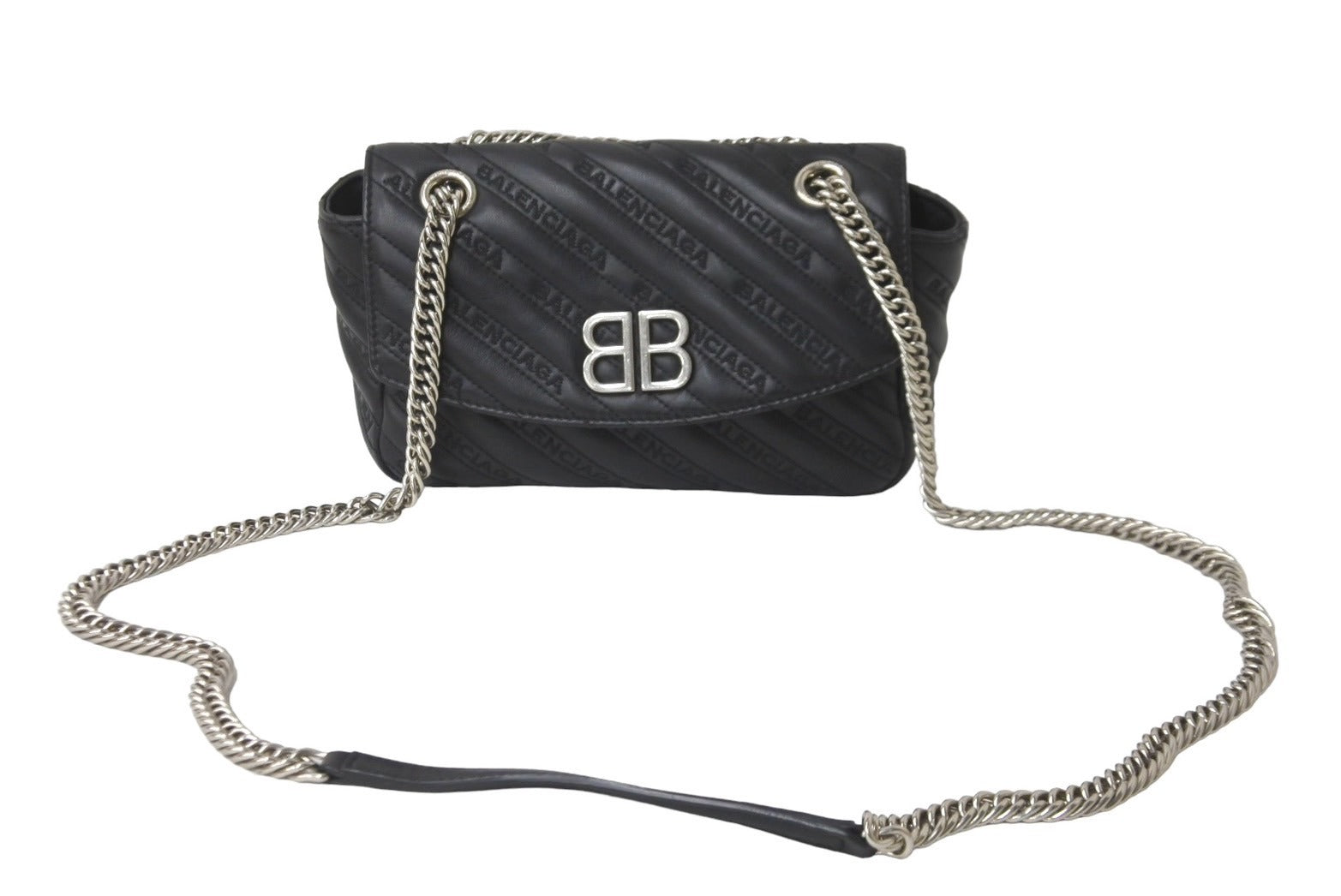 BALENCIAGA バレンシアガ Wチェーンショルダーバッグ 501684 BBラウンド ロゴ刺繍 キルティング レザー ブラック 美品 中古 62824