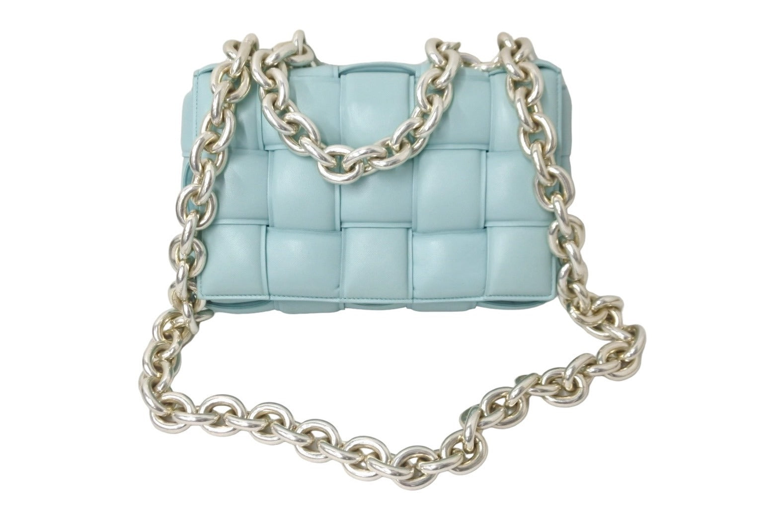 キャッチーなゴールドのチャンキーチェーンがあしらわれ、上質な幅広レザーを編み合わせた、パッド入りのもこもこしたマキシイントレチャートが目を引くアイコニックなバッグです。