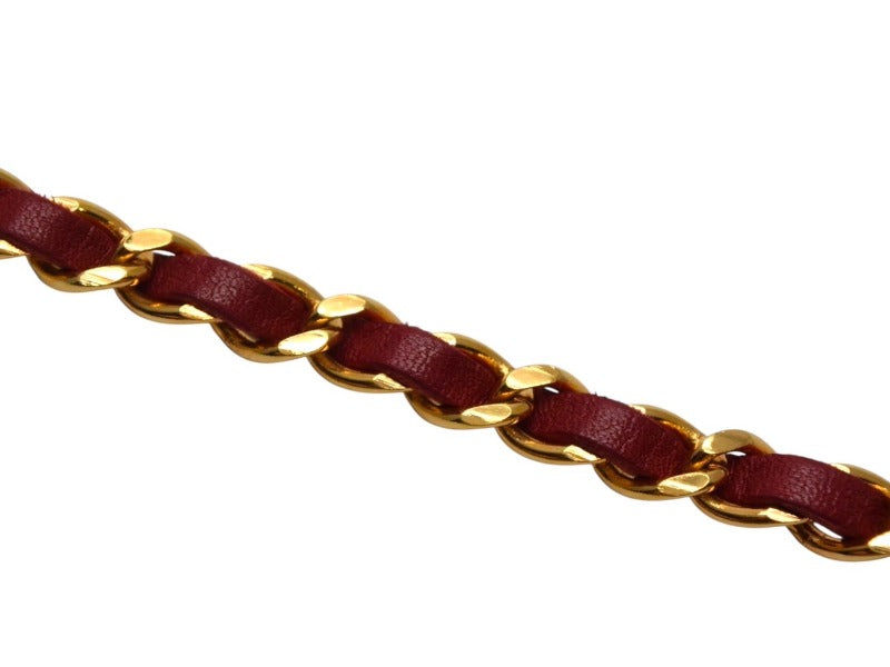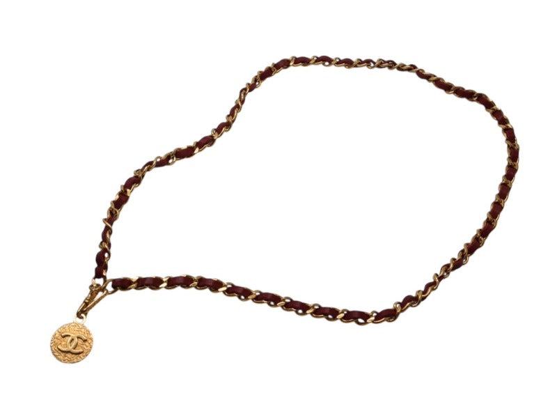 深みのある色のレザーと、ゴールドカラーのチェーンが絡み合ったチェーンベルトです。