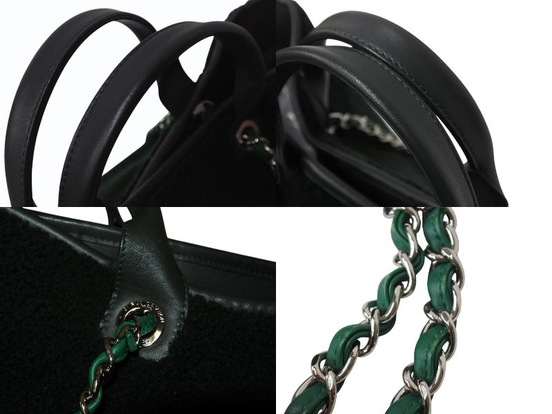 底面レザー、開口部パイピング、ハンドル、チェーンショルダーレザーにスレあり。金具に少々スレ、小傷あり。角スレあり。表面ボアに少々の毛玉あり。内側少々スレ、汚れあり。その他使用感の少ない状態です。